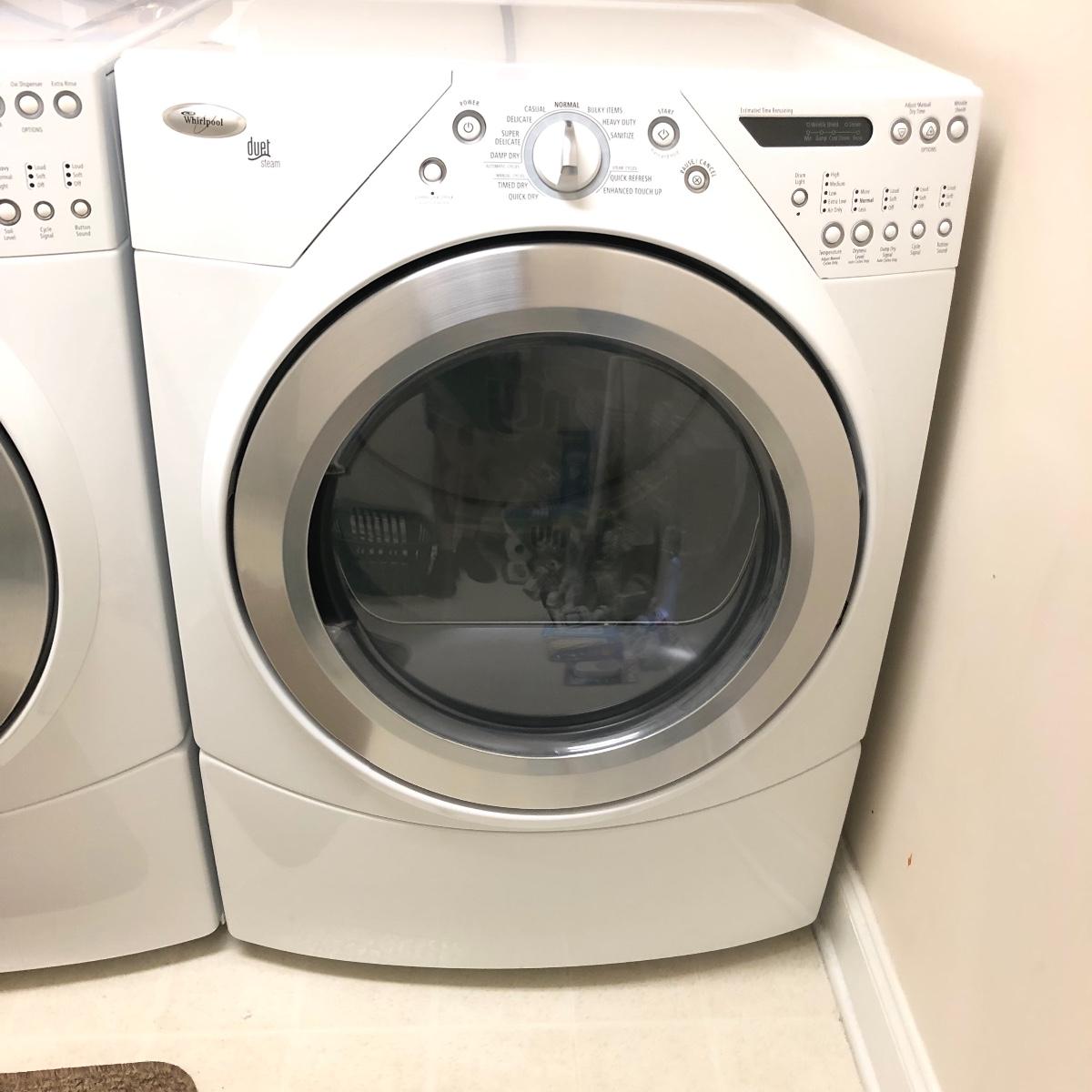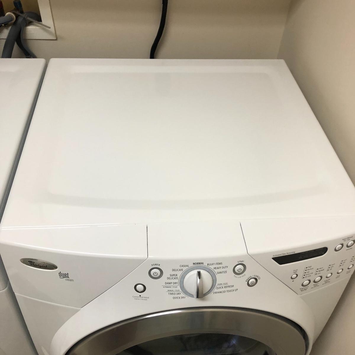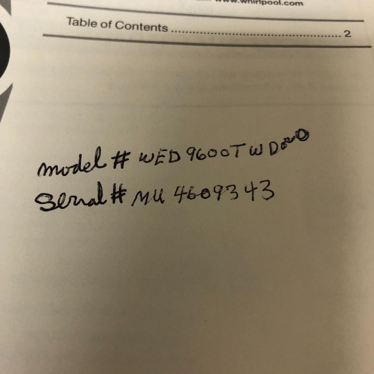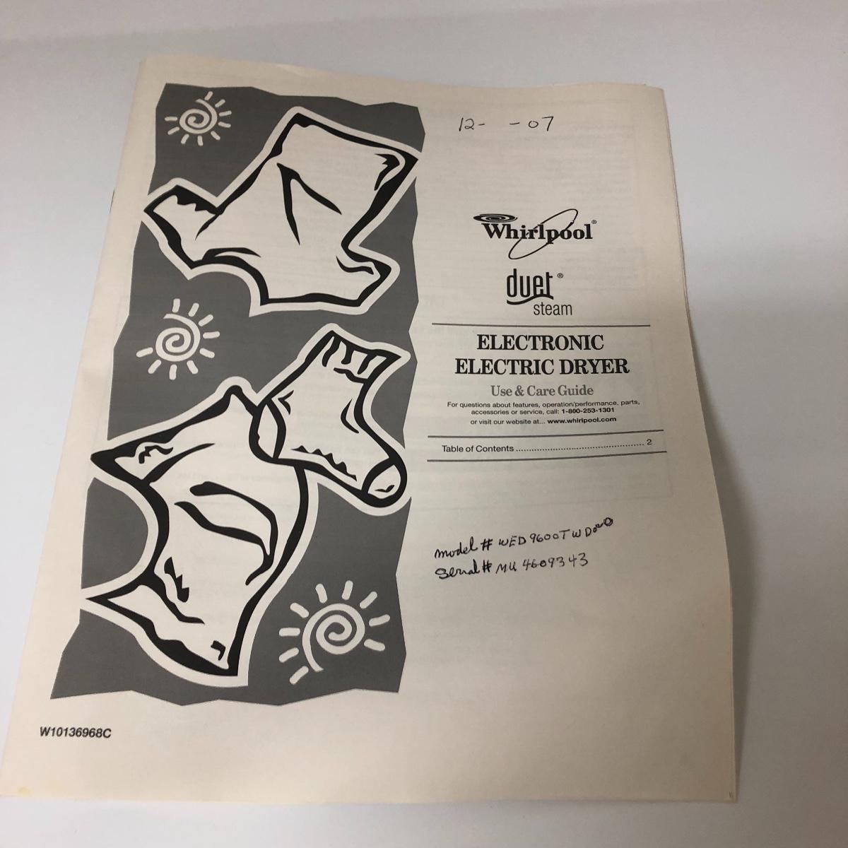 This Whirlpool dryer is in super clean, well cared for condition and we did test it with a large load of wet linens and it works great. Model number was not found but previous owner did hand write on the accompanying manual. Matching washing machine in the next lot.