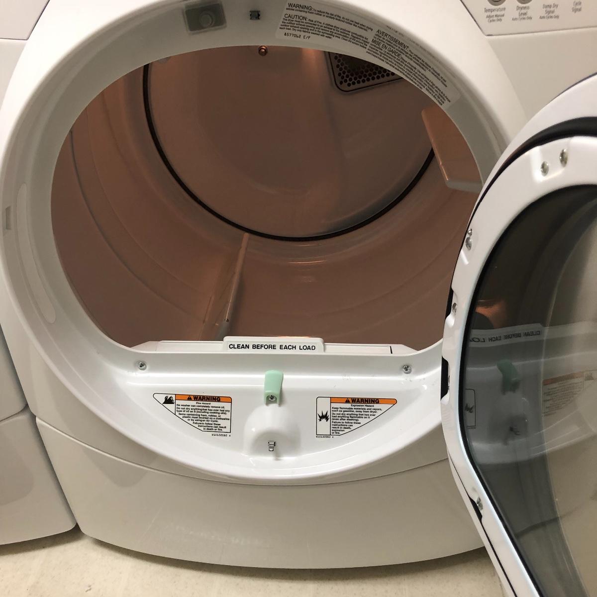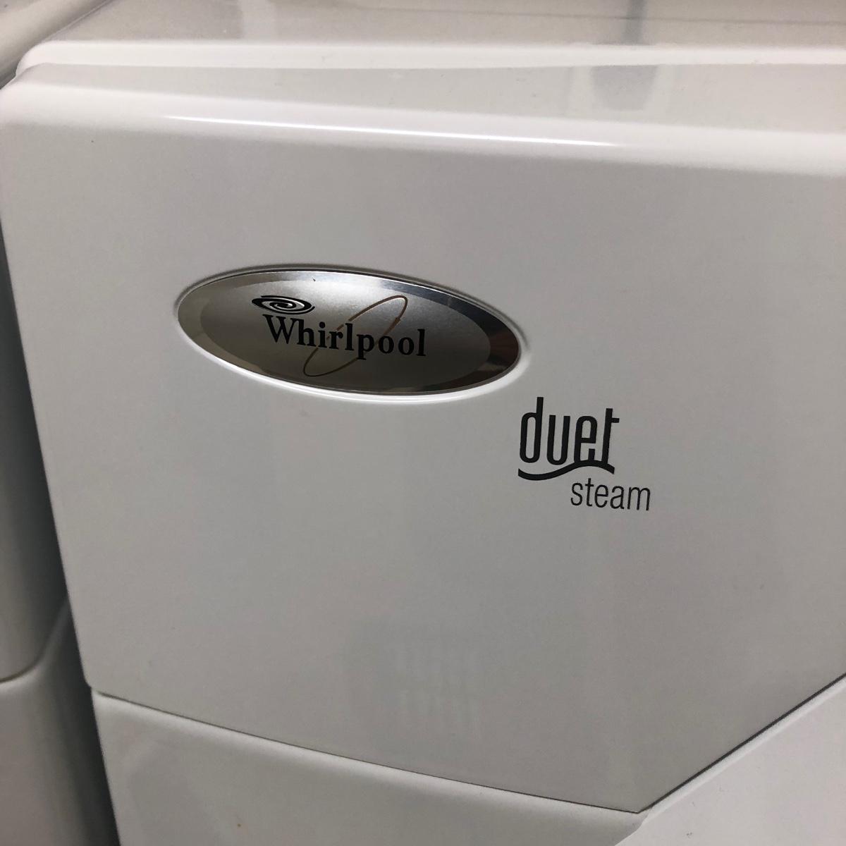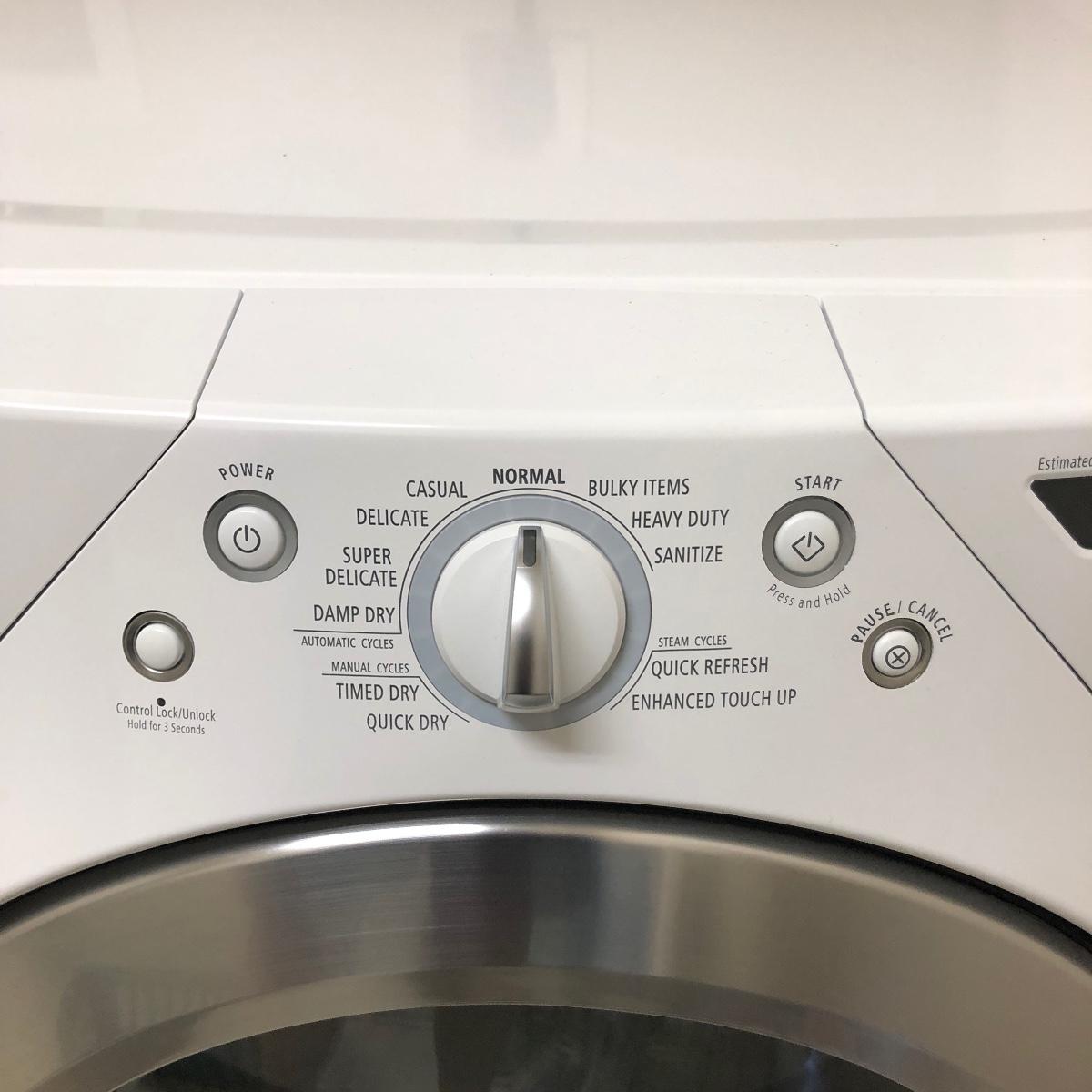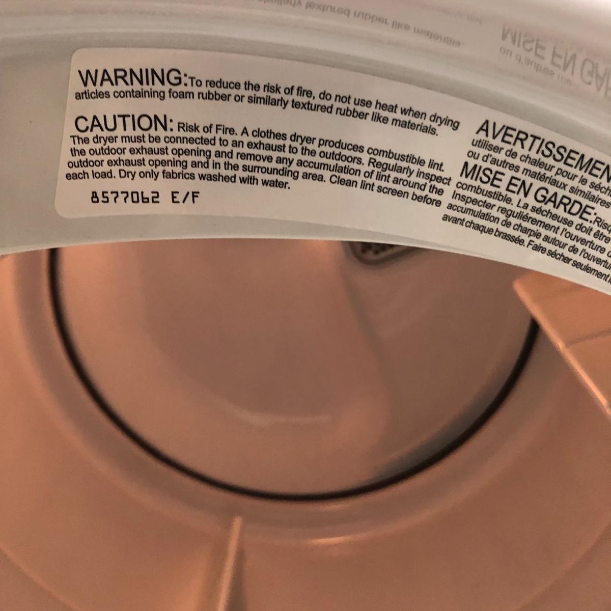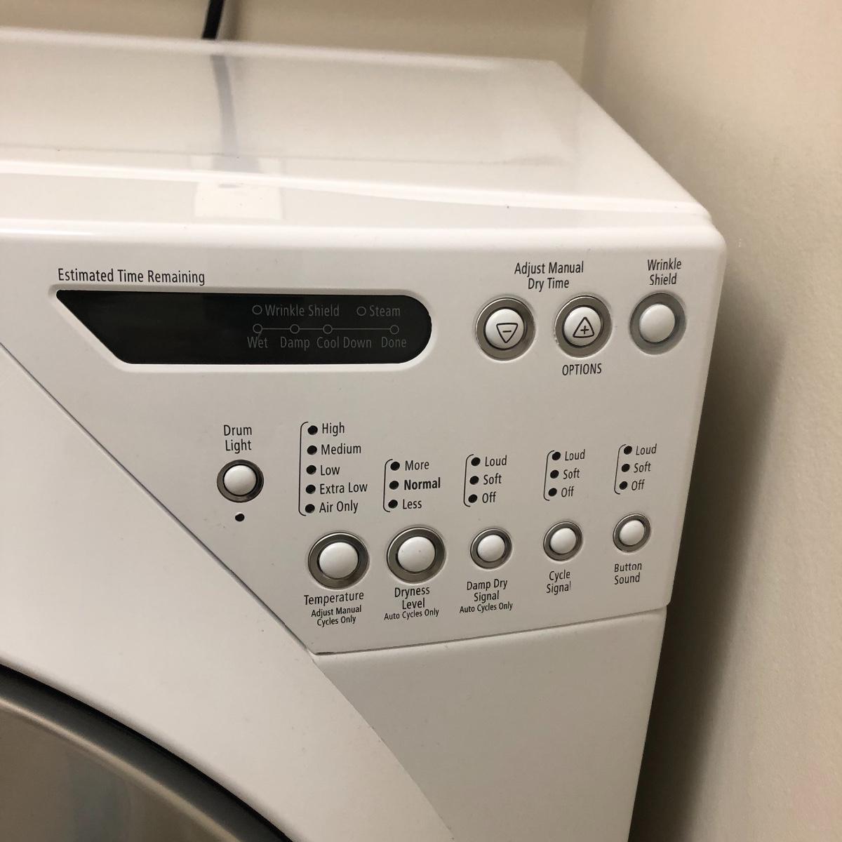 This Whirlpool dryer is in super clean, well cared for condition and we did test it with a large load of wet linens and it works great. Model number was not found but previous owner did hand write on the accompanying manual. Matching washing machine in the next lot.