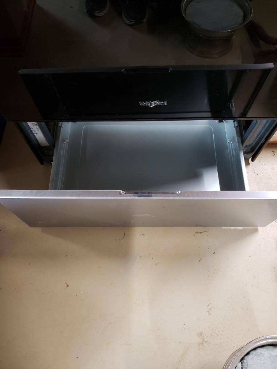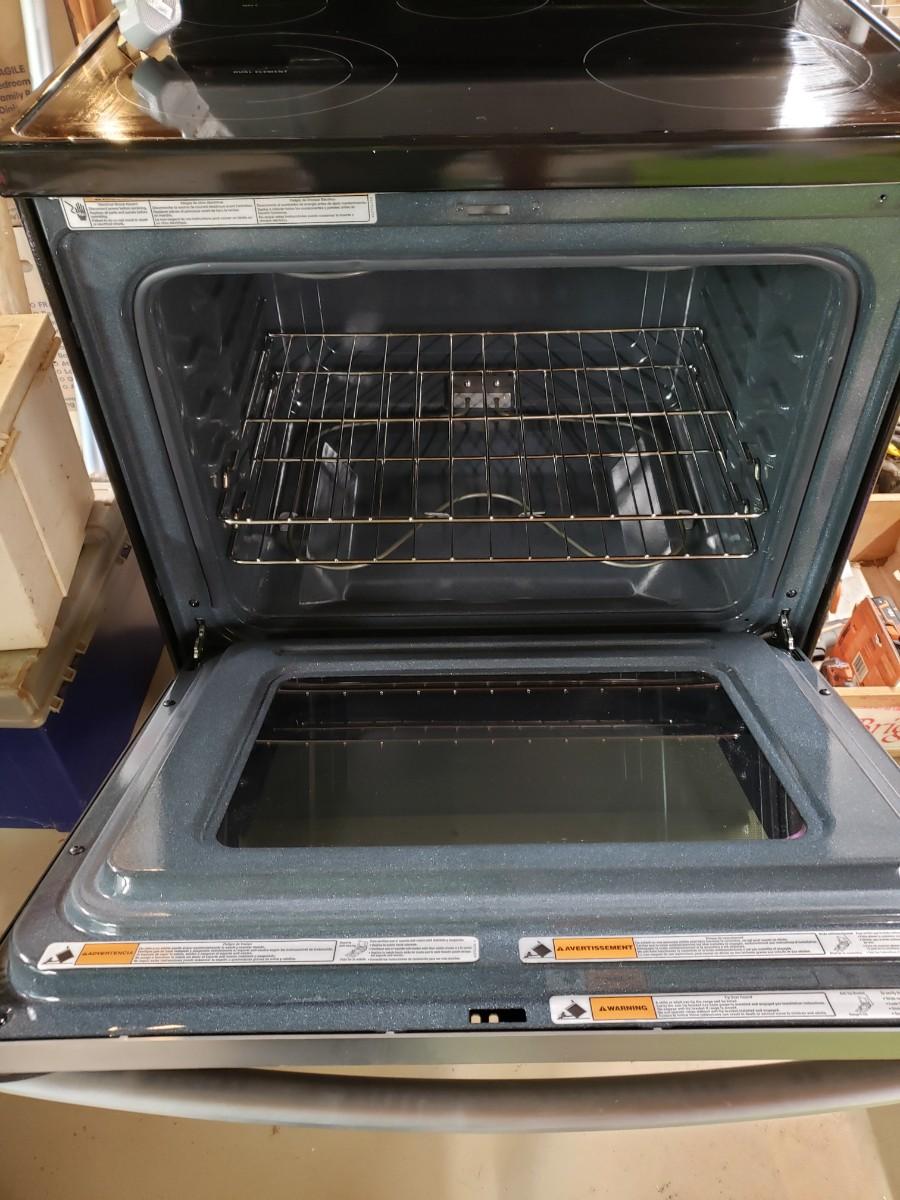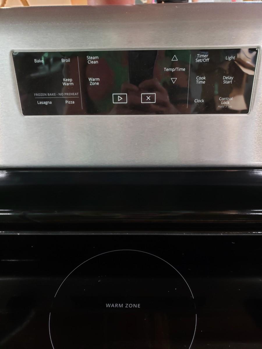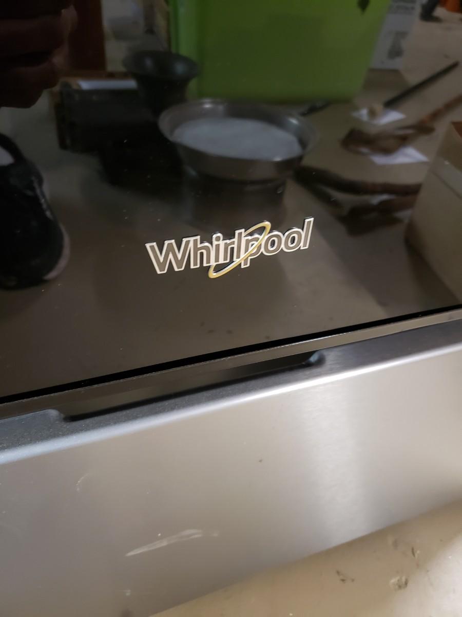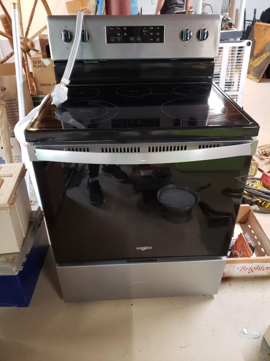 This appears to be a brand new Whirlpool electric oven. The model number appears to be W11027374. There are 4 glass top burners with a smaller warmer burner in the middle. It has a touch screen for the oven and knobs for the burners. The oven contains two wire racks. It was not tested as there was not the right outlet in its location. Local pick up only.