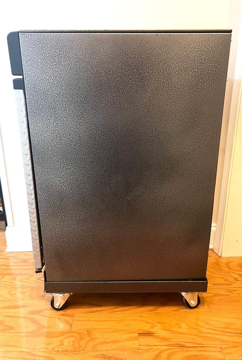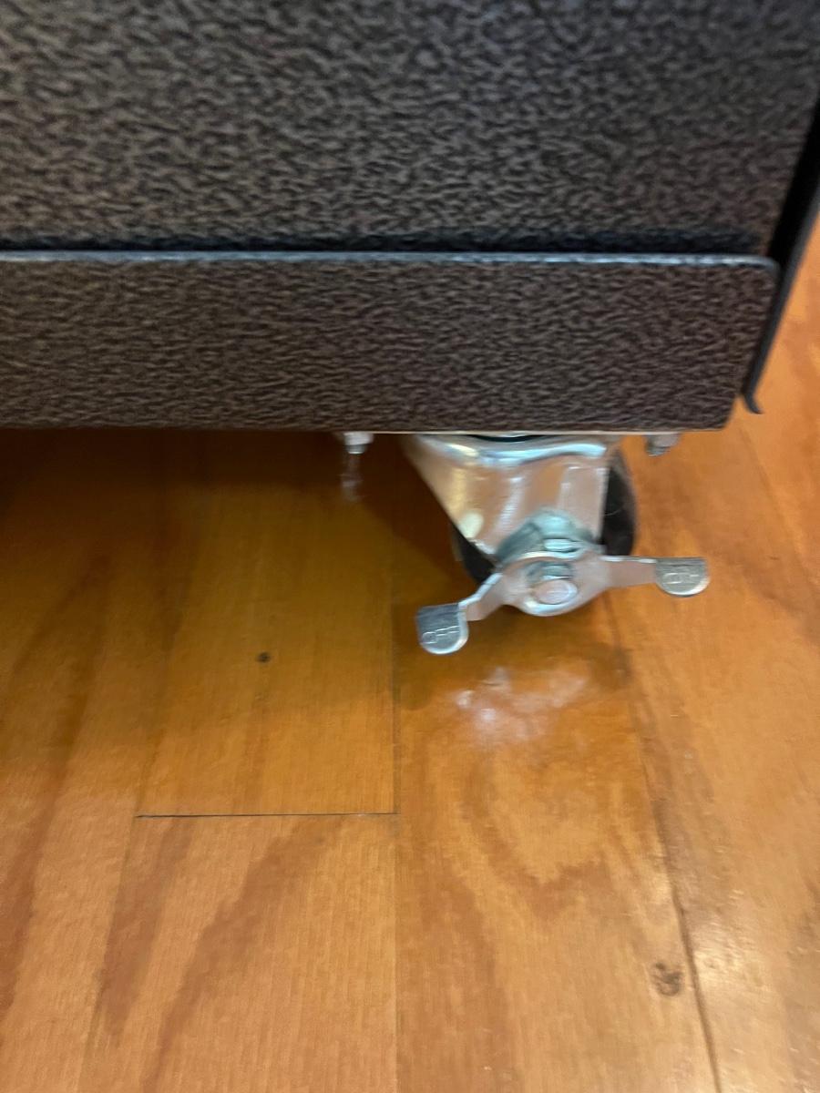With lockable casters. Measures 38 1/2 inches tall, 15 inches wide and 24 inches deep.