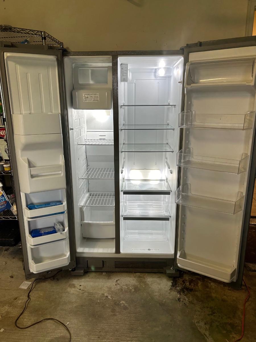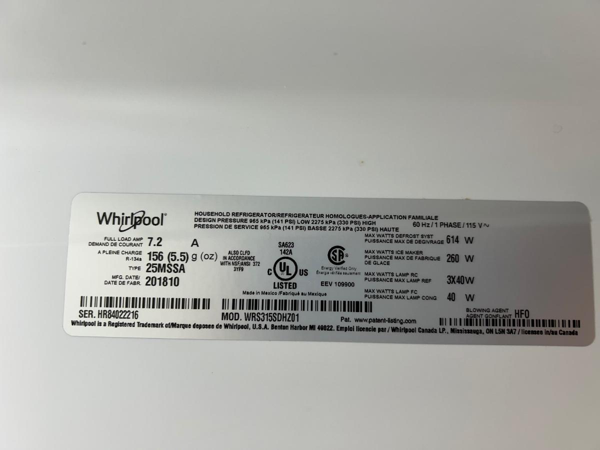 Whirlpool side-by-side refrigerator/freezer with icemaker, stainless steel. Ice maker and water is not hooked up to water but our client said it works. Model #WRS315SDHZ01