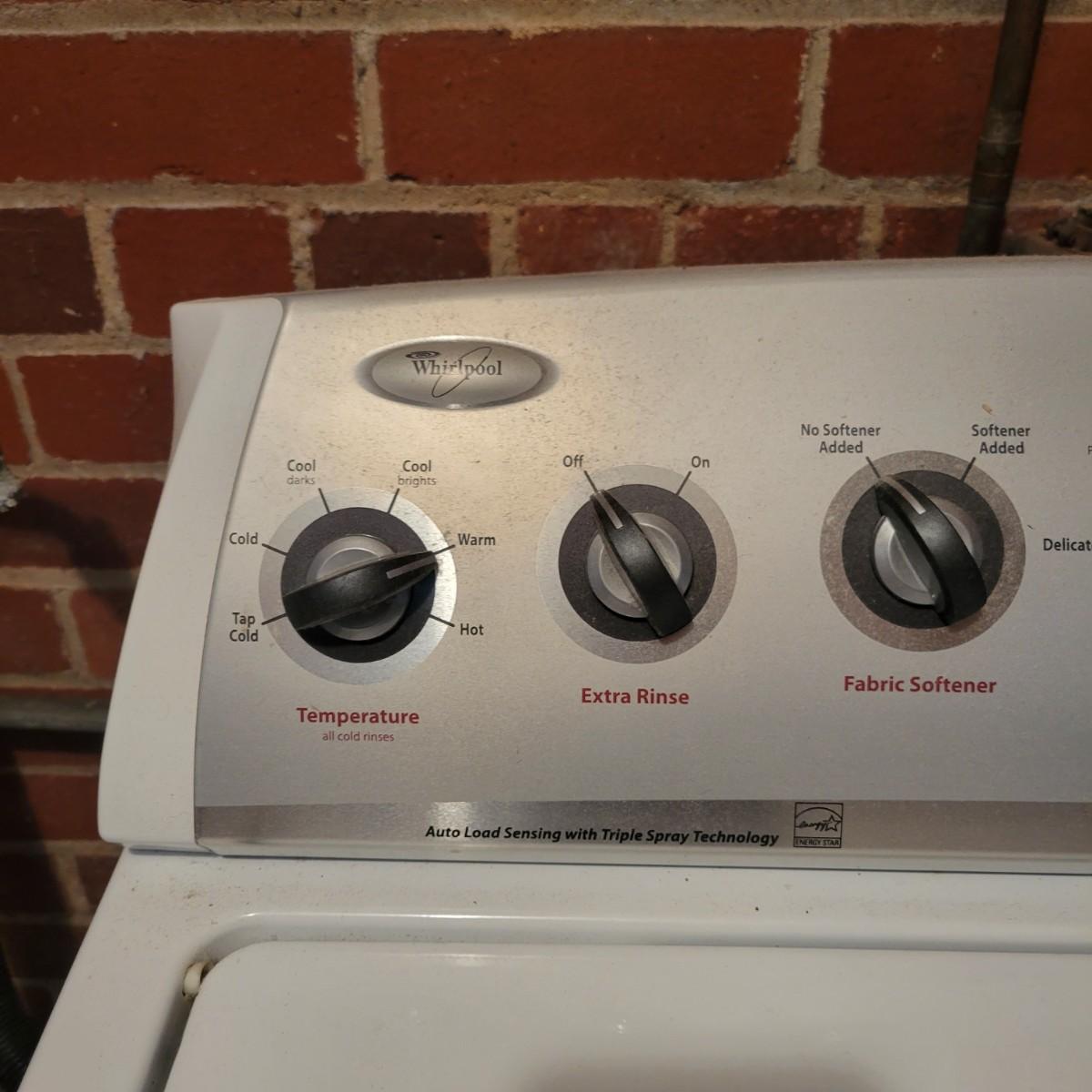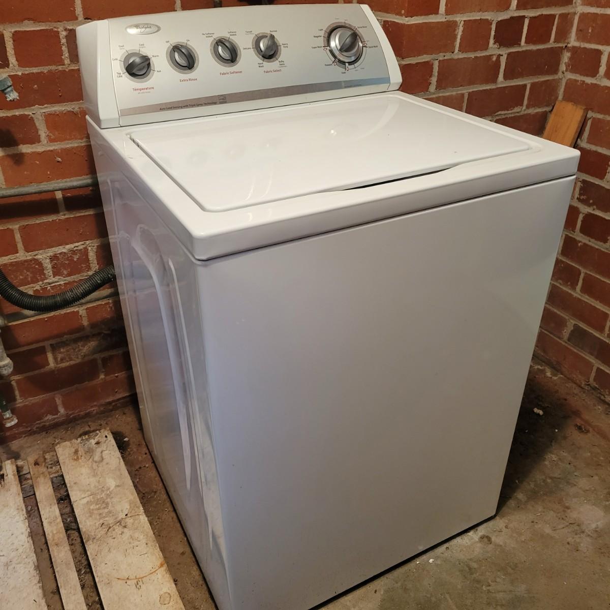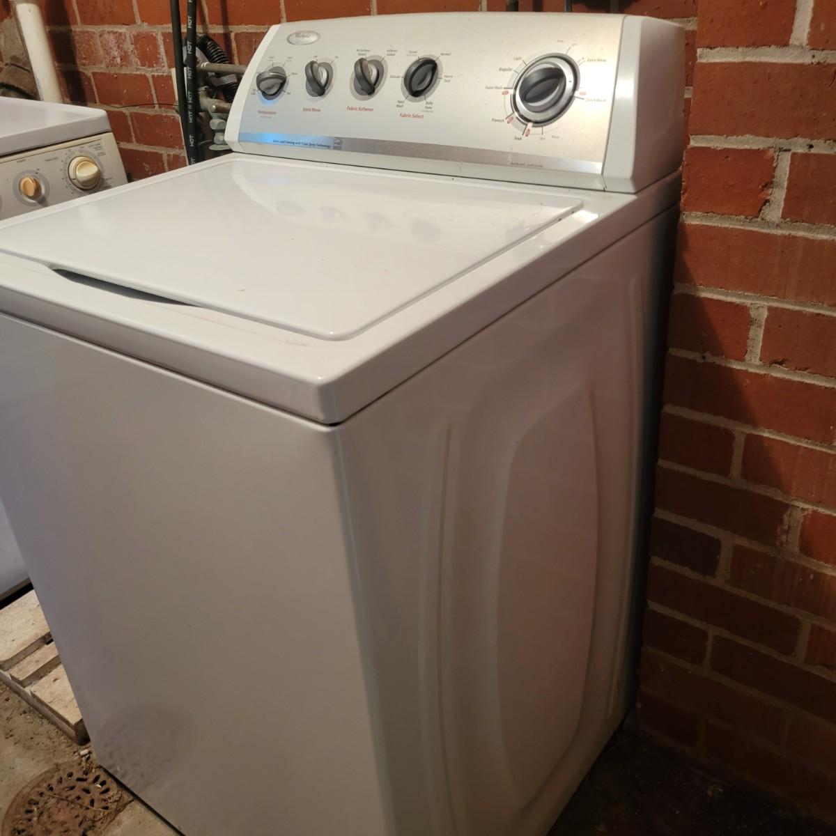 A Whirlpool washing machine that is in good condition and was tested and works. No notable damage. Has auto load detection with triple spray technology. Measures approximately 27" x 25.5" x 43". Local pickup only. Winning bidder will need to move washing machine up 5 stairs to the driveway. Bringing assistance is highly recommended.