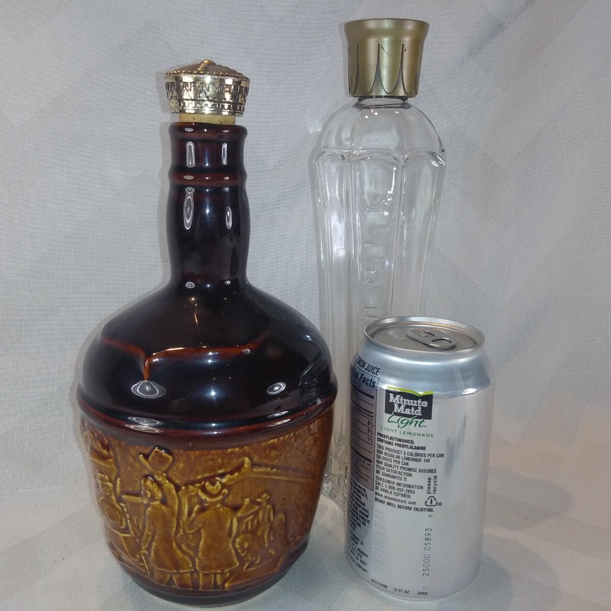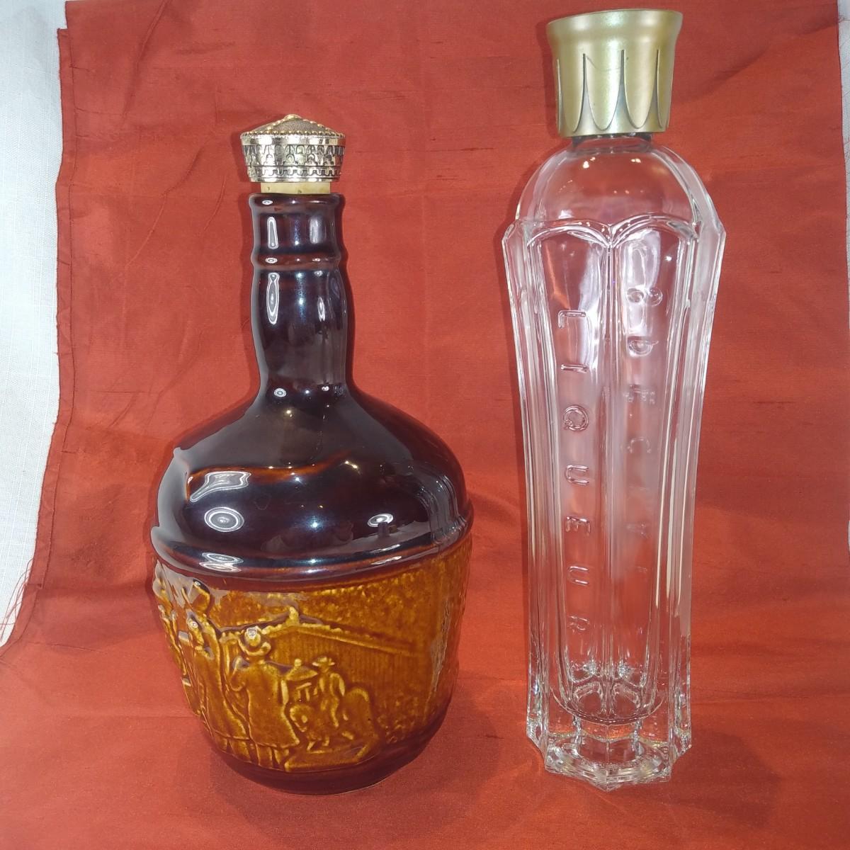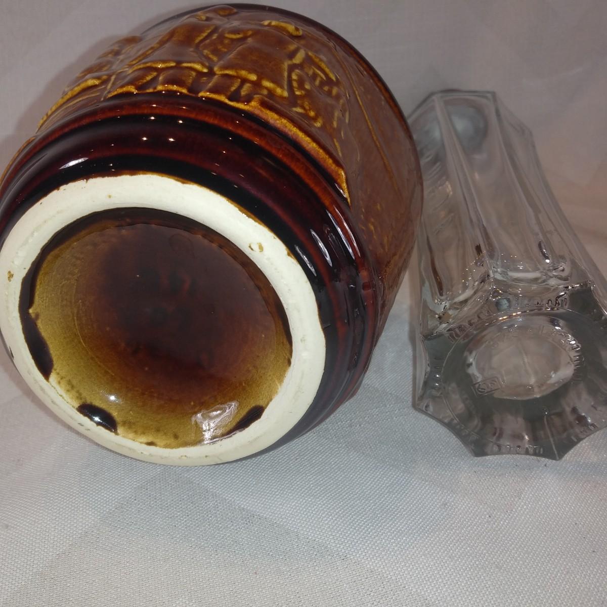 This auction lot is a Whiskey Bottle Pair. The brown ceramic bottle is unmarked but is very nicely adorned with a raised scene going around the bottle. The glass bottle has raised lettering stating Special Liqueur. There is wording on the bottle but we cannot make it out. Both are in very good condition and ready to fill with your private selection.