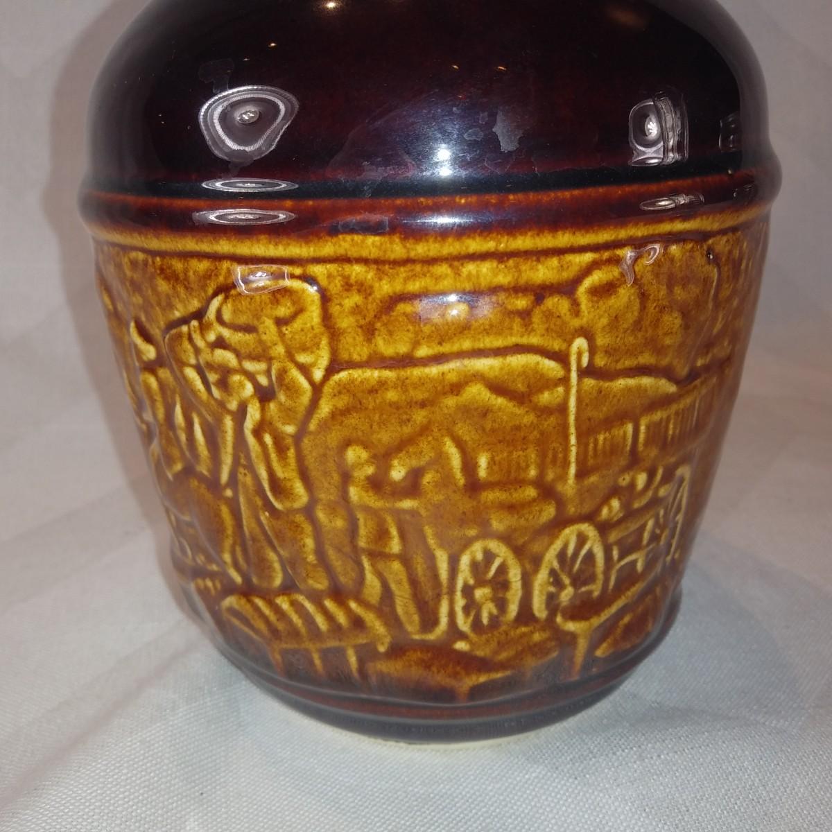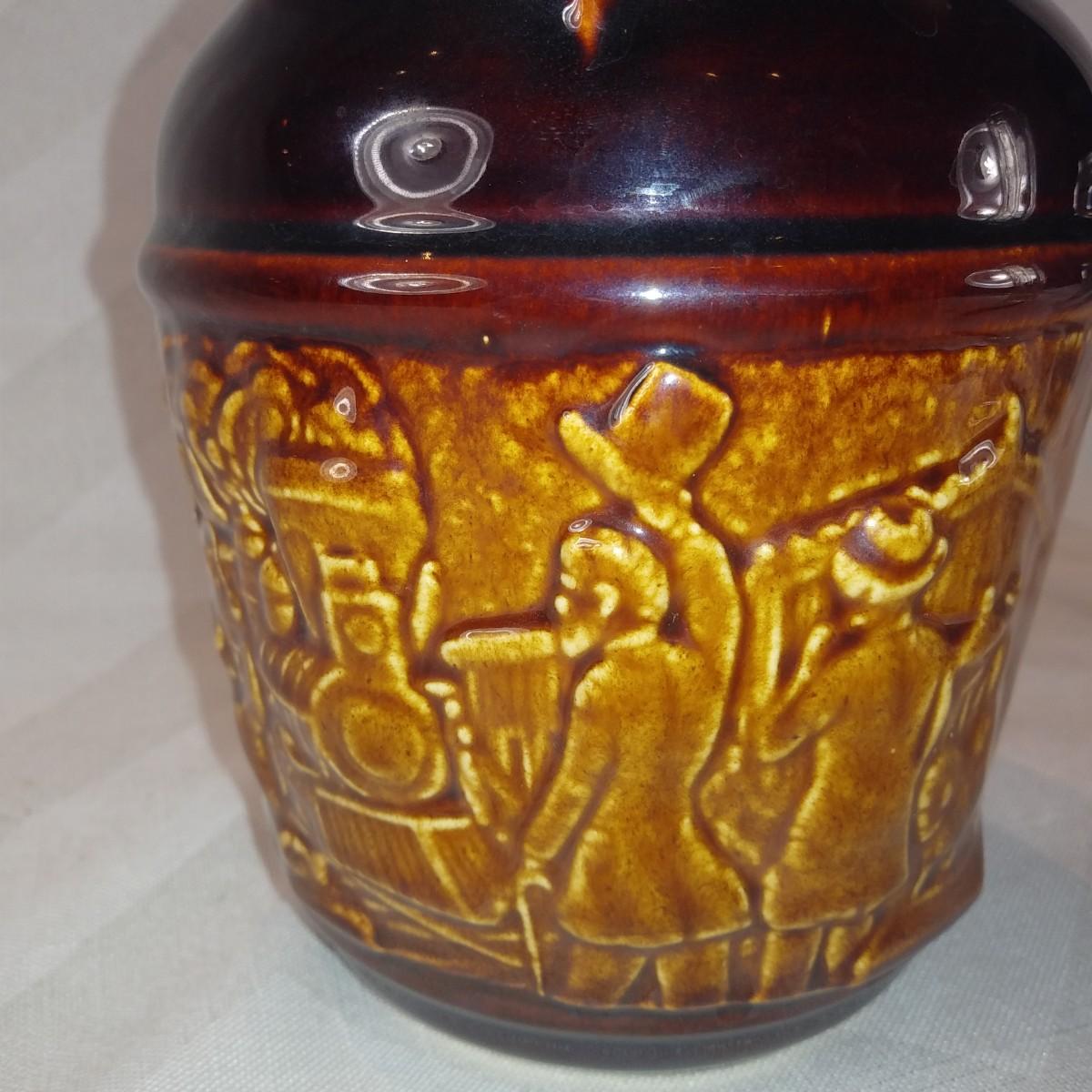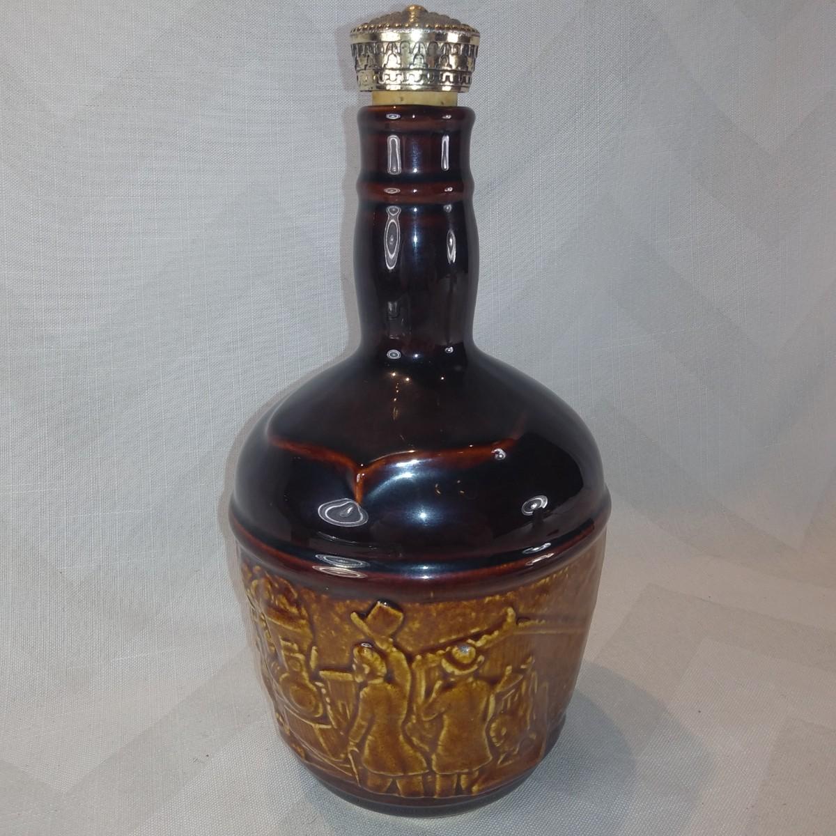 This auction lot is a Whiskey Bottle Pair. The brown ceramic bottle is unmarked but is very nicely adorned with a raised scene going around the bottle. The glass bottle has raised lettering stating Special Liqueur. There is wording on the bottle but we cannot make it out. Both are in very good condition and ready to fill with your private selection.