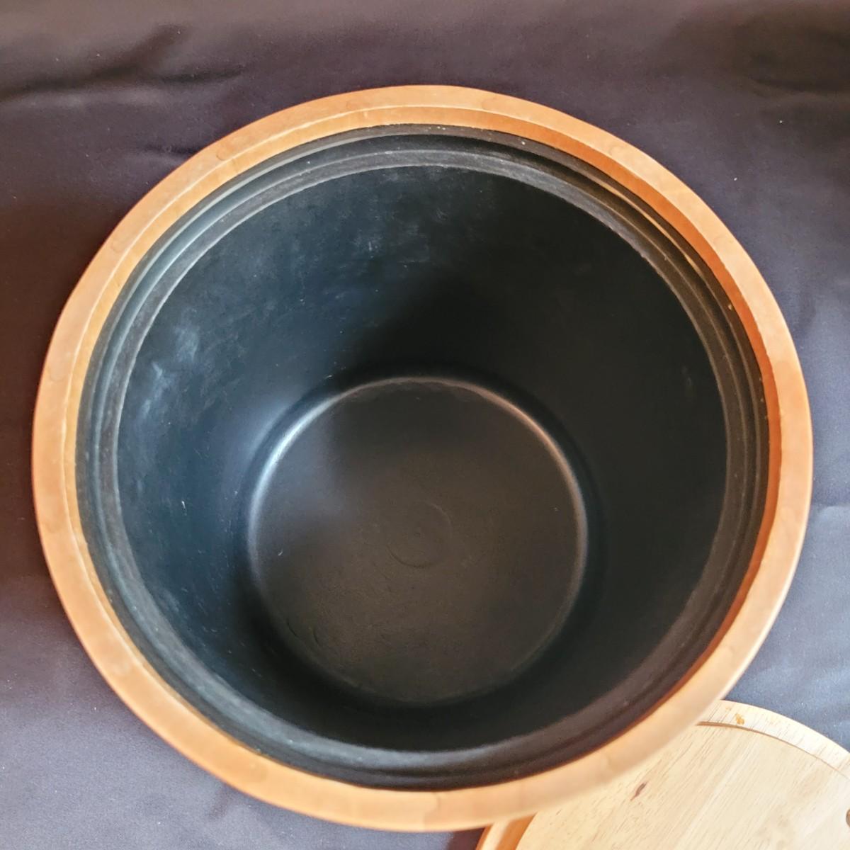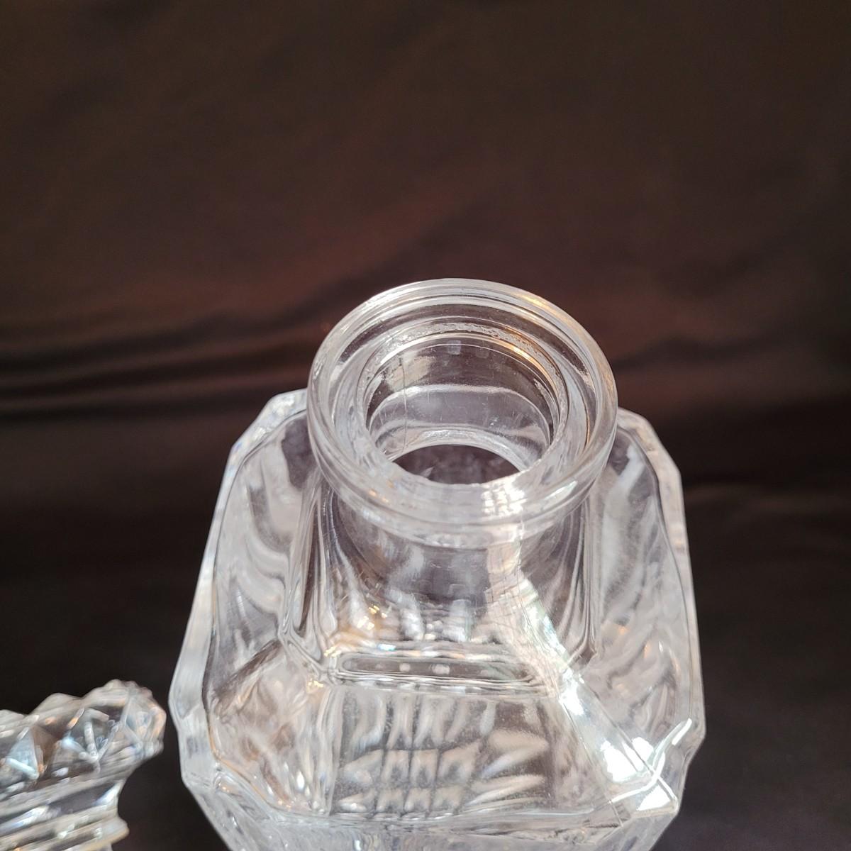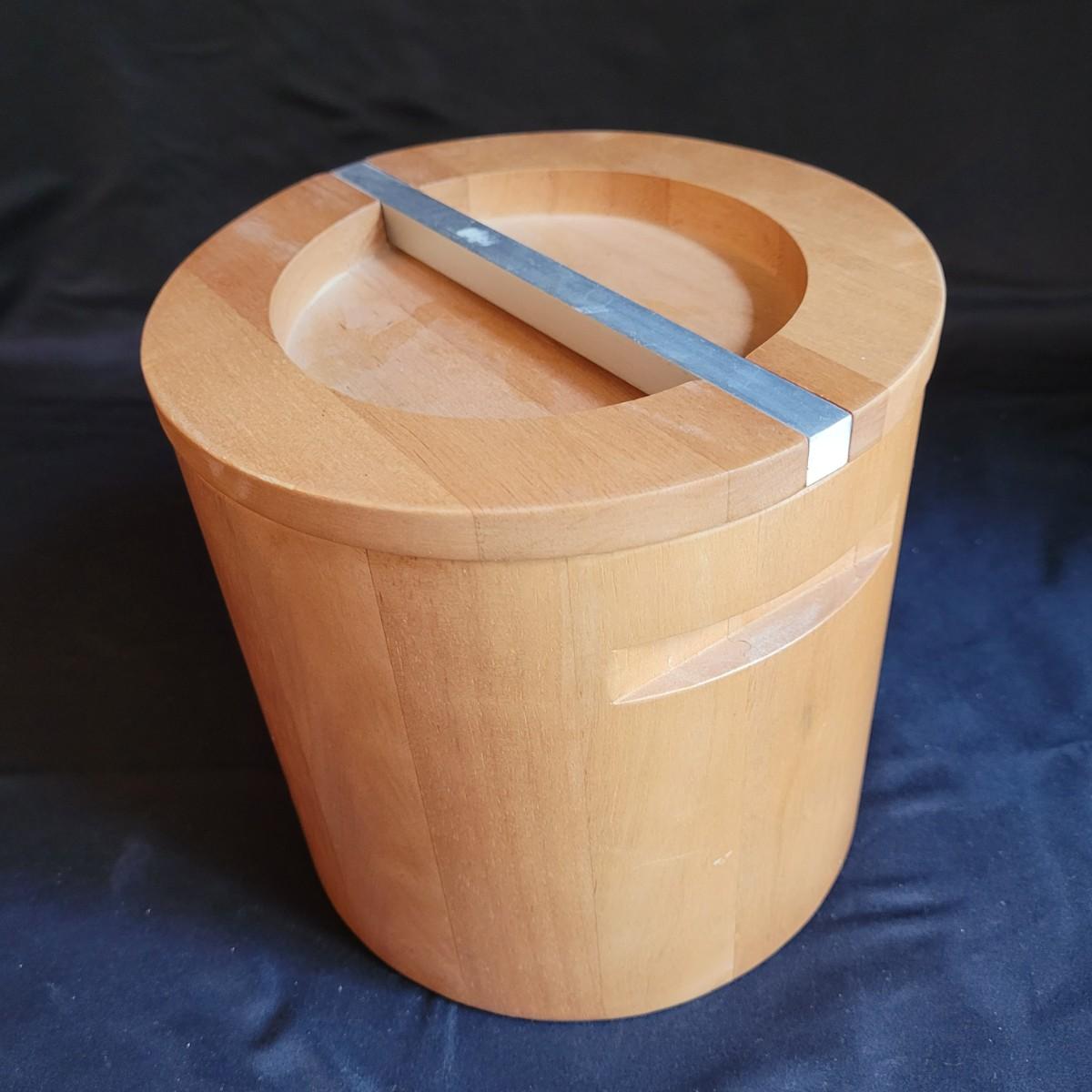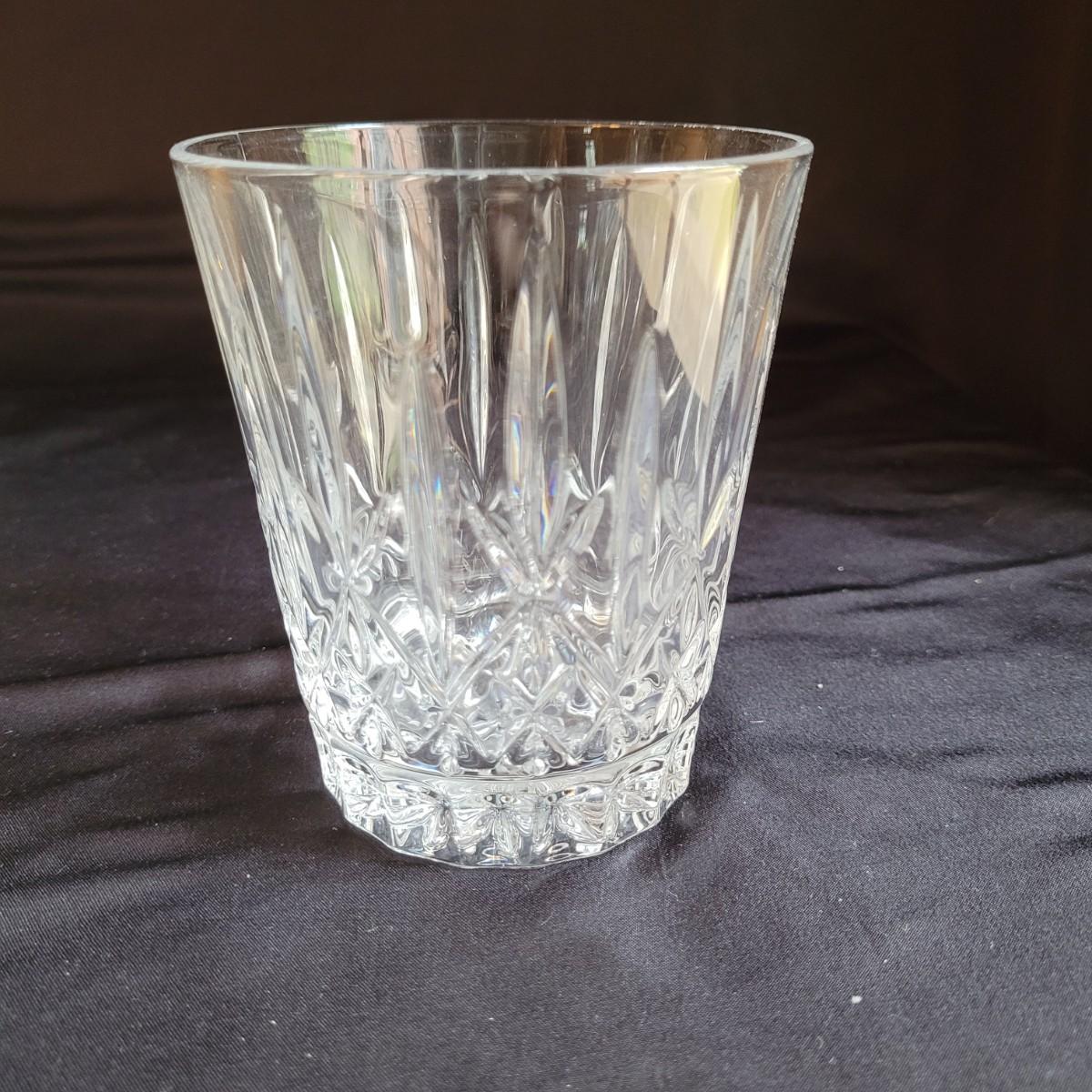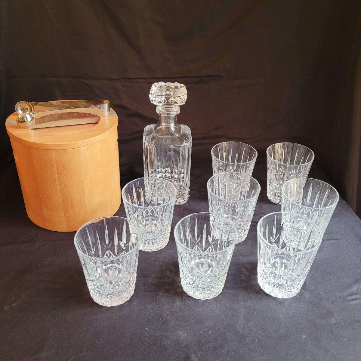 This heavy cut glass whiskey decanter comes with eight rocks glasses and a wooden ice bucket with tongs. Bucket measures approximately 8”DIA x 7.5”H. Shipping available.