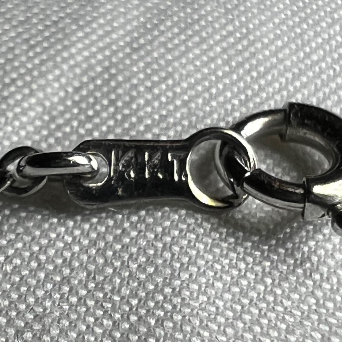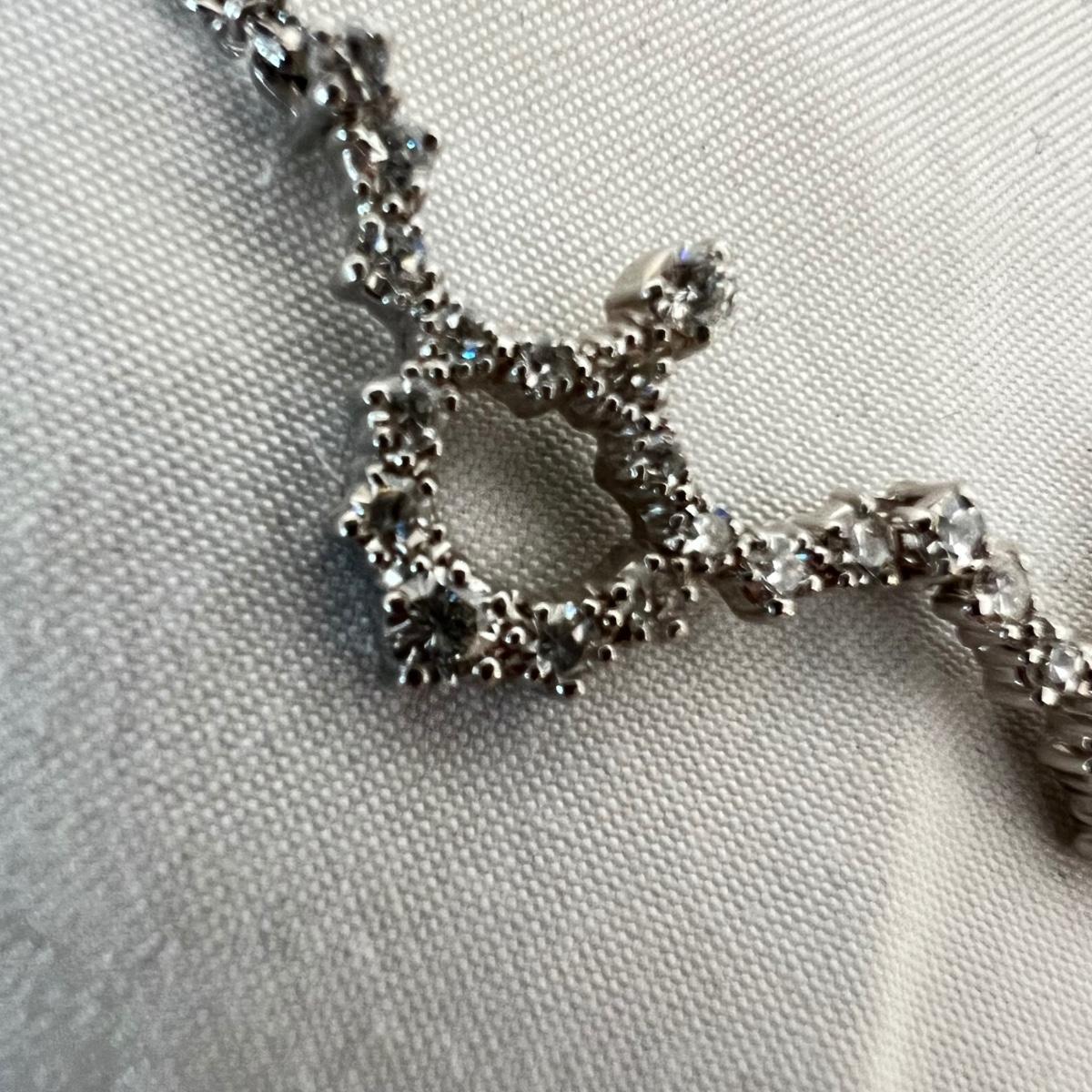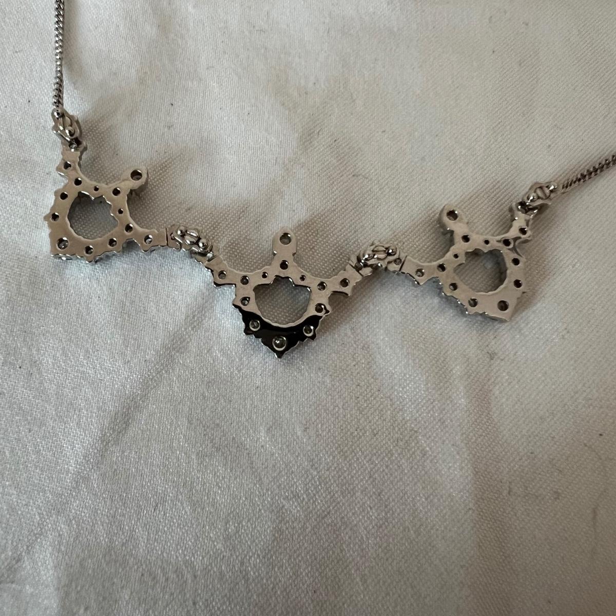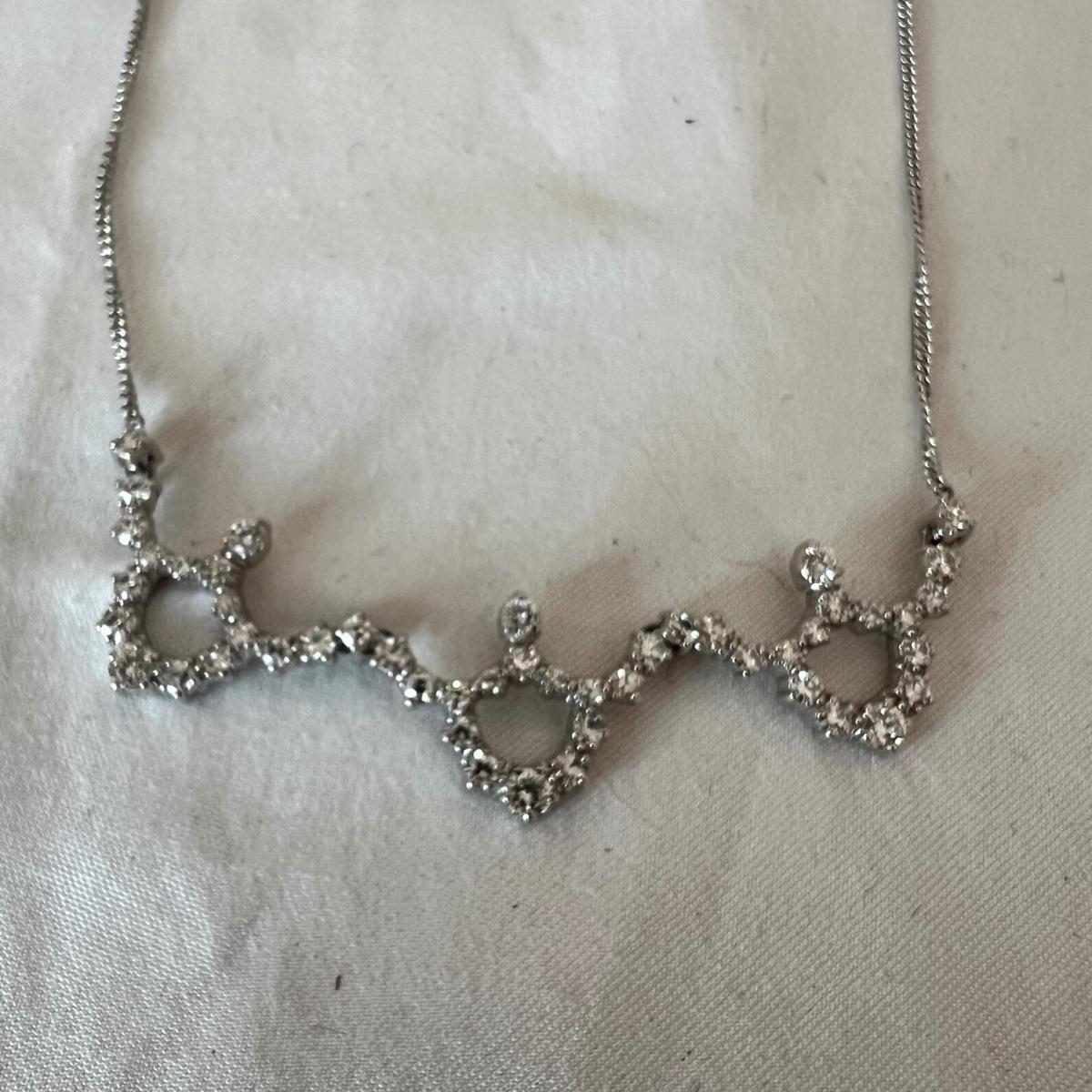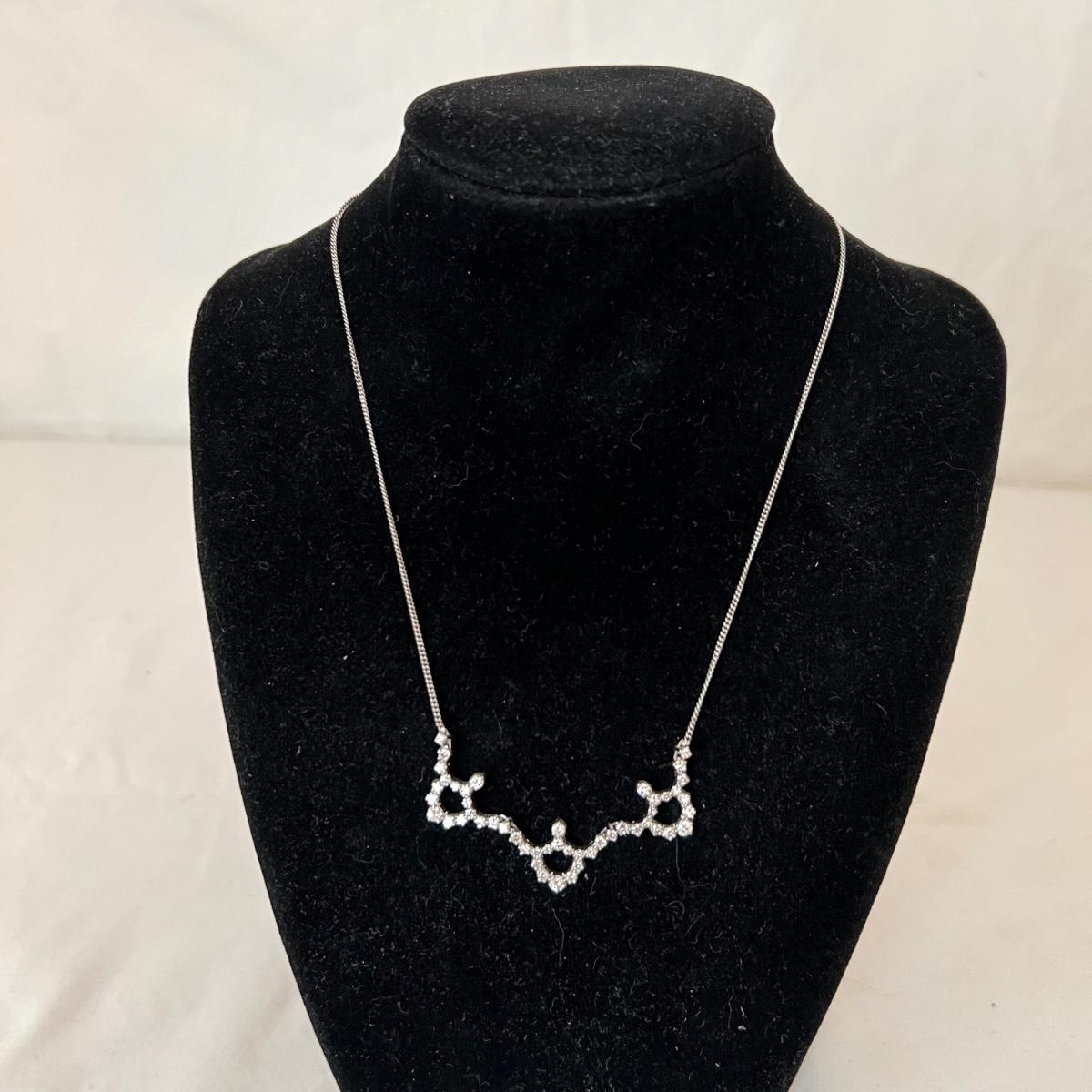 This stunning 14K white gold necklace has three clusters of diamonds some of which tested positive on our tester. Necklace measures 16” long.