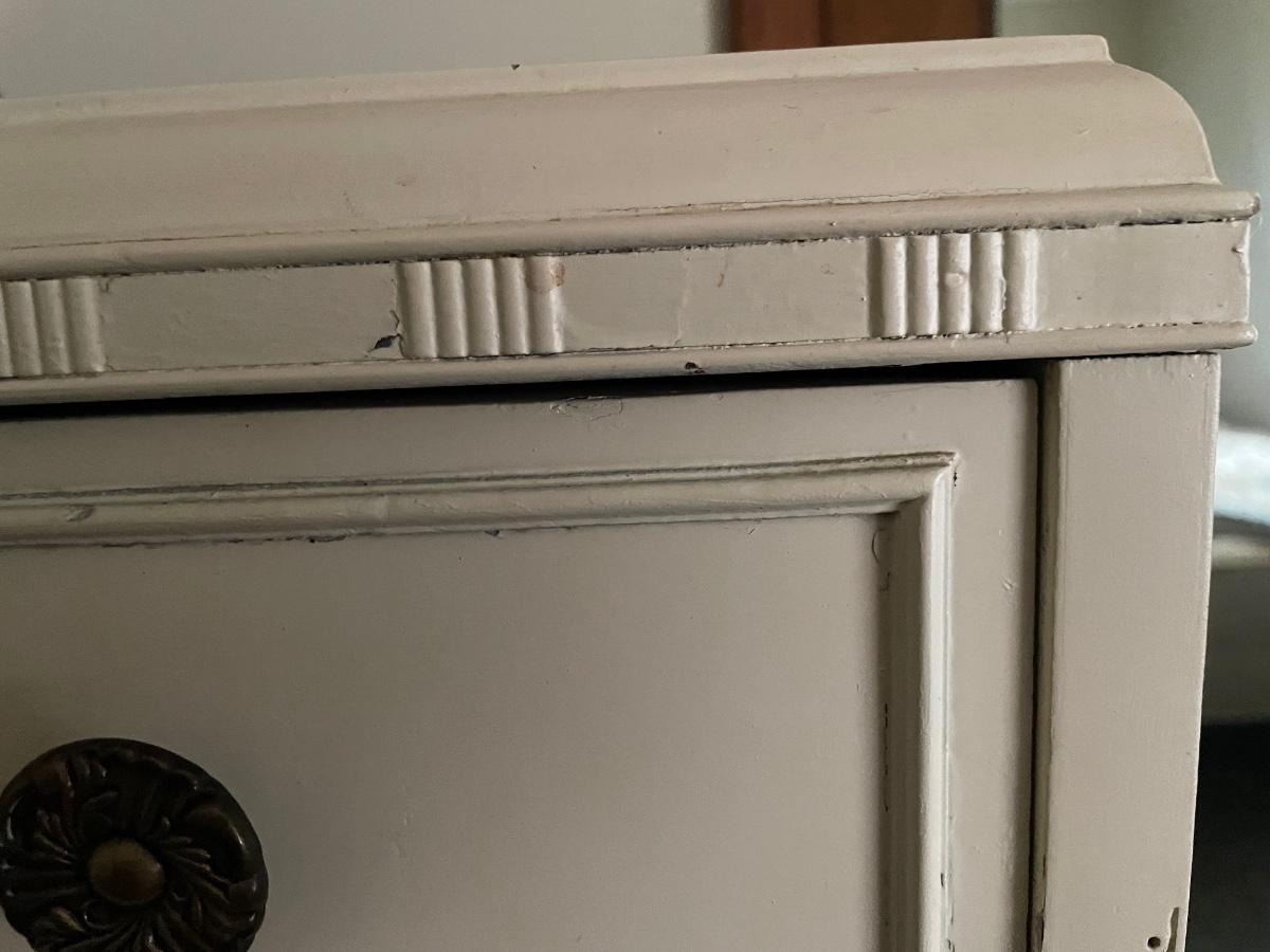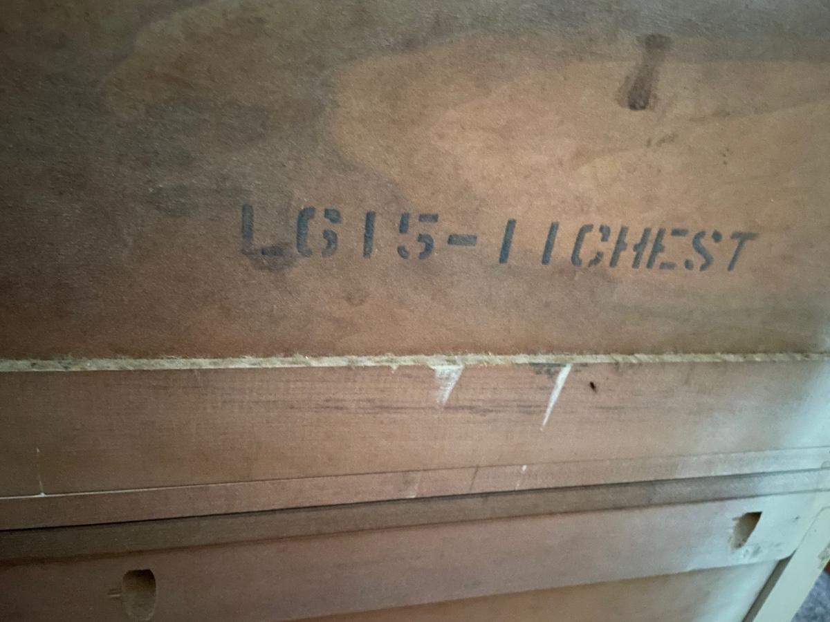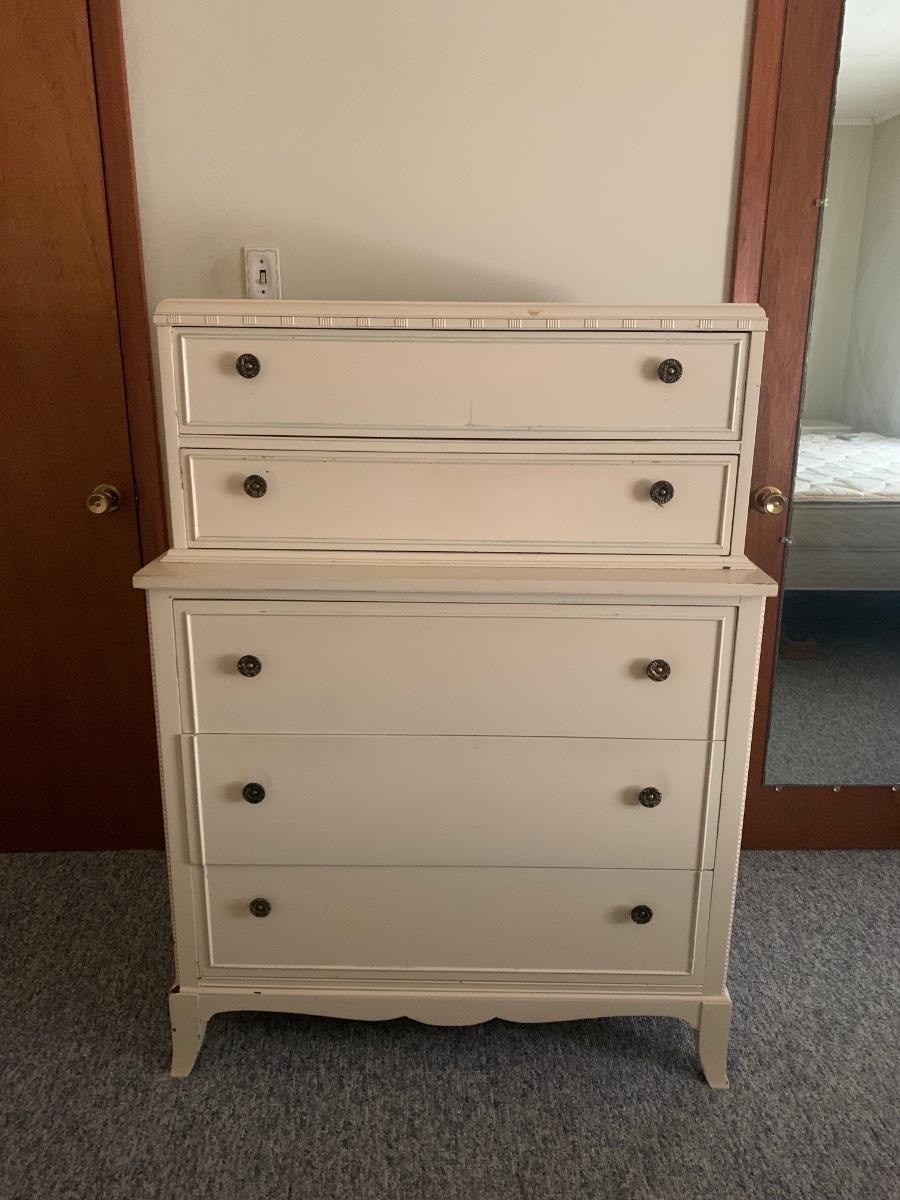 White 5 Drawer Step Back Chest. Matches White Vanity with mirror & chair, White slipper bench, white bedside table.