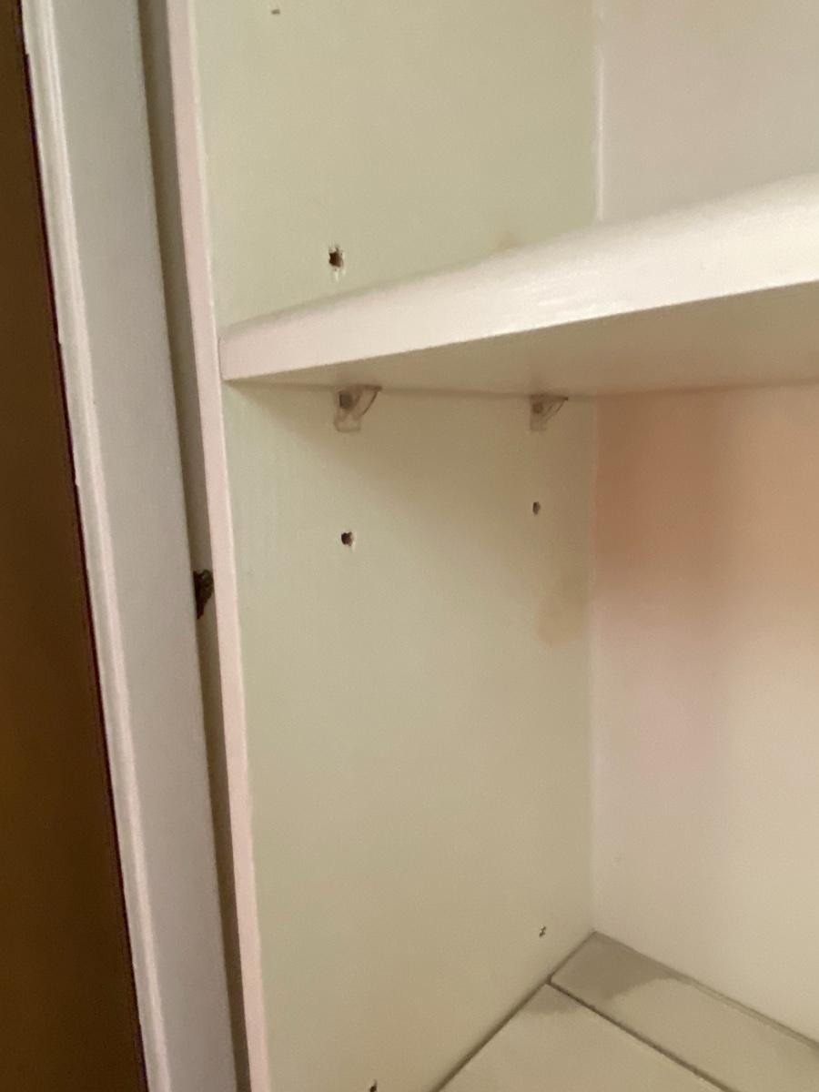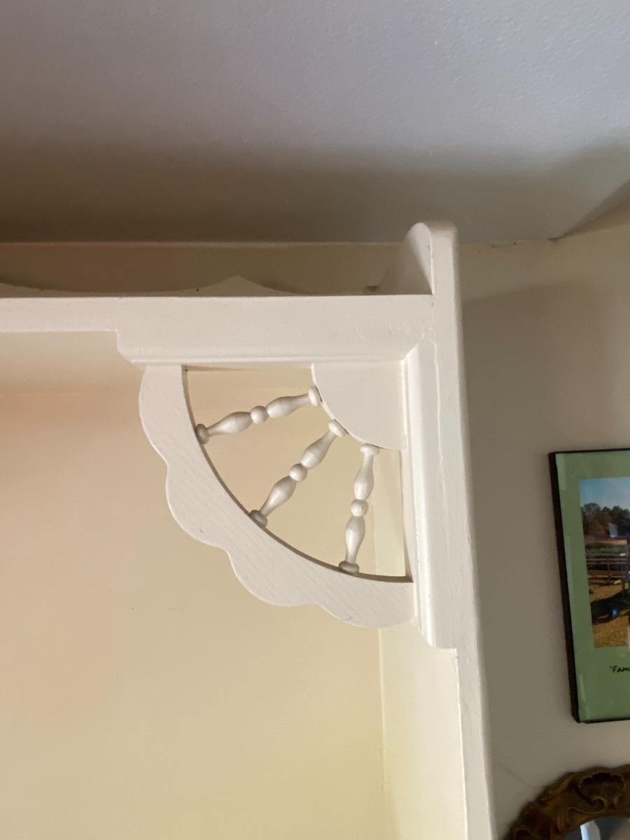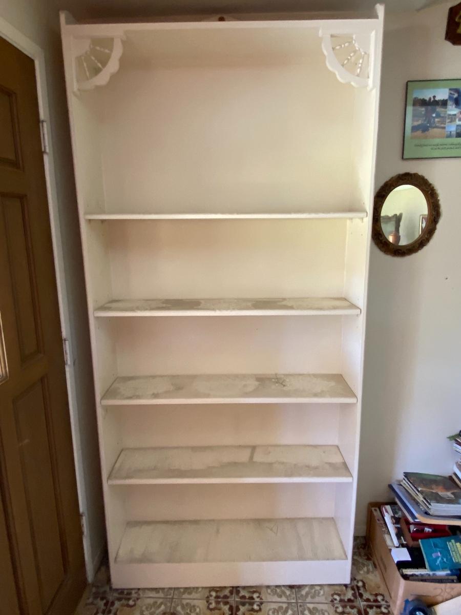 White 8 foot bookcase with adjustable shelves. Dusty. Homemade.