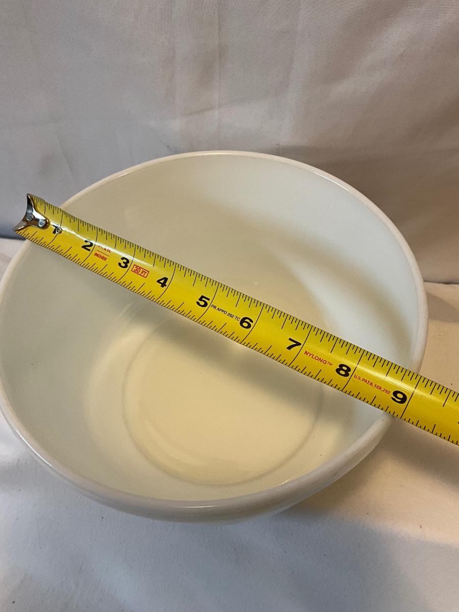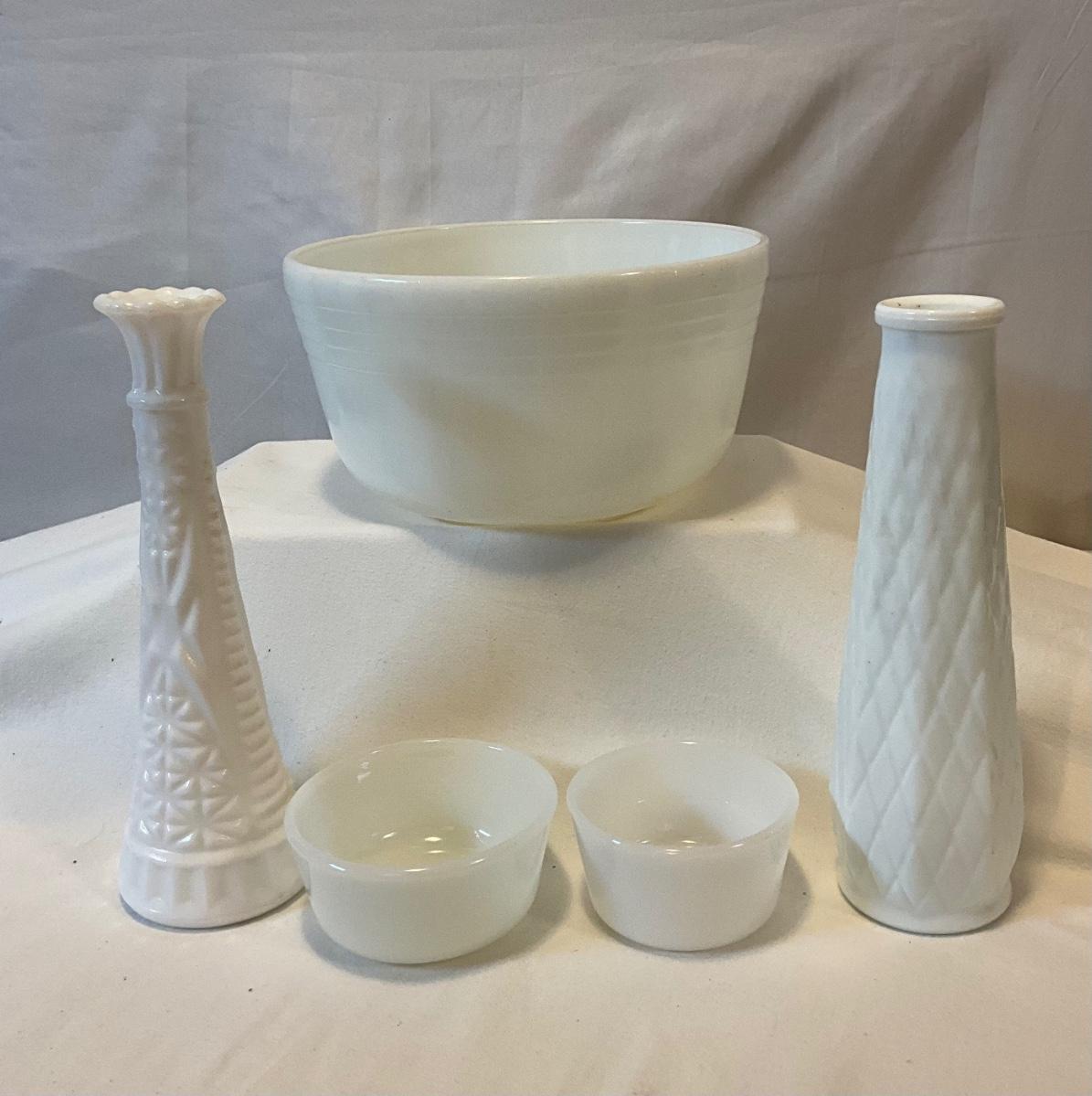 White 9” Pyrex bowl, 2 smaller bowls, 2 vases
