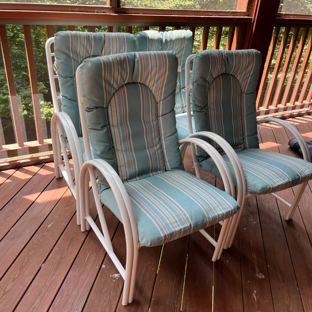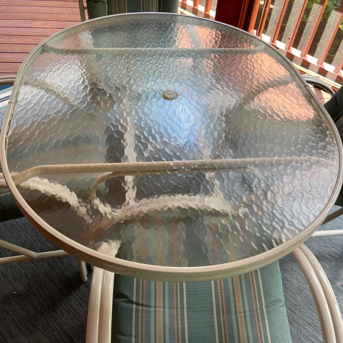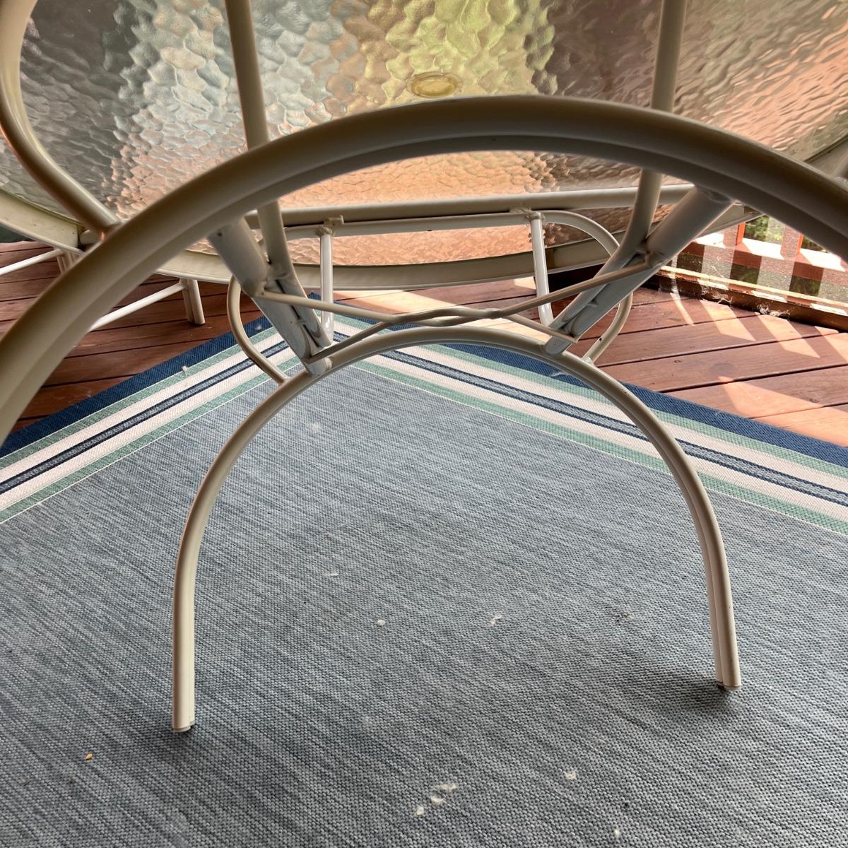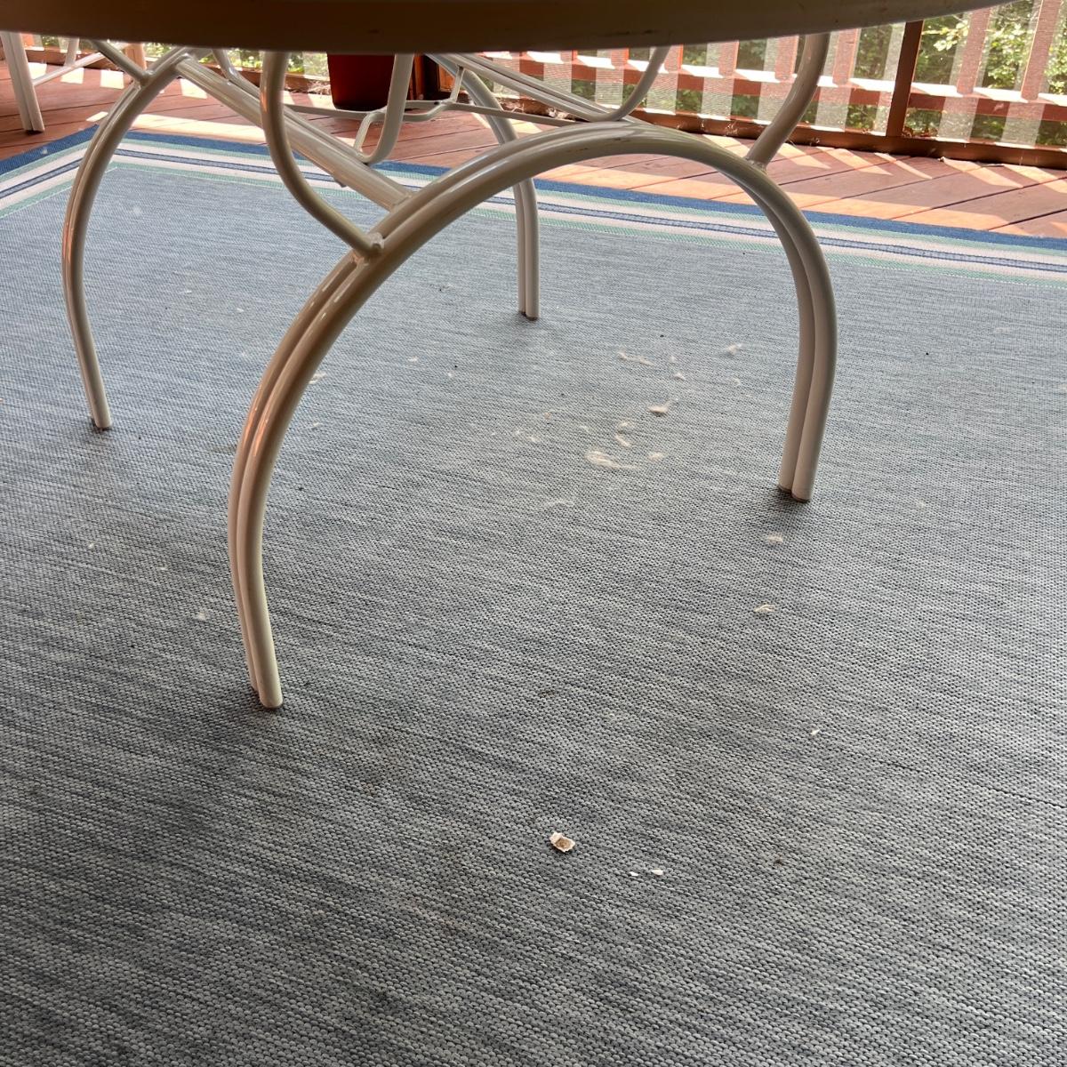Lot includes a white aluminum glass top patio table with four chairs with removable cushions. Table measures 42” x 55” x 27”H with hole in the middle for umbrella and chairs measure 24” x 22” x 36”H with a 19.5” seat height. Cushion have some spots, see pictures. There are two matching lots available in auction and rug is not included but available in auction.