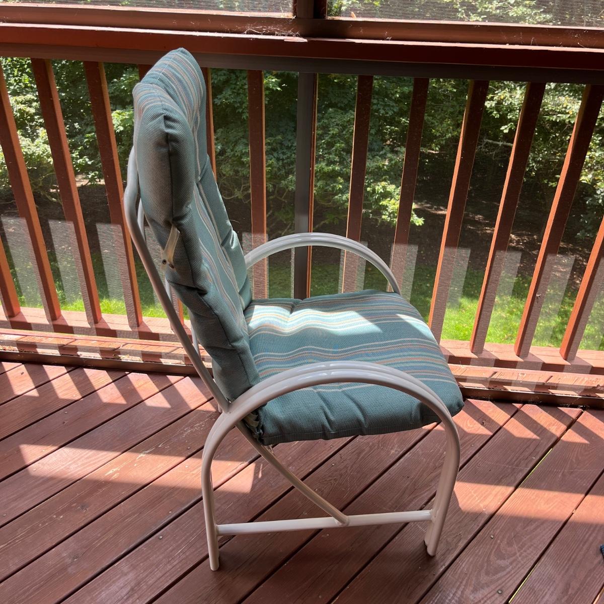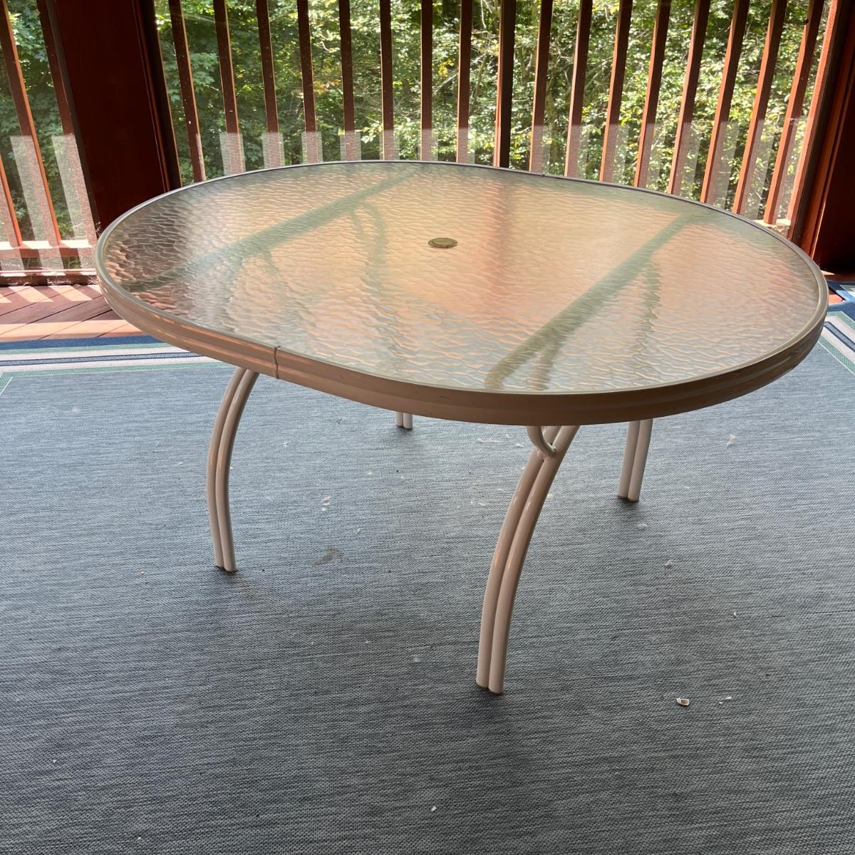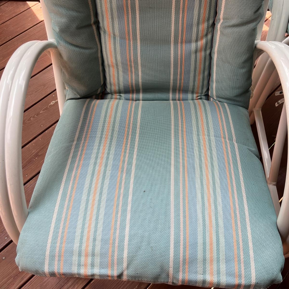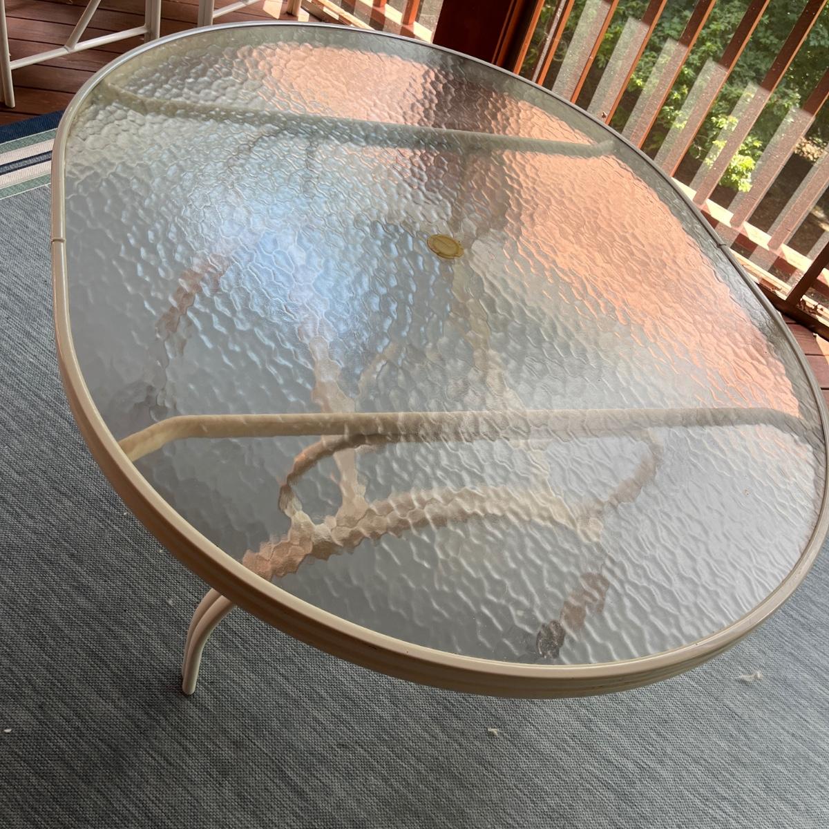 Lot includes a white aluminum glass top patio table with four chairs with removable cushions. Table measures 42” x 55” x 27”H with hole in the middle for umbrella and chairs measure 24” x 22” x 36”H with a 19.5” seat height. Cushion have some spots, see pictures. There are two matching lots available in auction and rug is not included but available in auction.