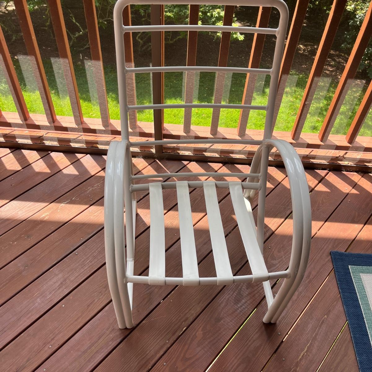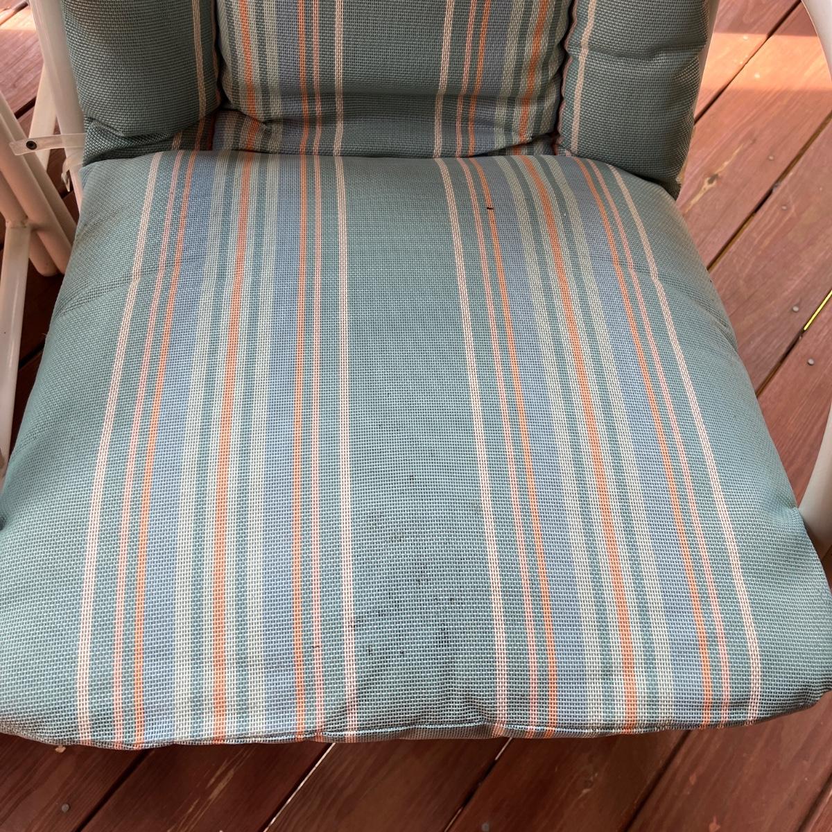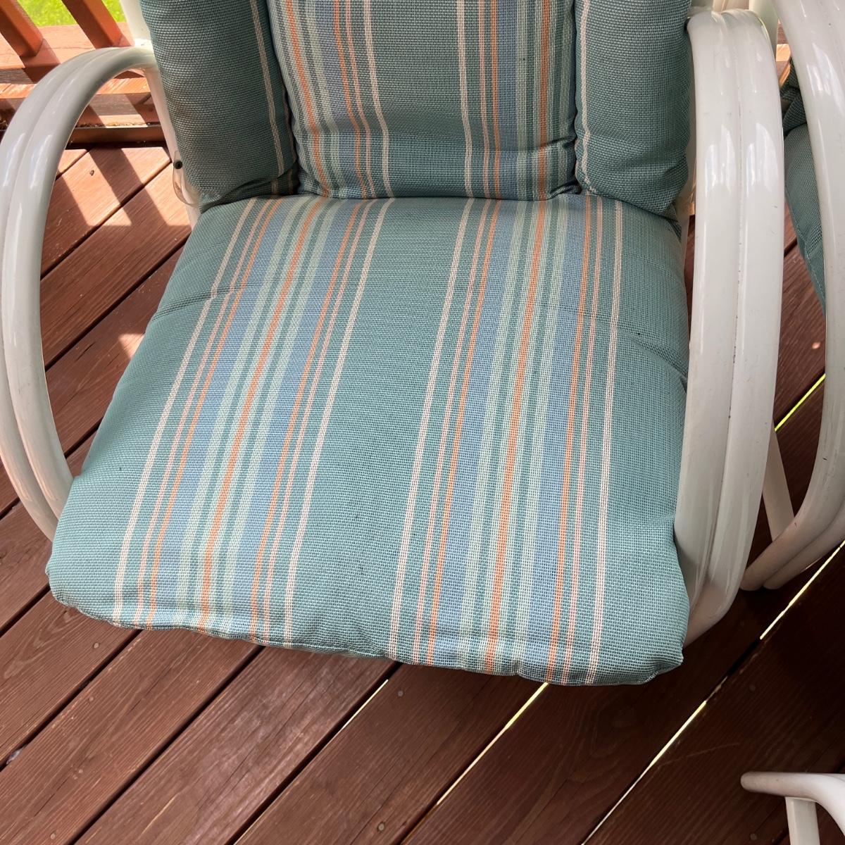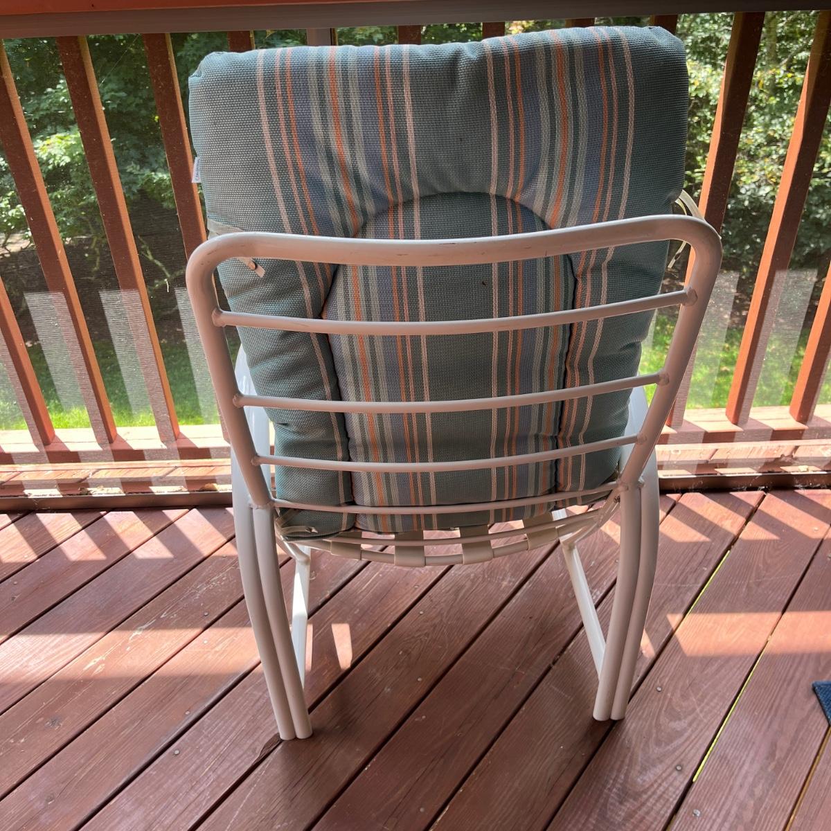Lot includes a white aluminum glass top patio table with four chairs with removable cushions. Table measures 42” x 55” x 27”H with hole in the middle for umbrella and chairs measure 24” x 22” x 36”H with a 19.5” seat height. Cushion have some spots, see pictures. There are two matching lots available in auction and rug is not included but available in auction.