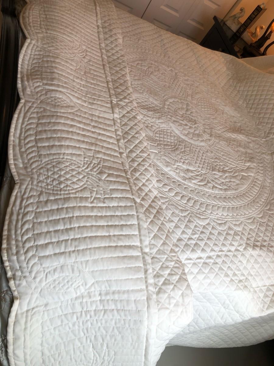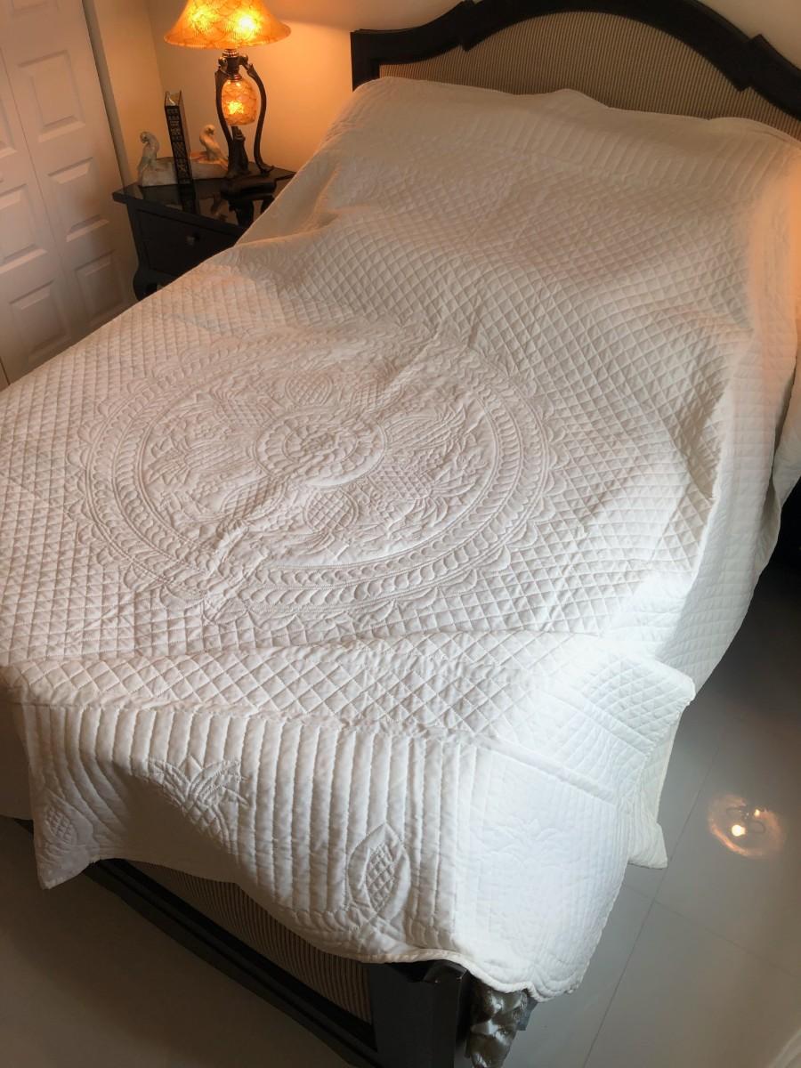 Authentic Amish white quilt, purchased in a museum from the artist. Absolutely beautiful and in mint condition, it’s never been used and is in its original packaging. Fits a Full/Queen bed perfectly. It has a pineapple pattern which is a sign of hospitality and perfect for a guest room.