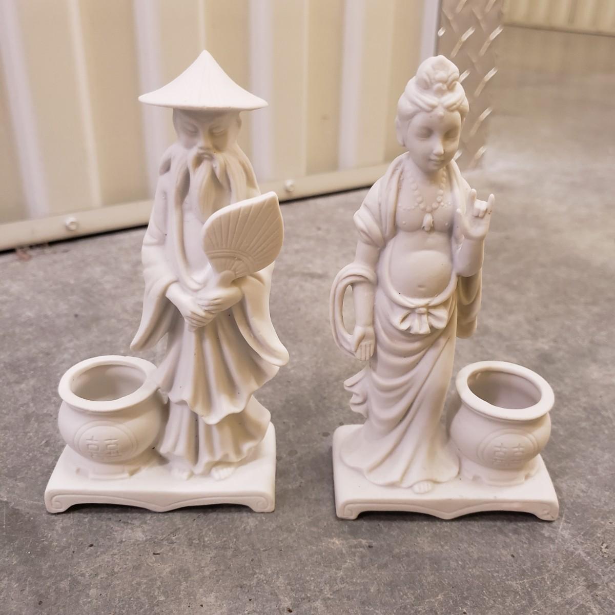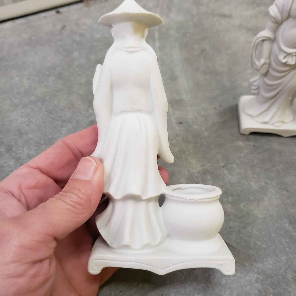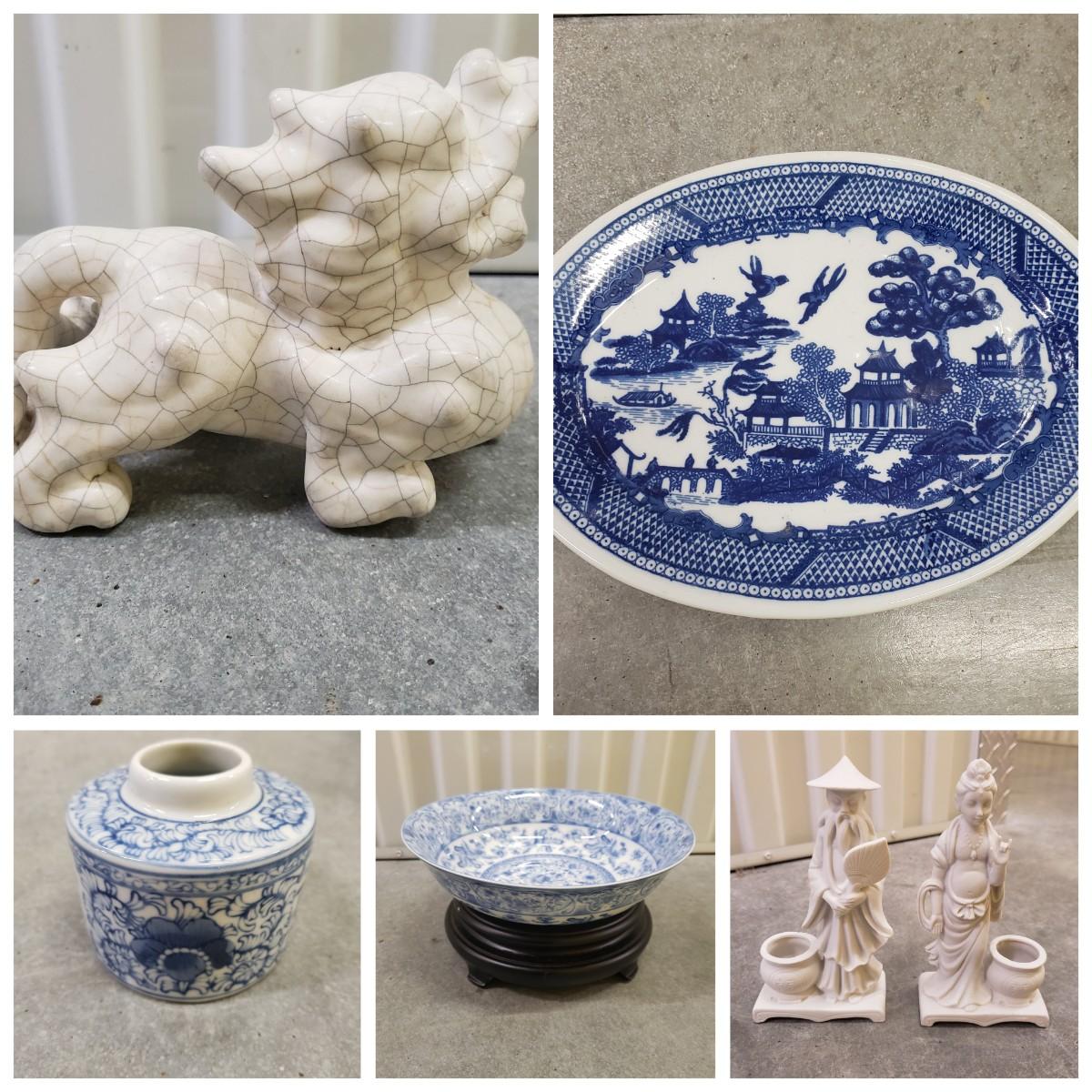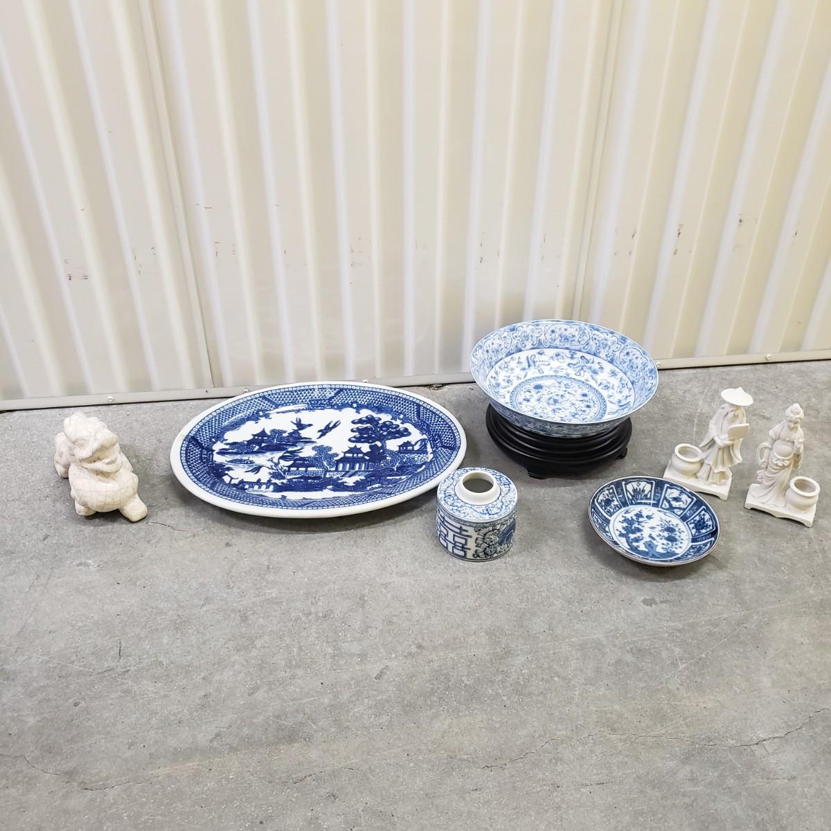 This Asian inspired lot contains six pieces of bowls, figurines and a vase. The large, heavy plate measures 14". The two white matching, ceramic figurines have such delicate features. The largest bowl comes on a wooden, circular stand.