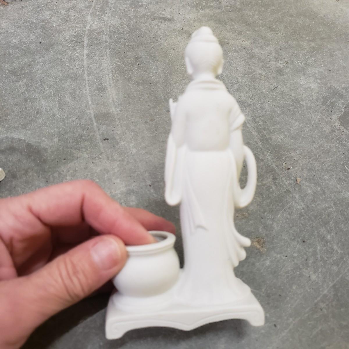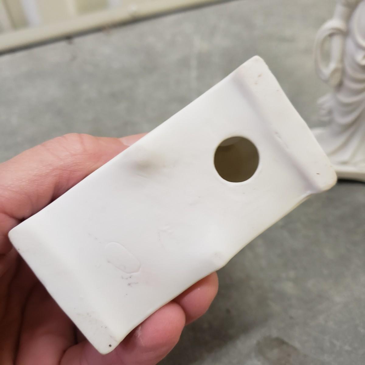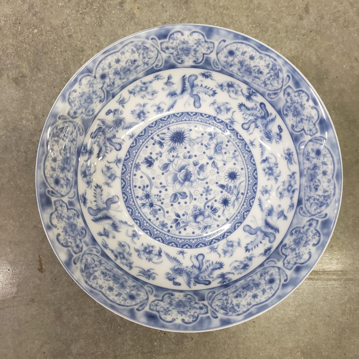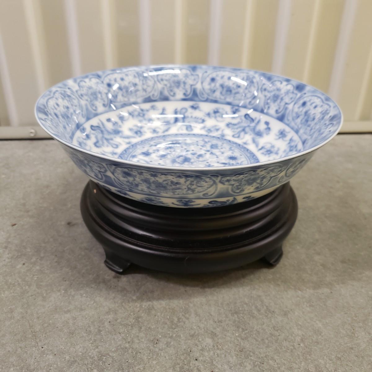 This Asian inspired lot contains six pieces of bowls, figurines and a vase. The large, heavy plate measures 14". The two white matching, ceramic figurines have such delicate features. The largest bowl comes on a wooden, circular stand.