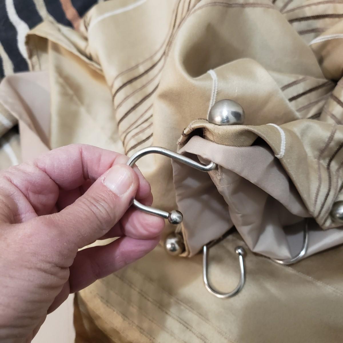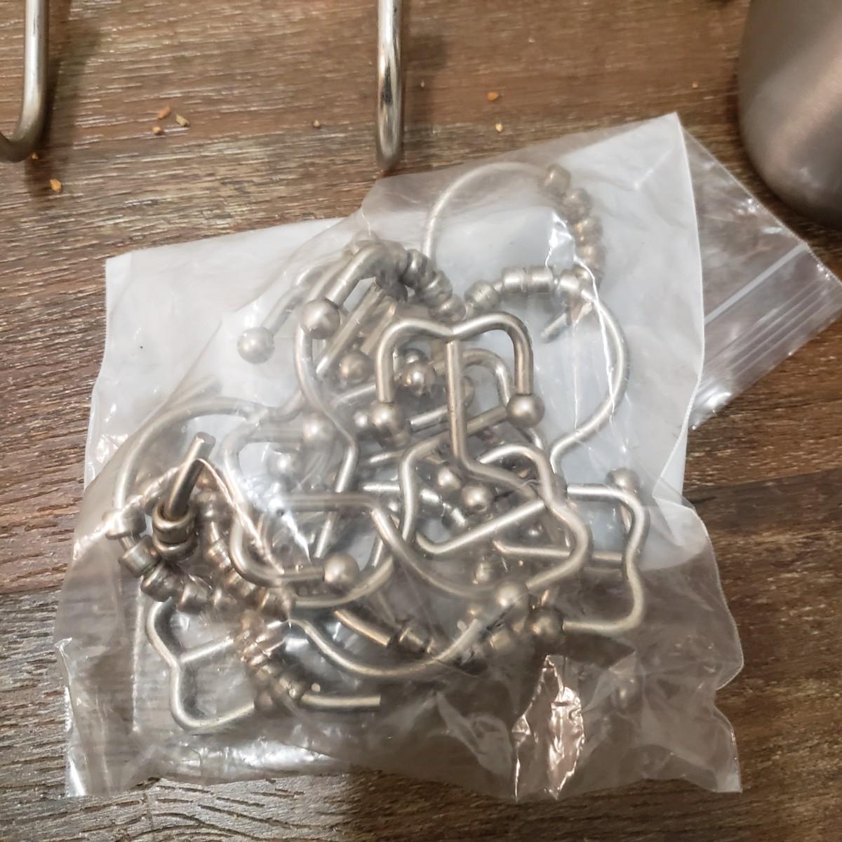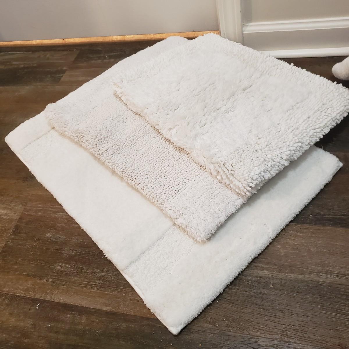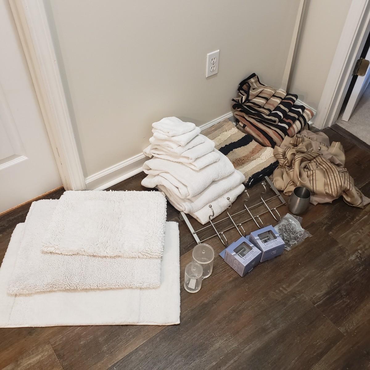 This bath lot features two sets of towels, shower bar, over the door metal hanger and clear two set jars with lids. The shower curtain has a tan liner with it and metal hooks, see pictures. The shower curtain measures approximately 70" x 70"H. The white bath mats appear to be never or barely used.