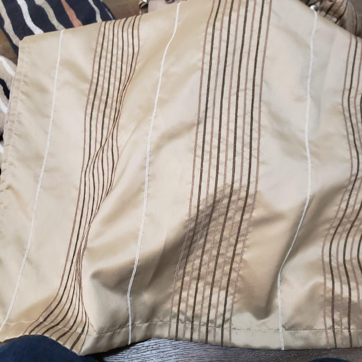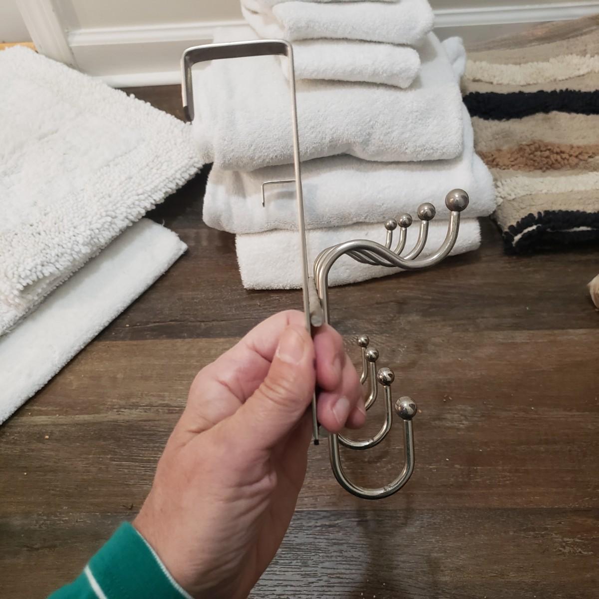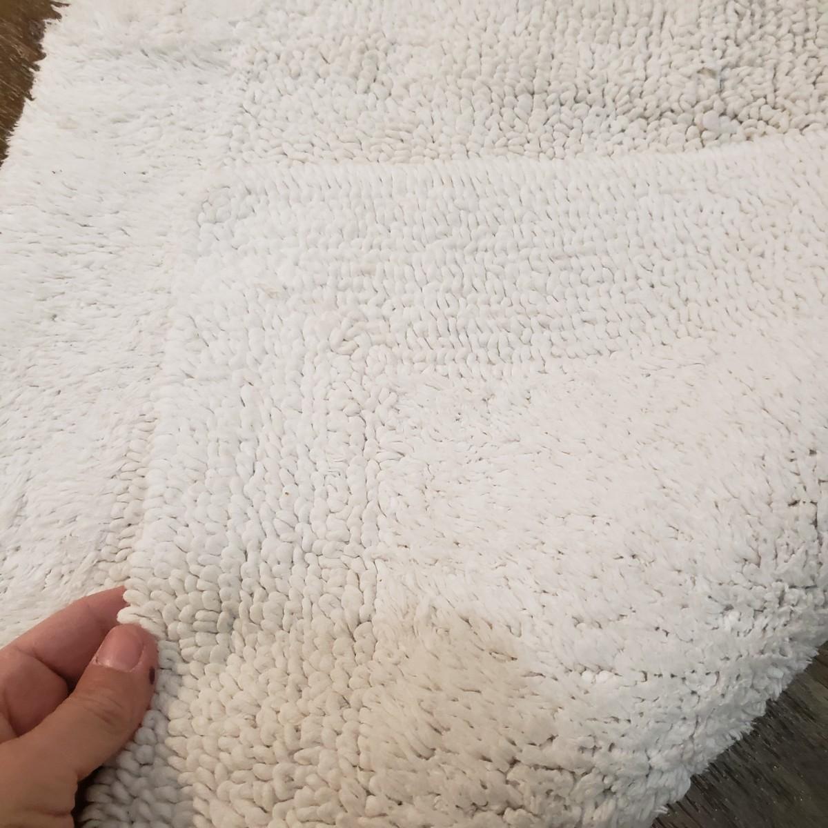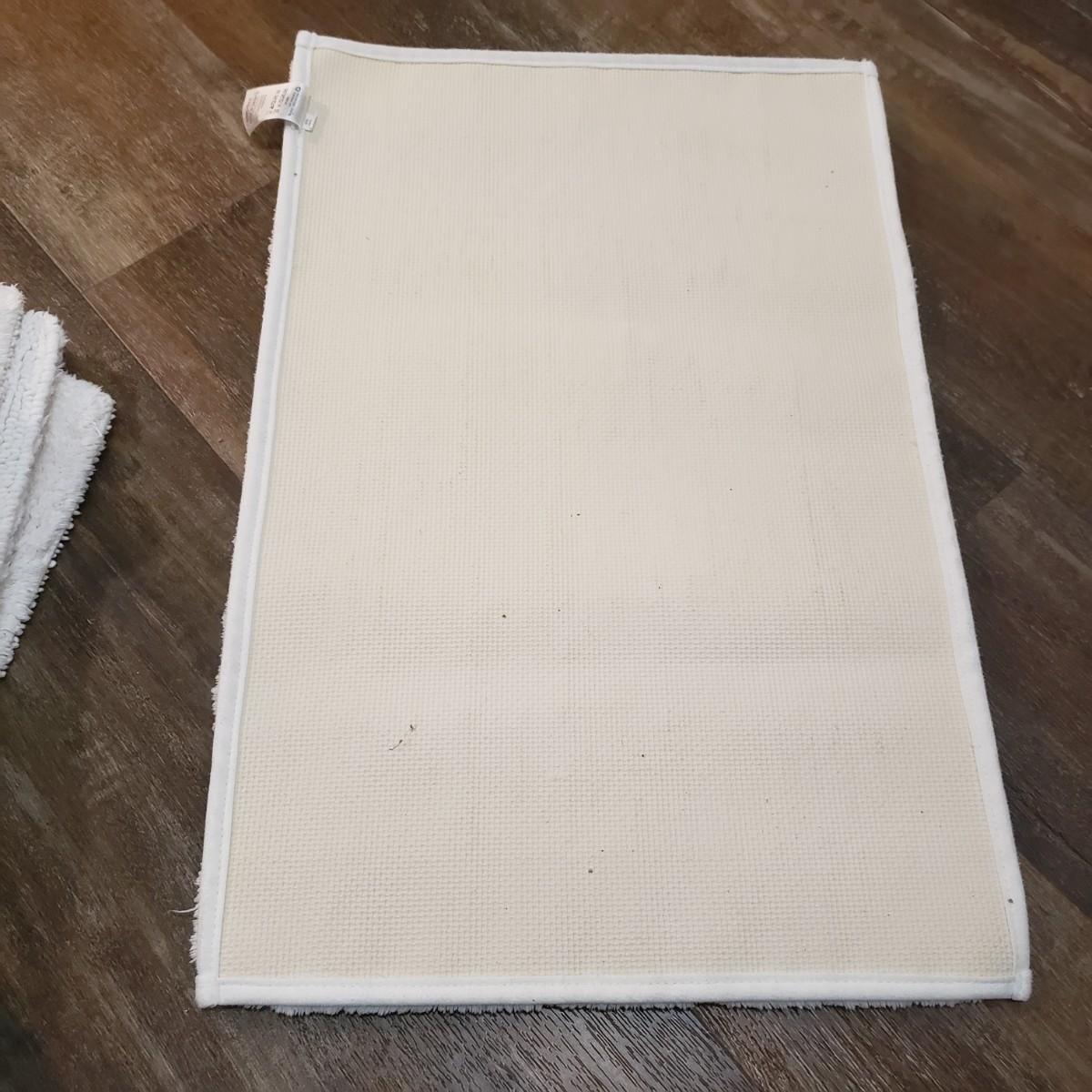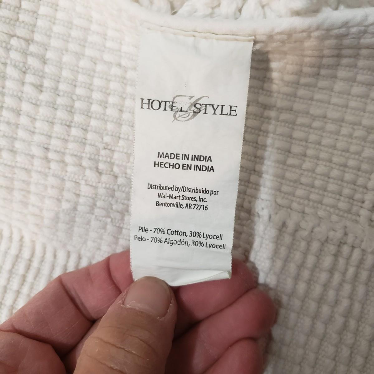 This bath lot features two sets of towels, shower bar, over the door metal hanger and clear two set jars with lids. The shower curtain has a tan liner with it and metal hooks, see pictures. The shower curtain measures approximately 70" x 70"H. The white bath mats appear to be never or barely used.