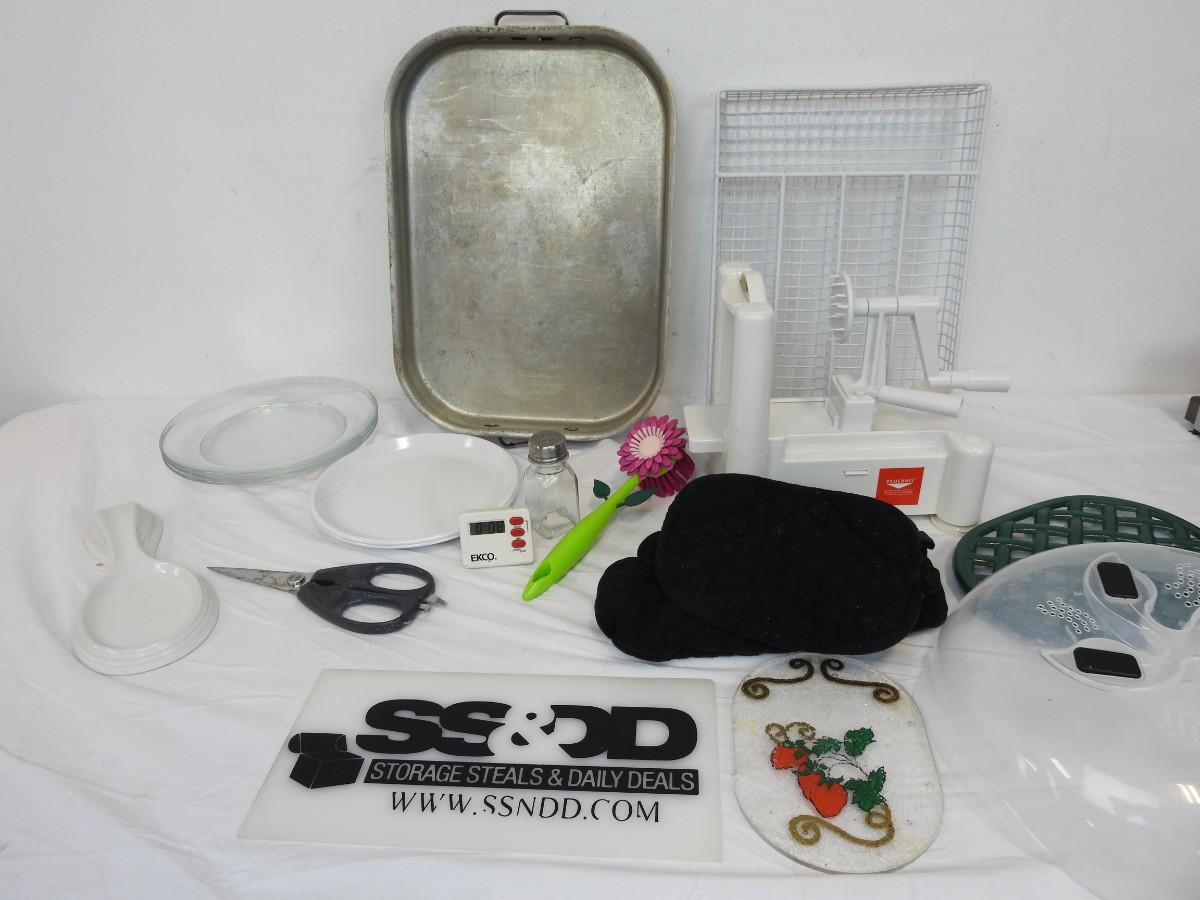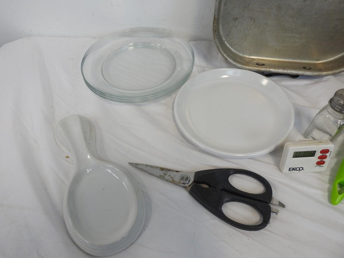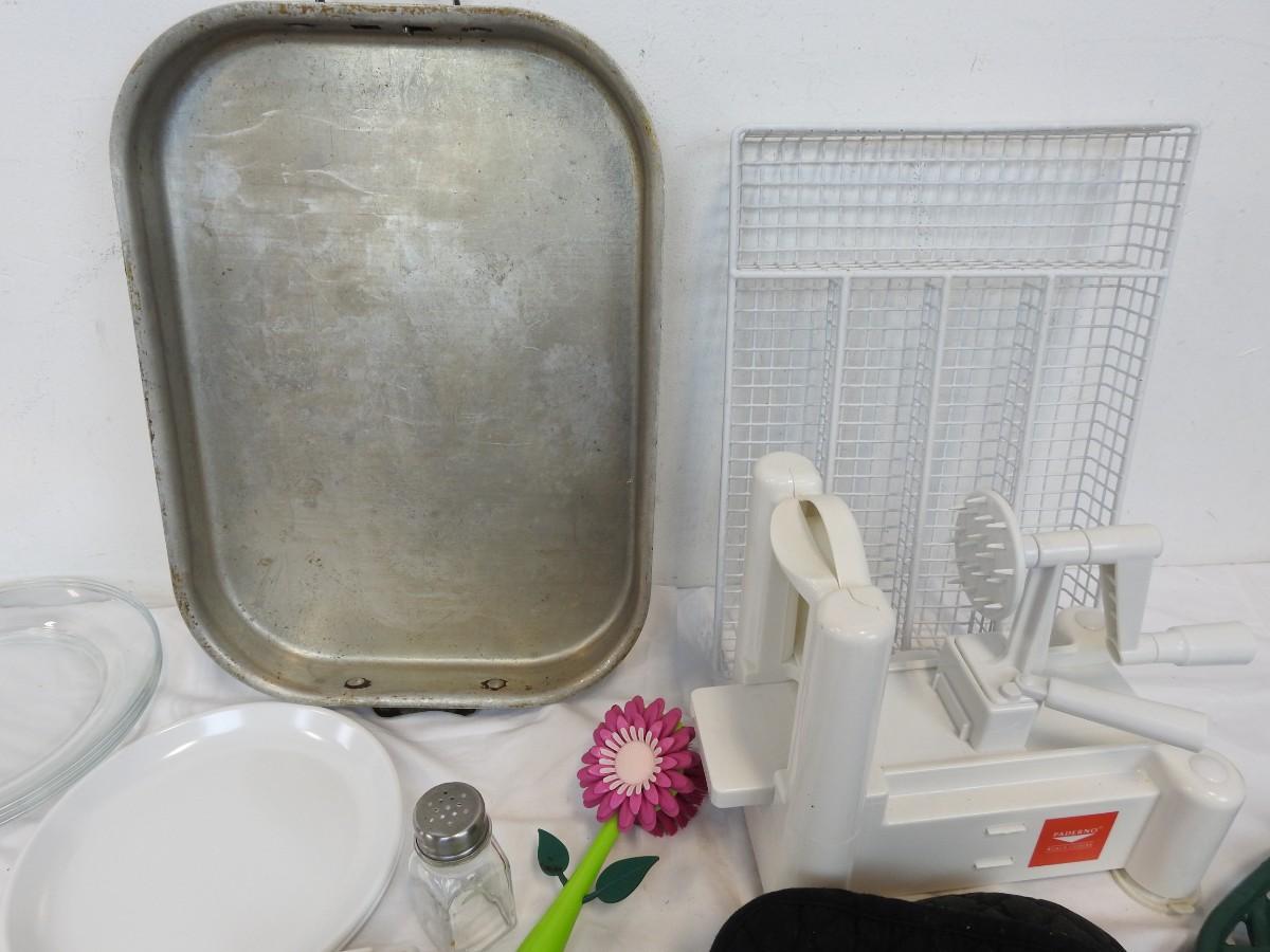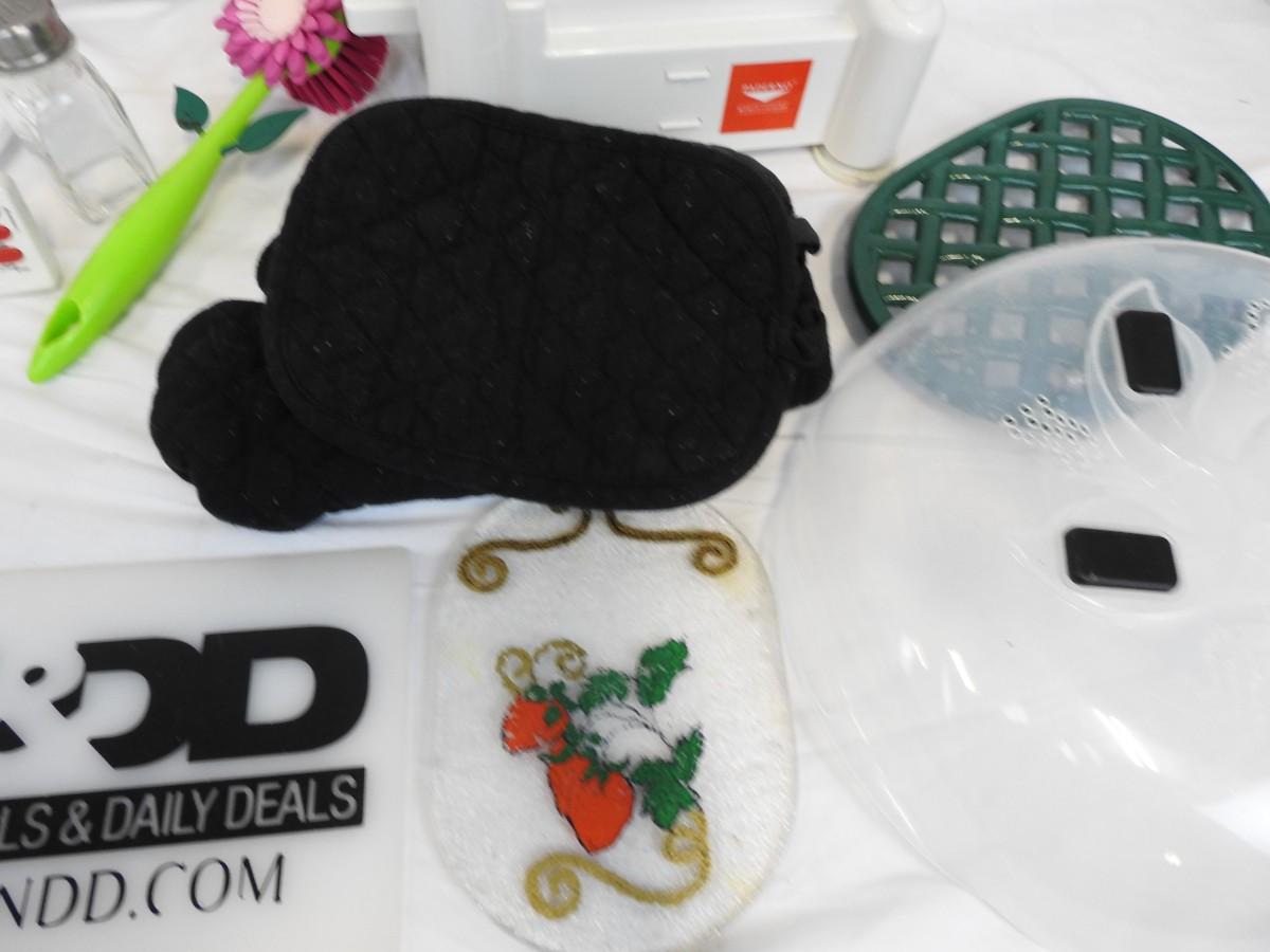 White and Clear Glass Plates, Oven Mitts, and Wire Silverware Tray