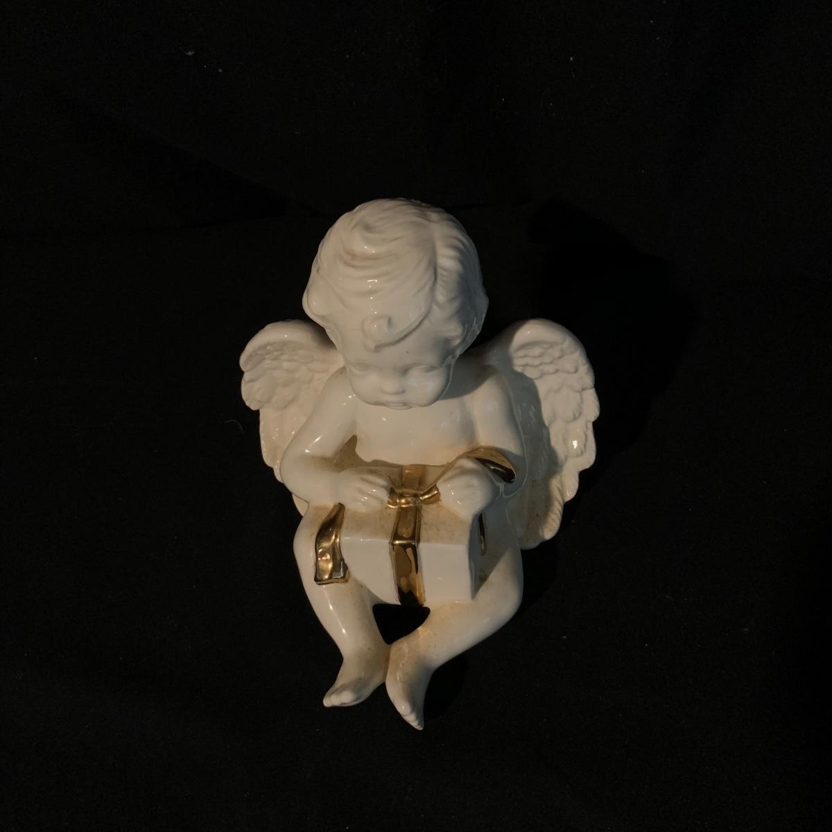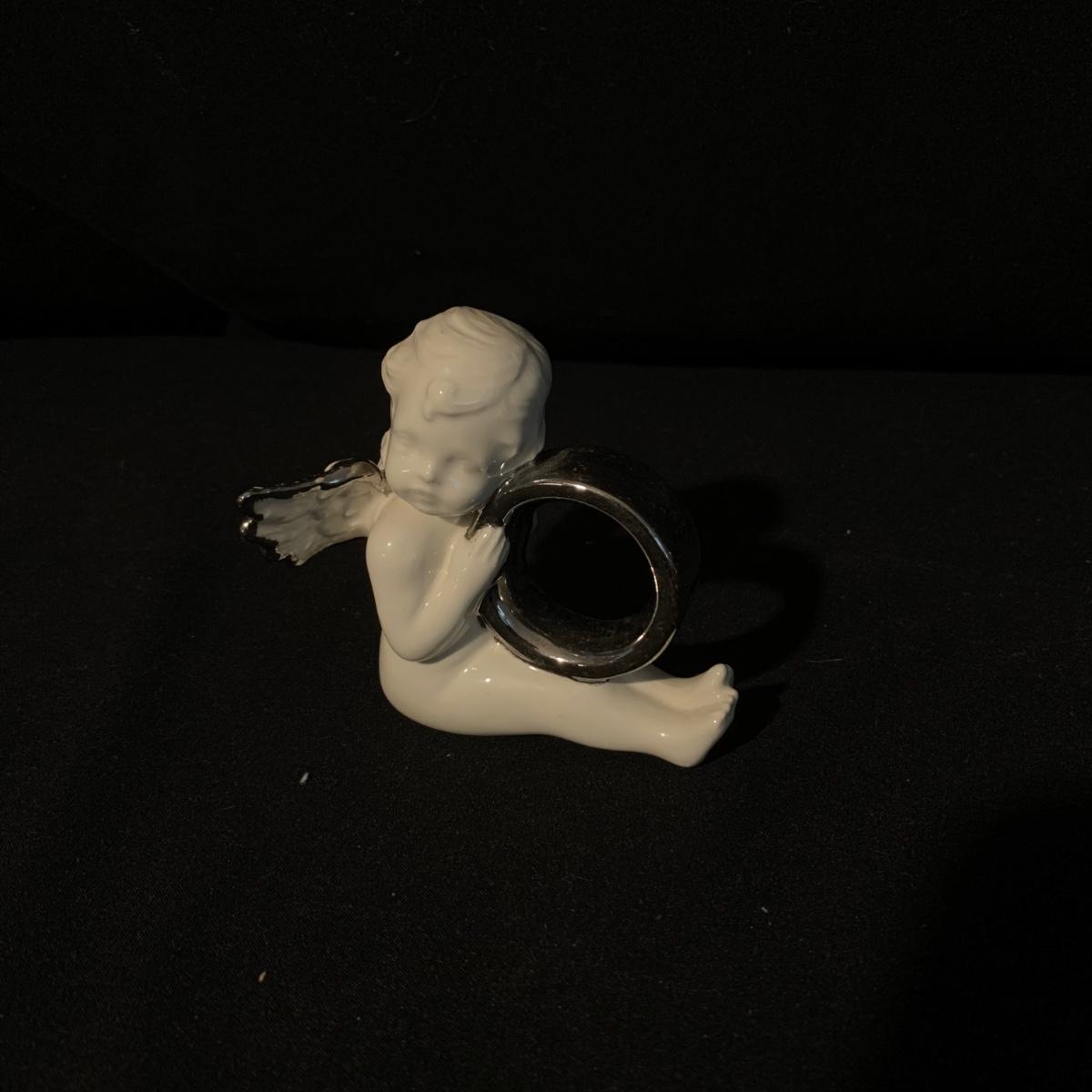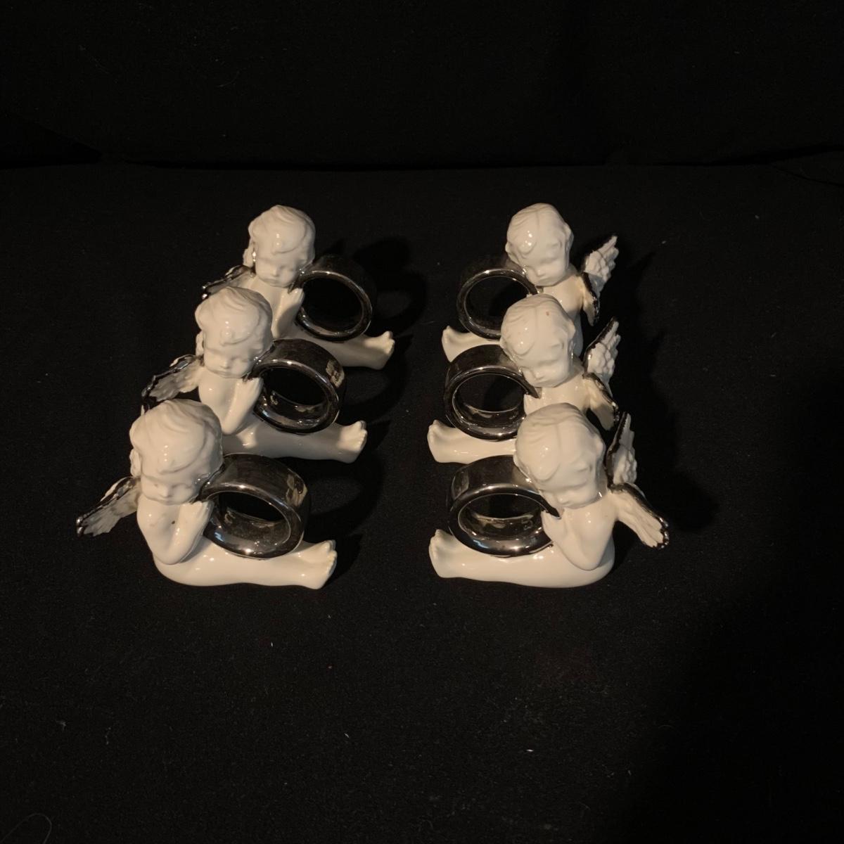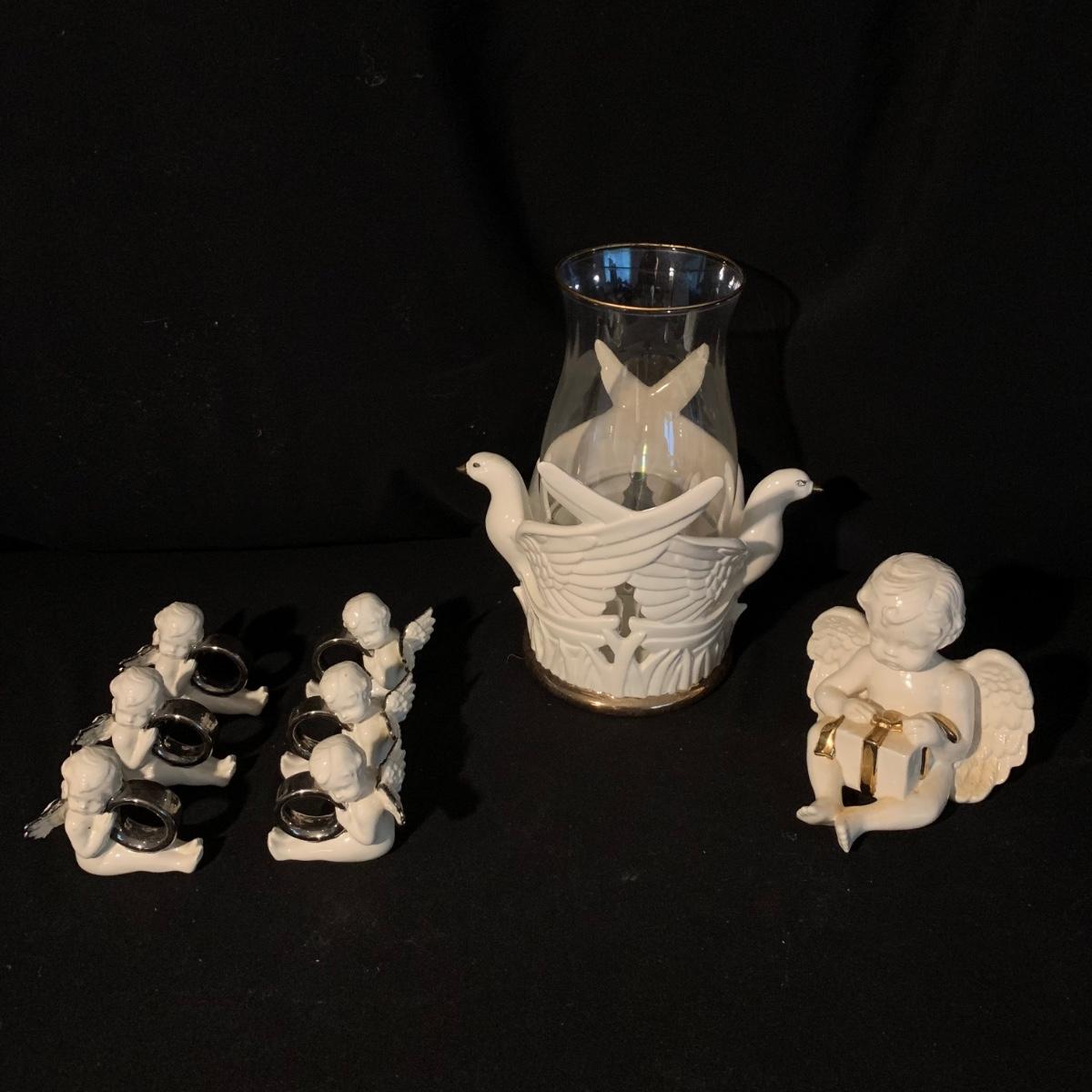 This lot includes a set of six angel napkin holders, one white and gold dove candle holder, and one white and gold angel figurine. Some of the pieces have discoloration (see photos). The angels have an artists signature of “VH”. The largest piece measures about 12in x 10in. Shipping available.