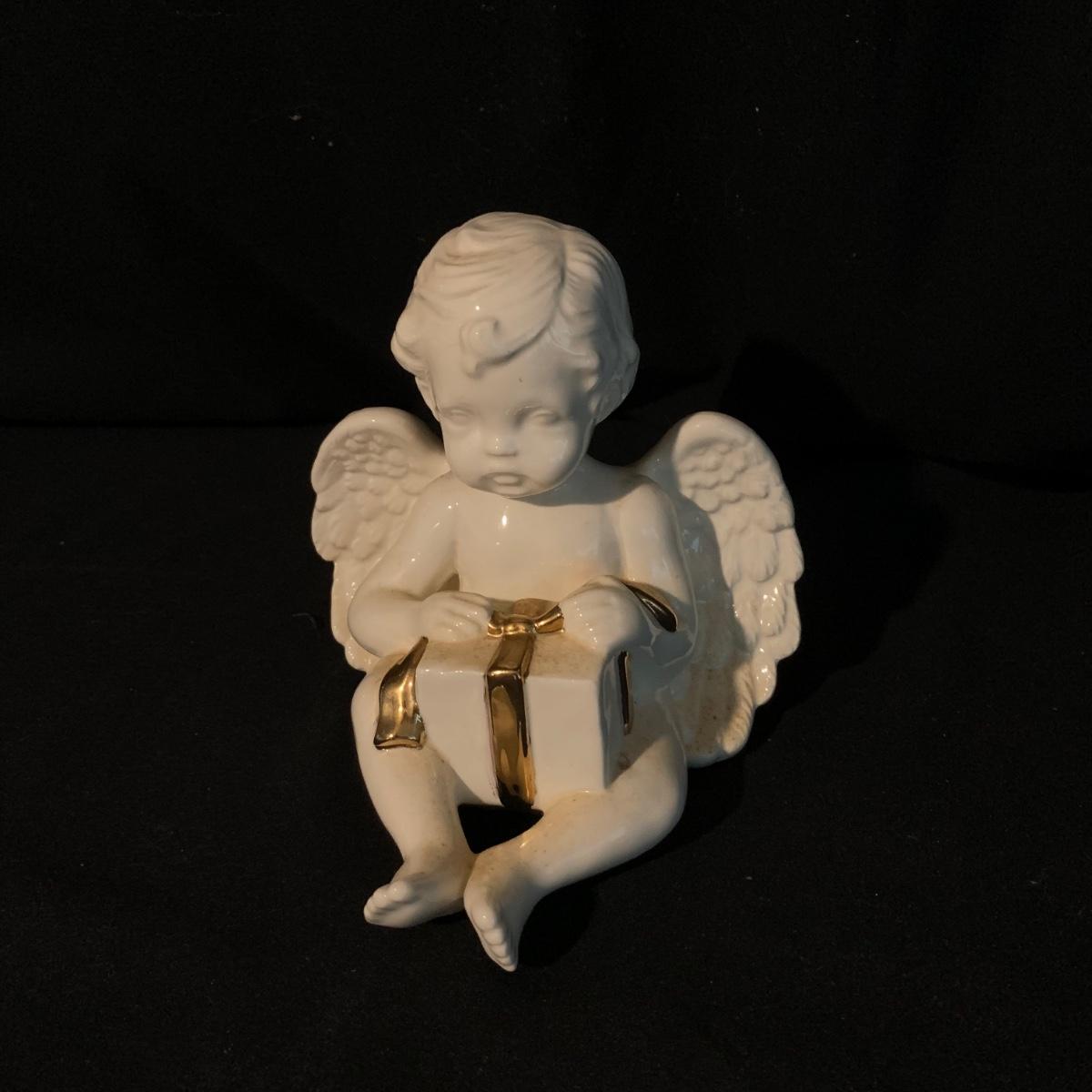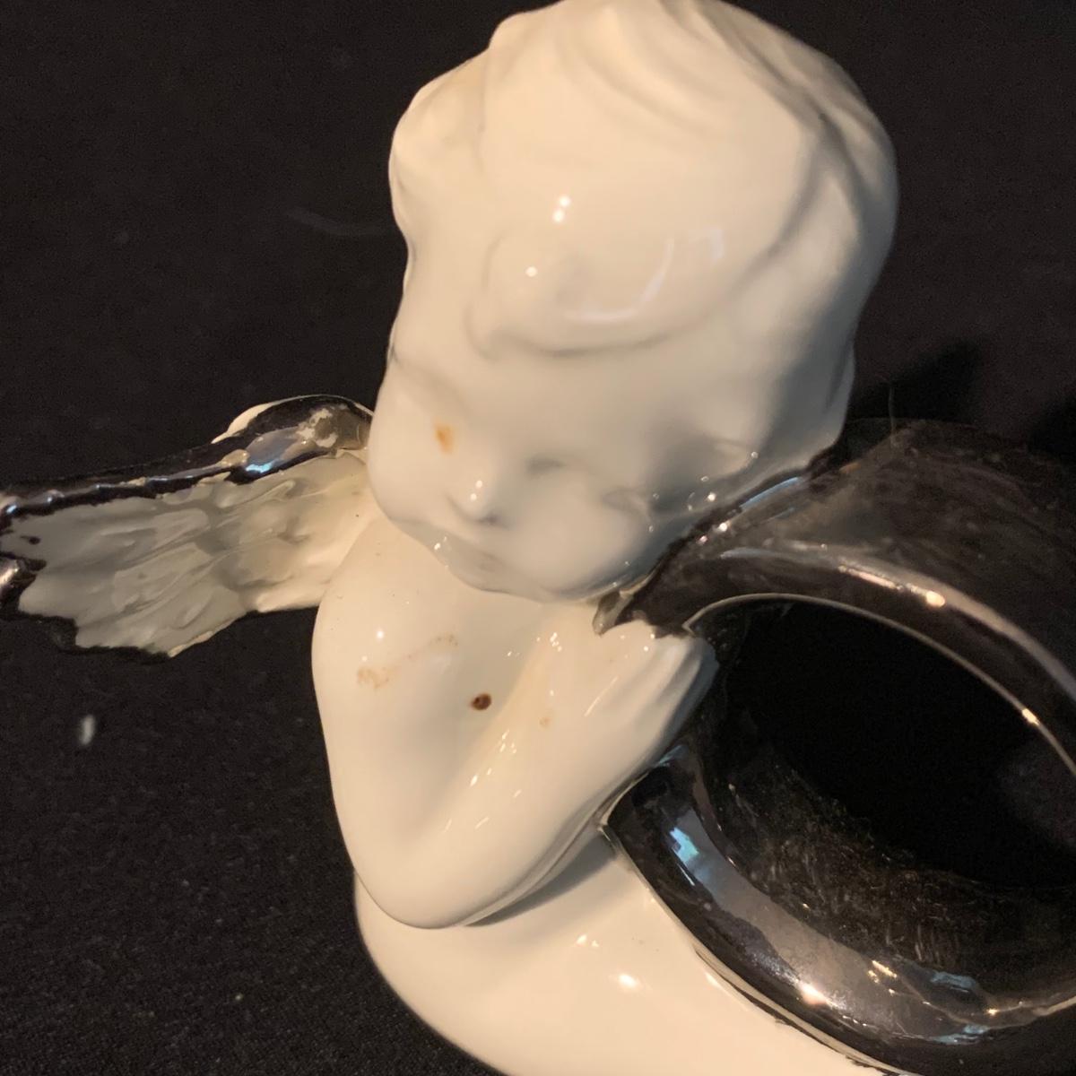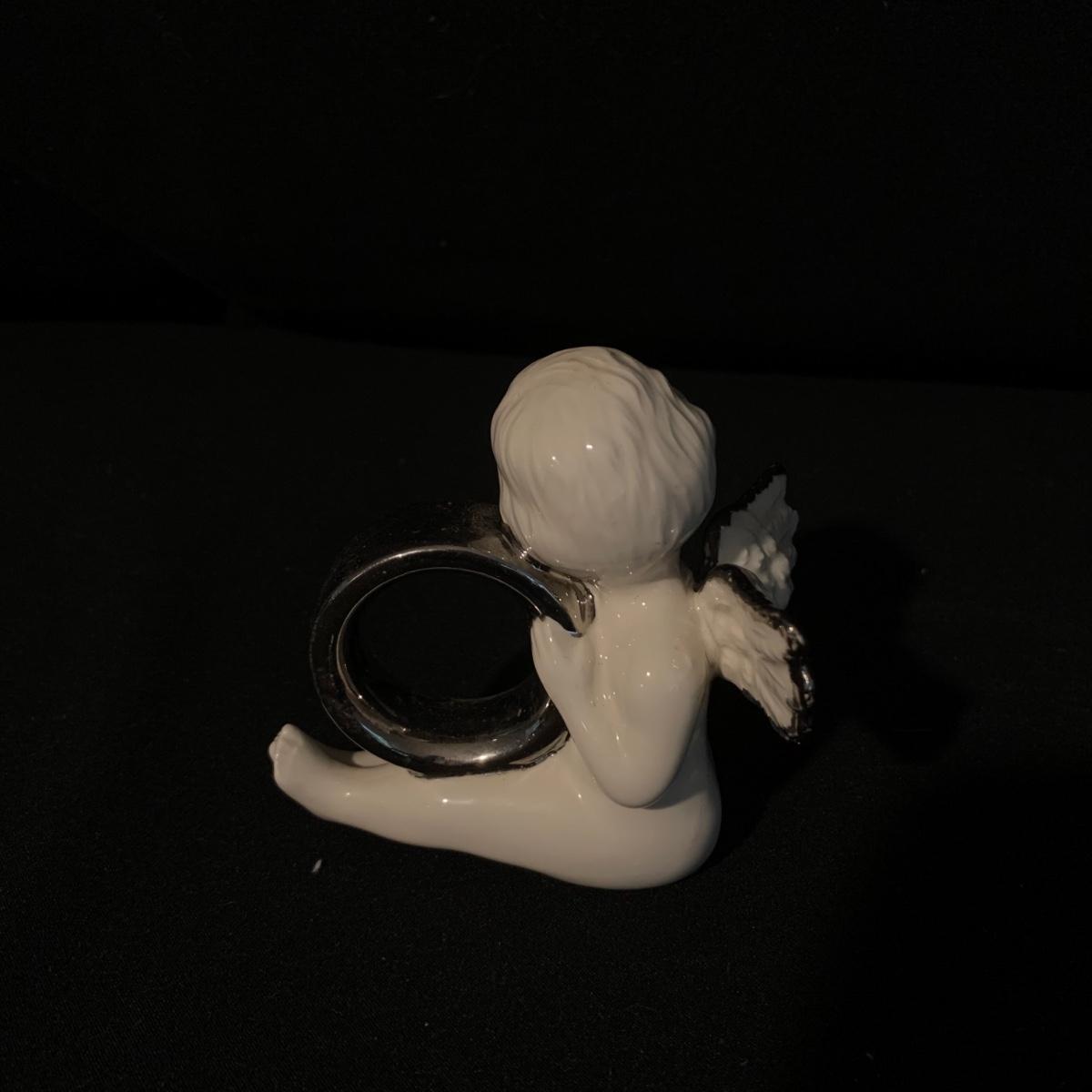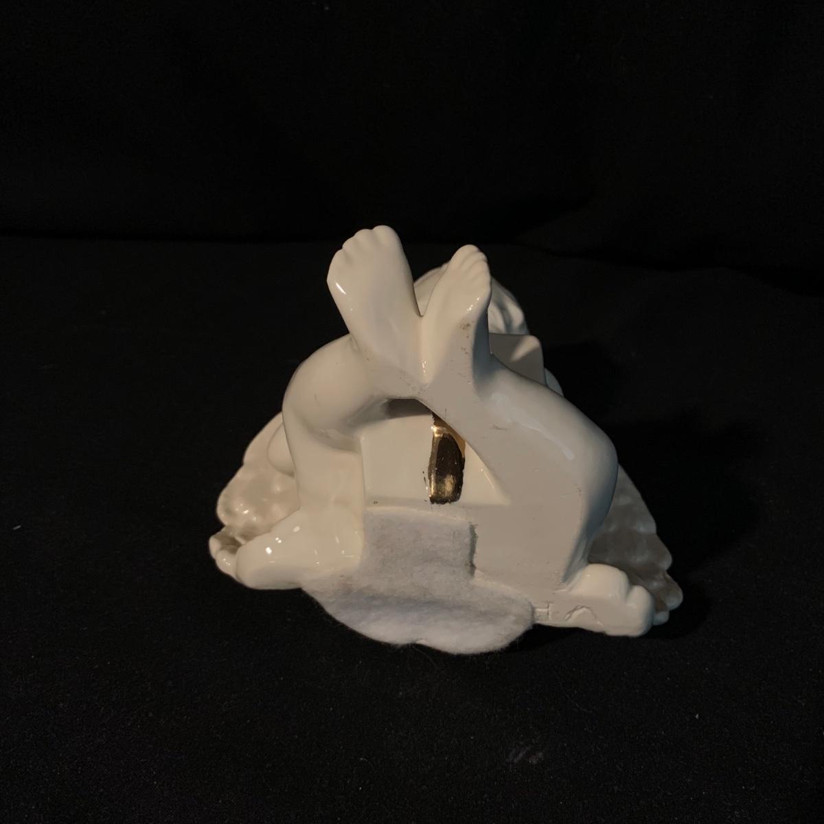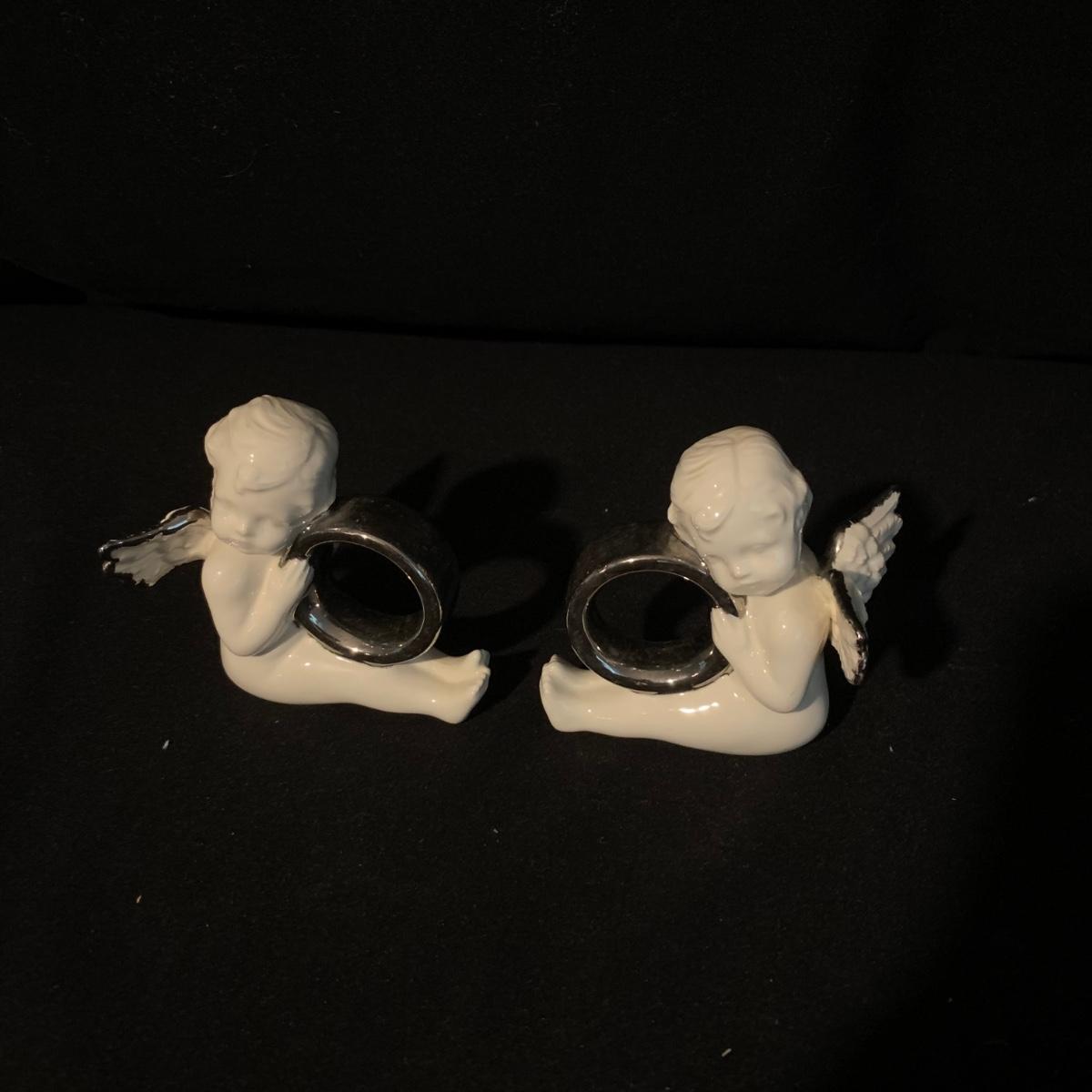 This lot includes a set of six angel napkin holders, one white and gold dove candle holder, and one white and gold angel figurine. Some of the pieces have discoloration (see photos). The angels have an artists signature of “VH”. The largest piece measures about 12in x 10in. Shipping available.