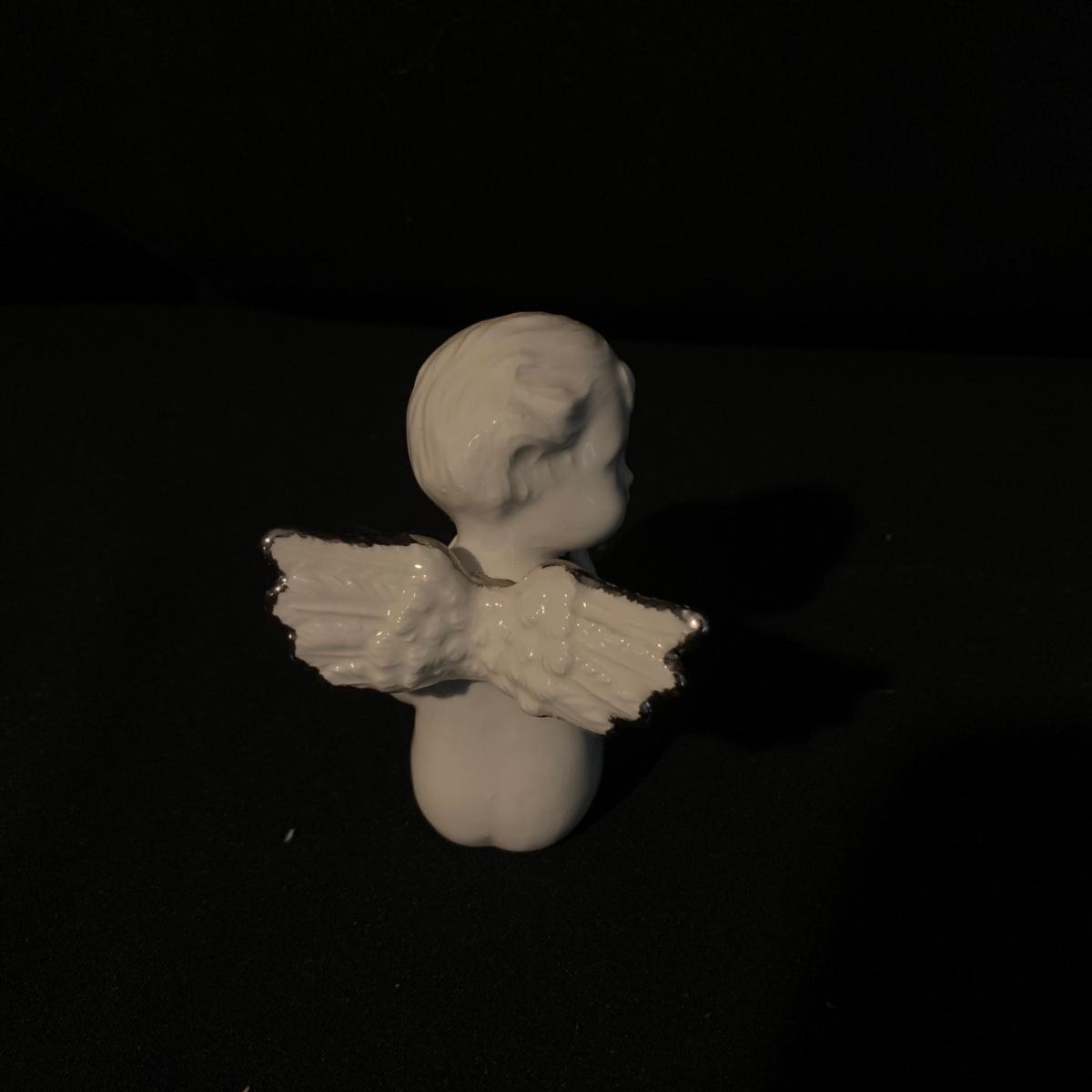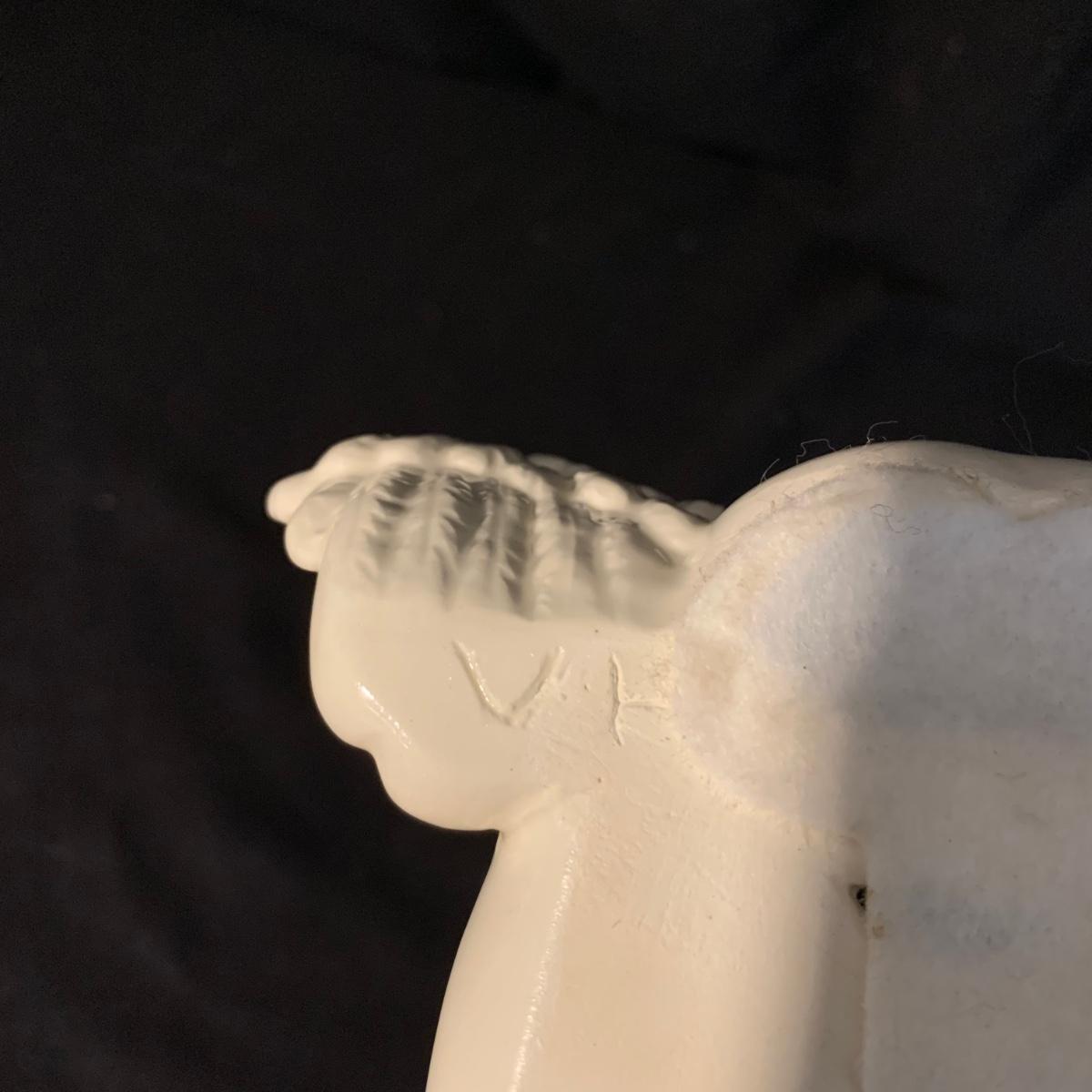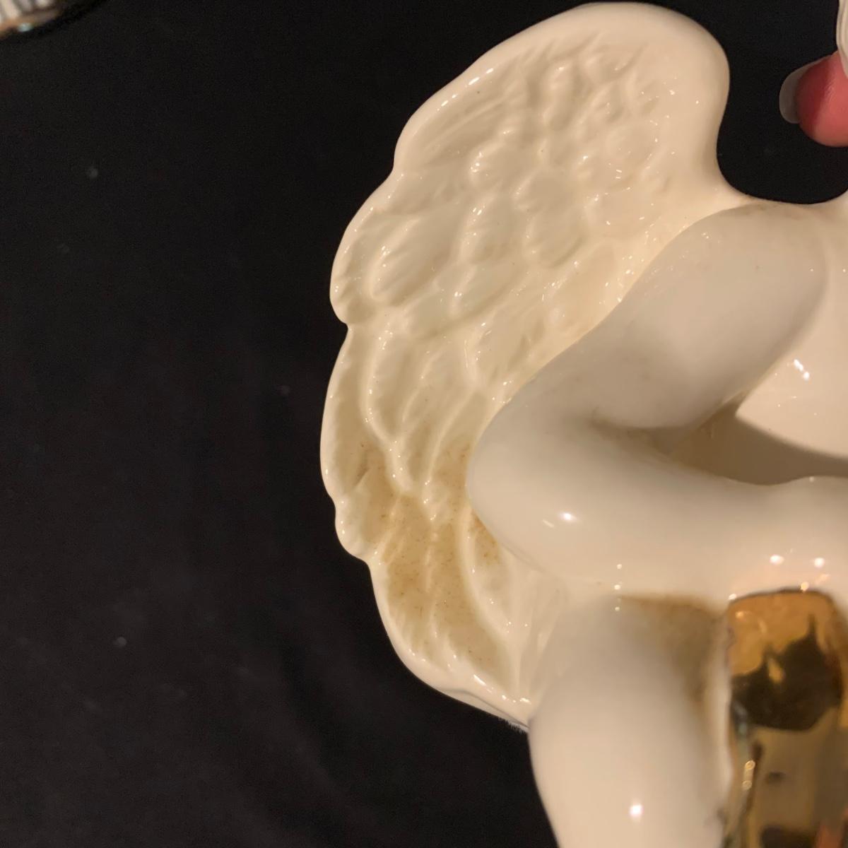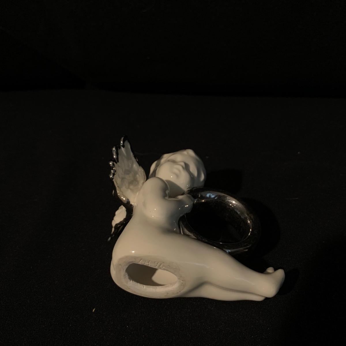 This lot includes a set of six angel napkin holders, one white and gold dove candle holder, and one white and gold angel figurine. Some of the pieces have discoloration (see photos). The angels have an artists signature of “VH”. The largest piece measures about 12in x 10in. Shipping available.