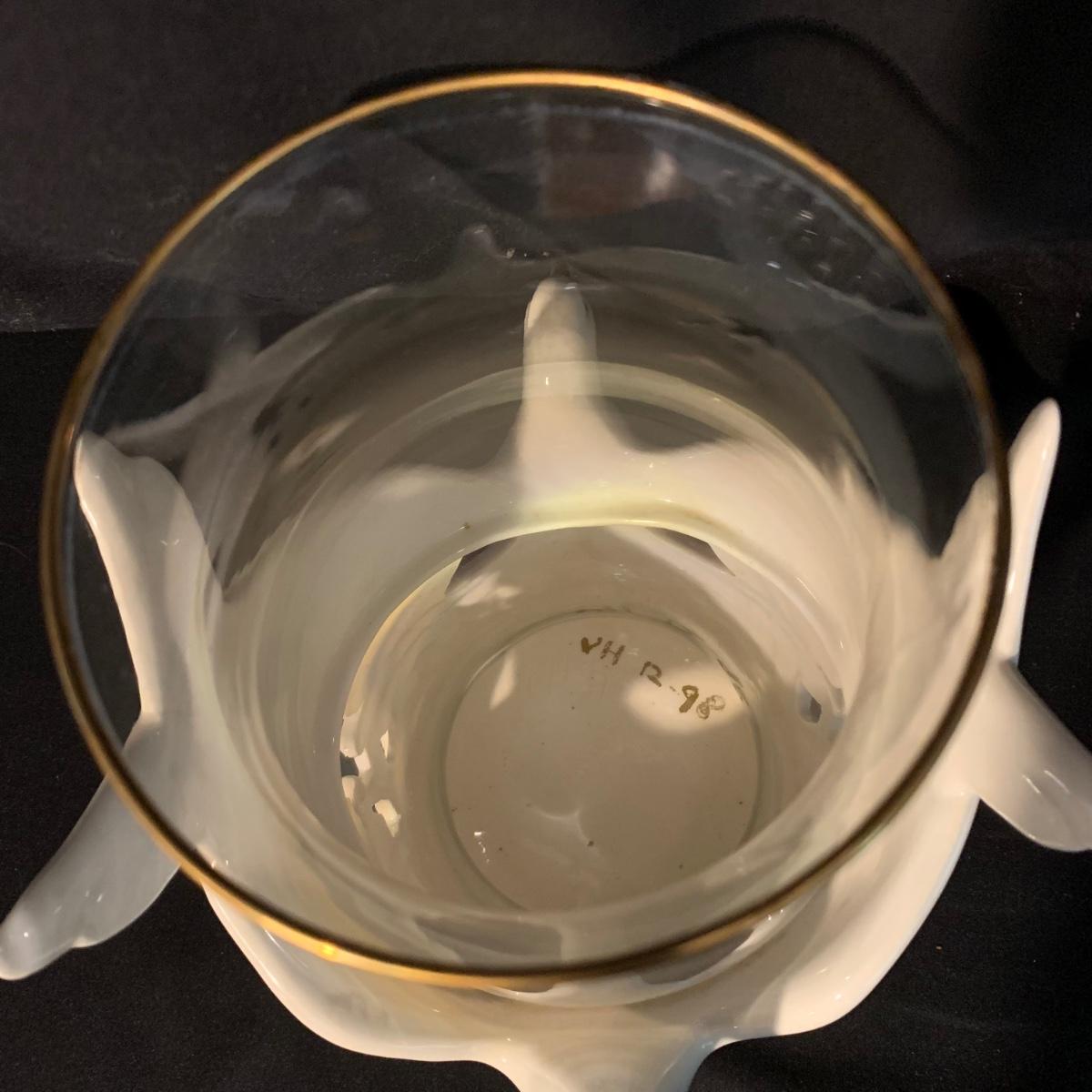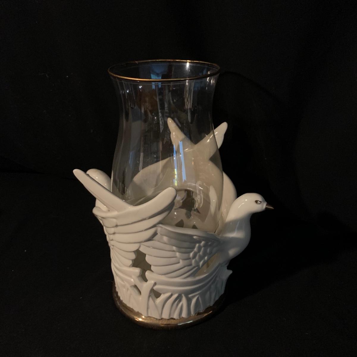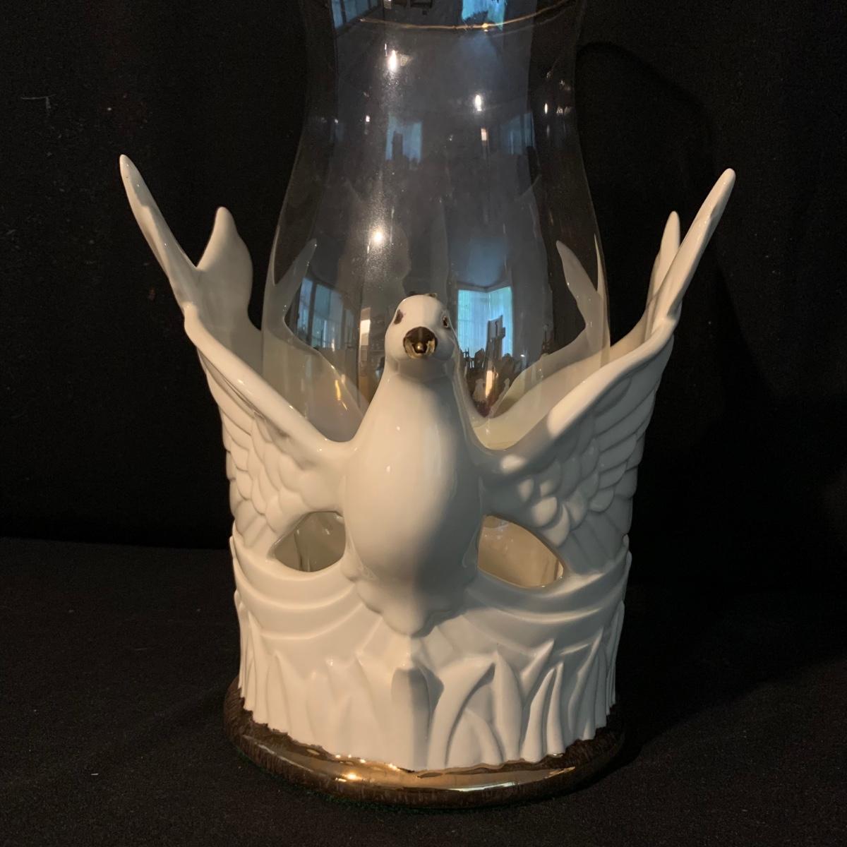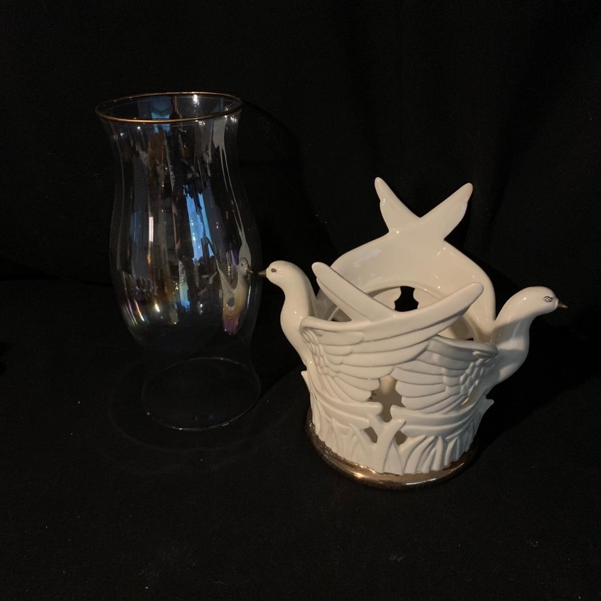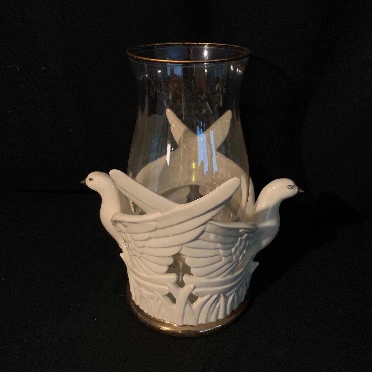 This lot includes a set of six angel napkin holders, one white and gold dove candle holder, and one white and gold angel figurine. Some of the pieces have discoloration (see photos). The angels have an artists signature of “VH”. The largest piece measures about 12in x 10in. Shipping available.