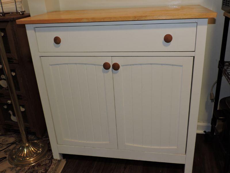 White and Oak Kitchen Storage, 17.5x35.5x36" Great condition. One drawer and 1 shelf inside. **Please read Terms and Conditions before placing a bid. Pick up is Thursday, August, 15 2019 from 4pm to 7pm or Sunday, August 18 from 11am-2pm in Mullica Hill. All sales are final. All sales are as is, where is. Please review all photos. Any props included in photos are not included in listing. All measurements are approximate.