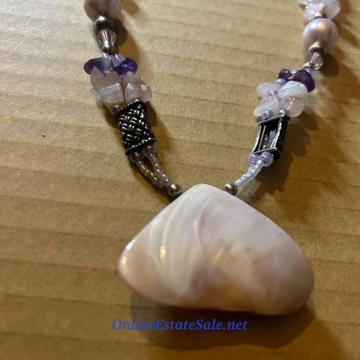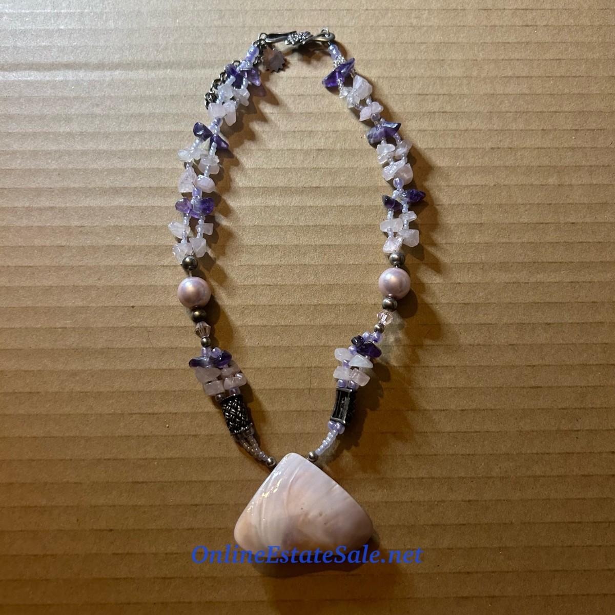 16in White and Purple Crystal Necklace with Pearl Detail and Shell Pendant