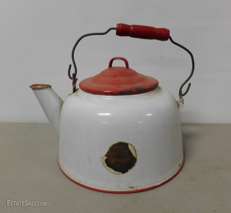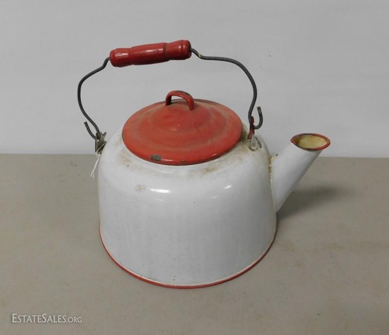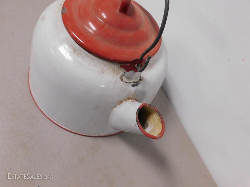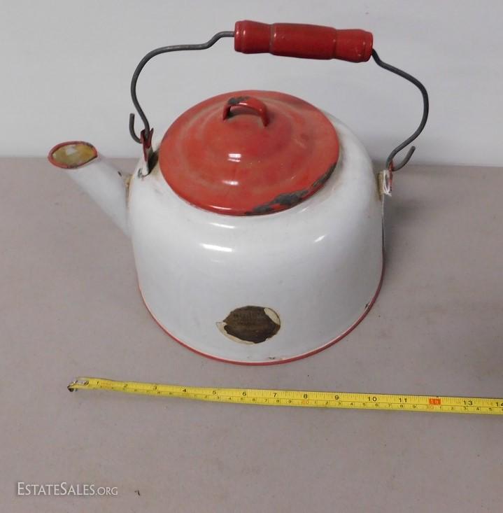 White and Red Enamel Kettle with wear and some missing enamel. Relic condition but above average for its age and use.