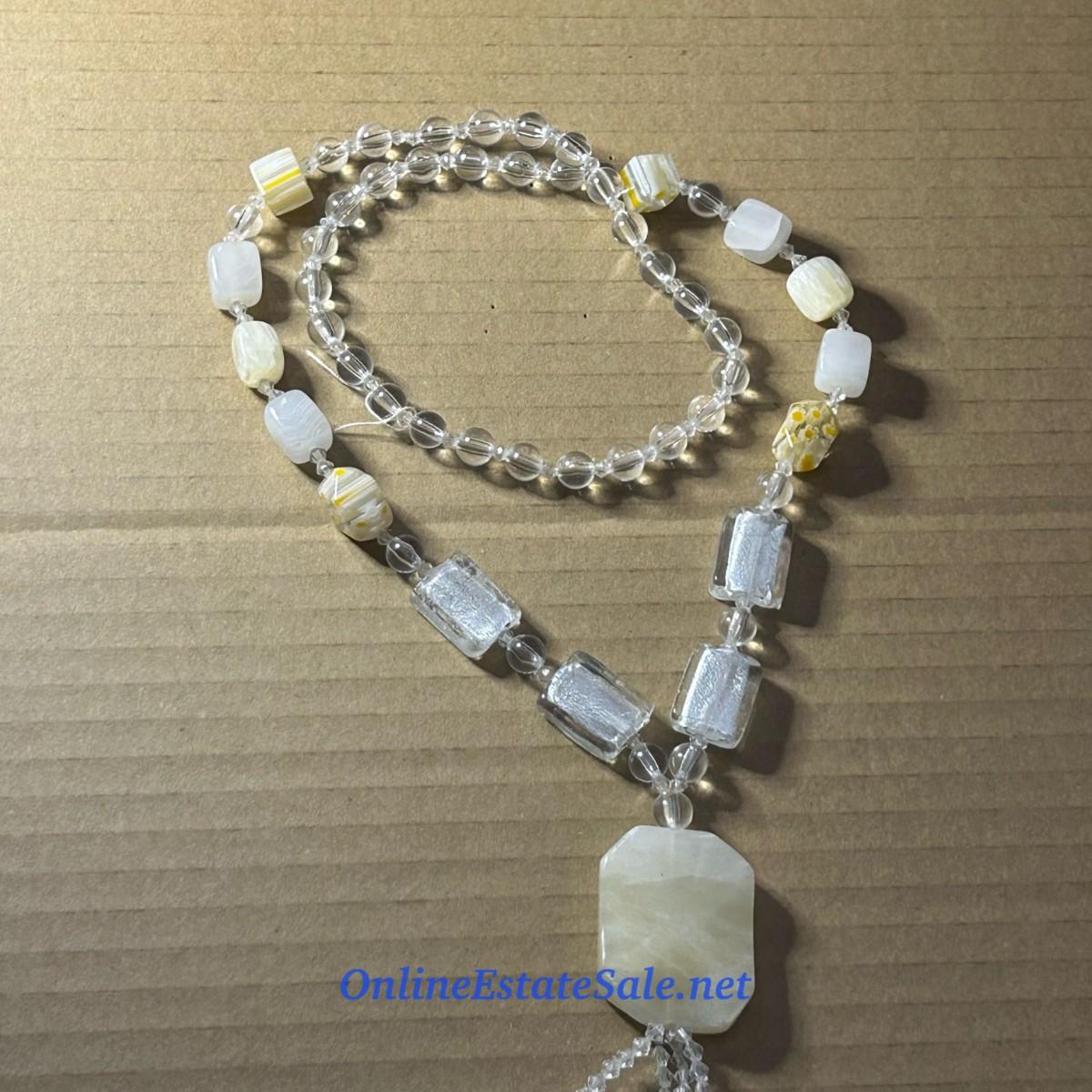 18in White, Yellow, and Clear Beaded Necklace with White Pendant