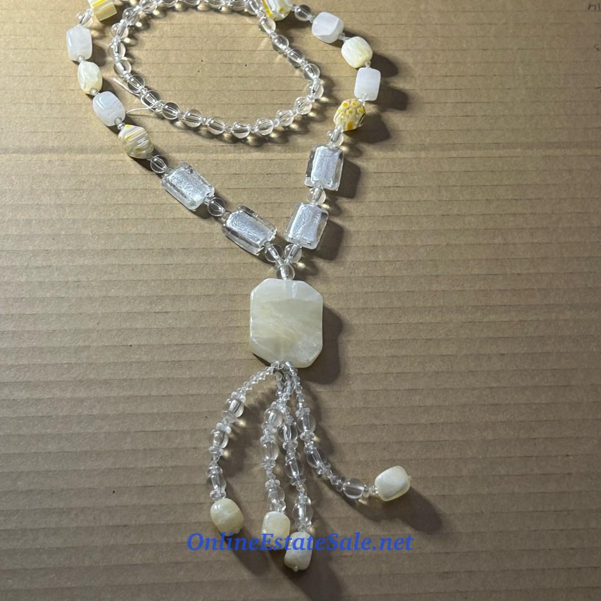 18in White, Yellow, and Clear Beaded Necklace with White Pendant