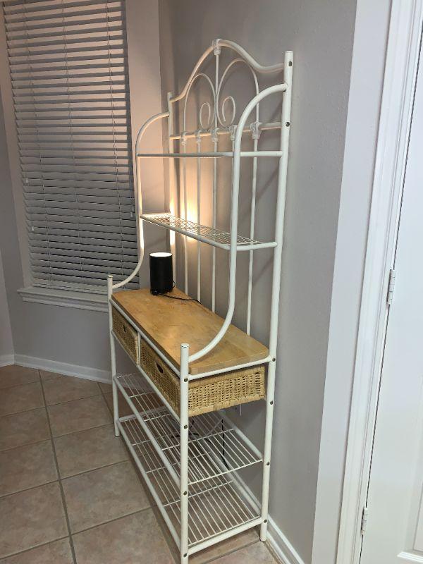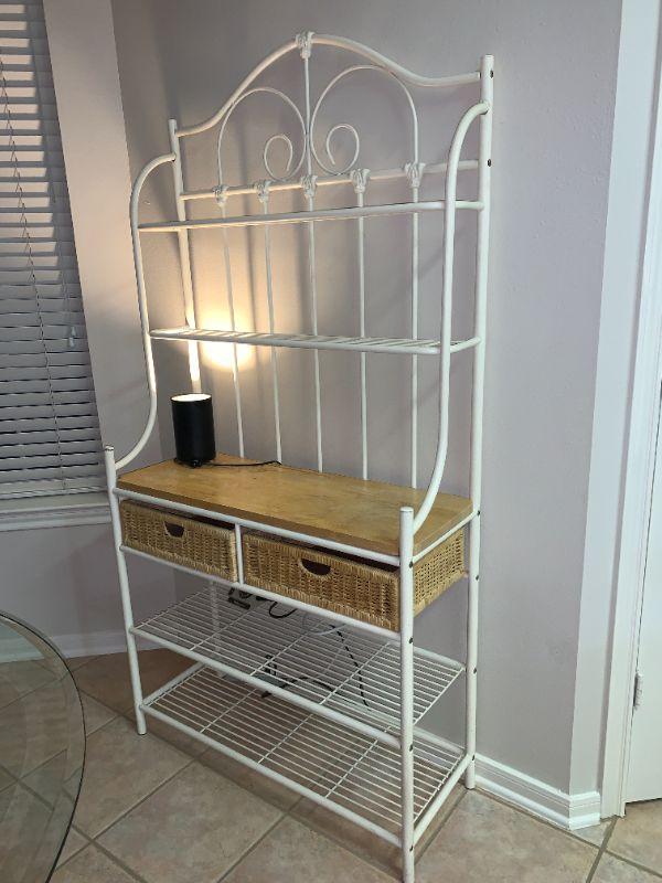 White Metal Bakers Rack with Wood Worktop and two wicker Slide-outs. Dimensions coming