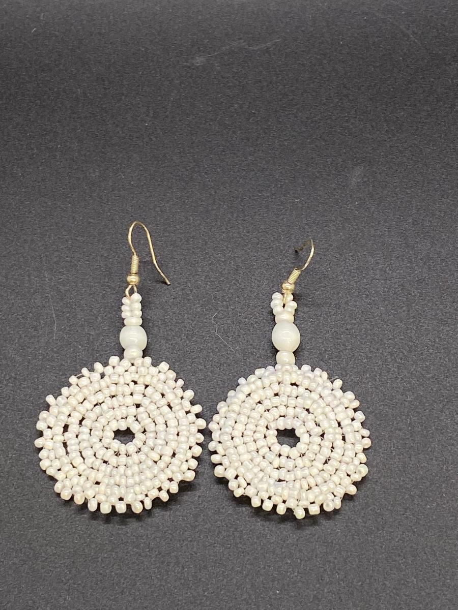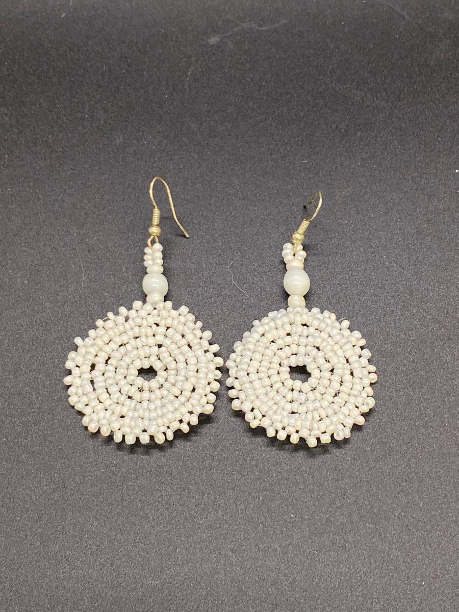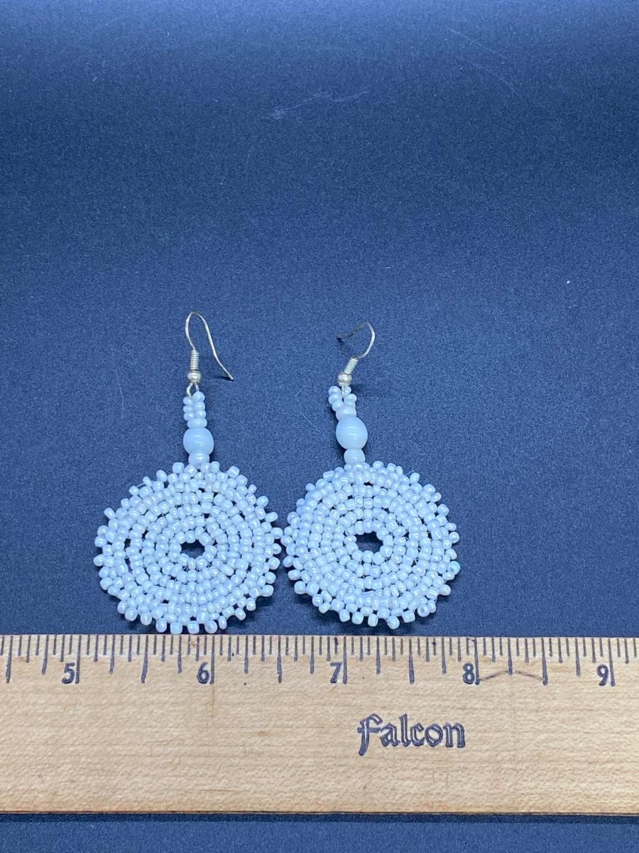 Pair of white beaded medallion earrings. For pierced ears. Good condition. A little over 1" wide.