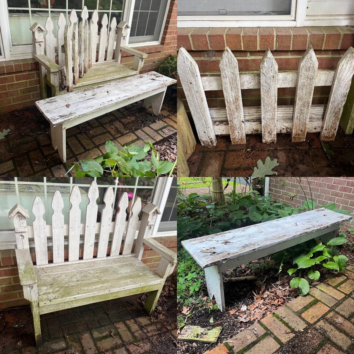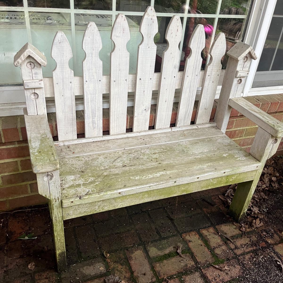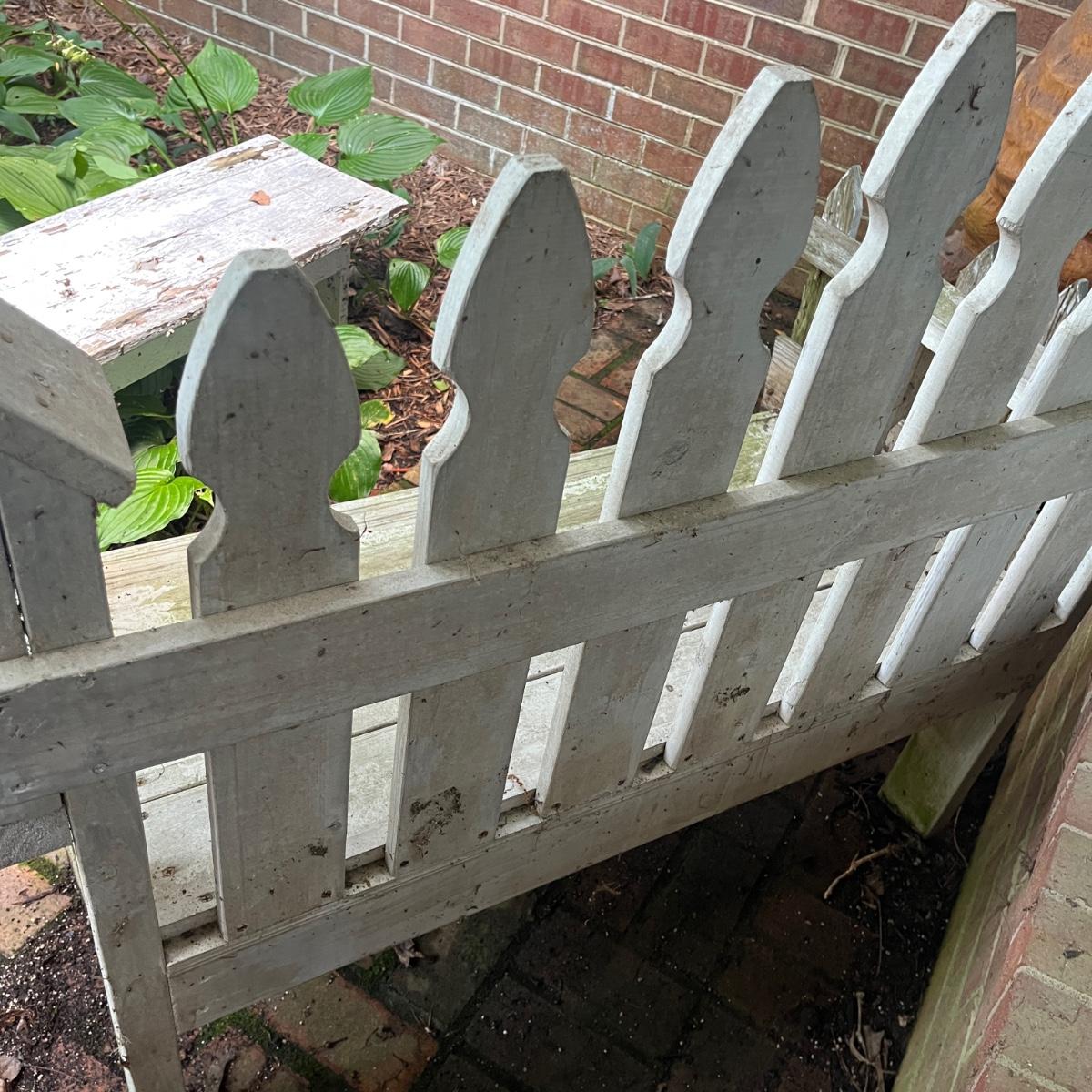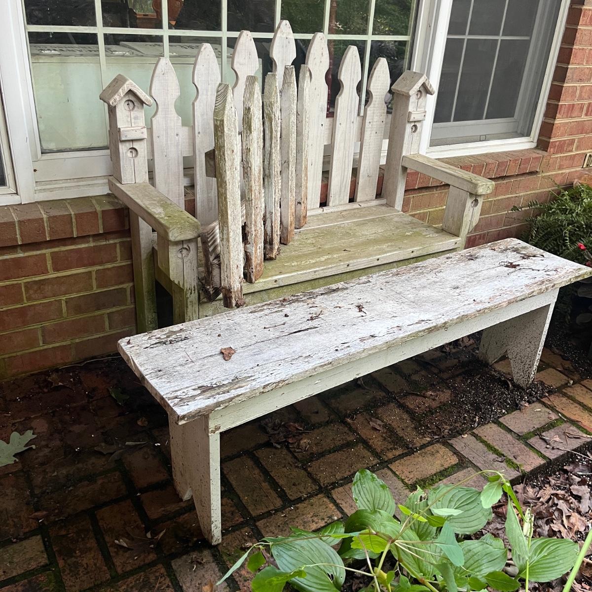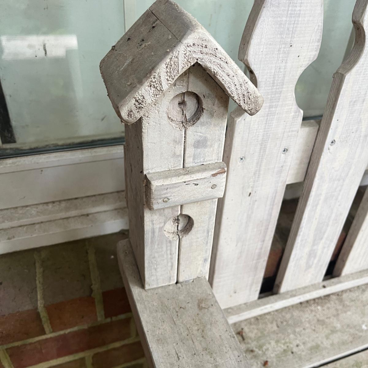 Lot includes a white wooden bench with birdhouse design, basic white wooden bench and a section of picket fence. Largest bench measures 45” x 18” x 42”H with a 17” seat height. Items show wear, which adds to their rustic charm.