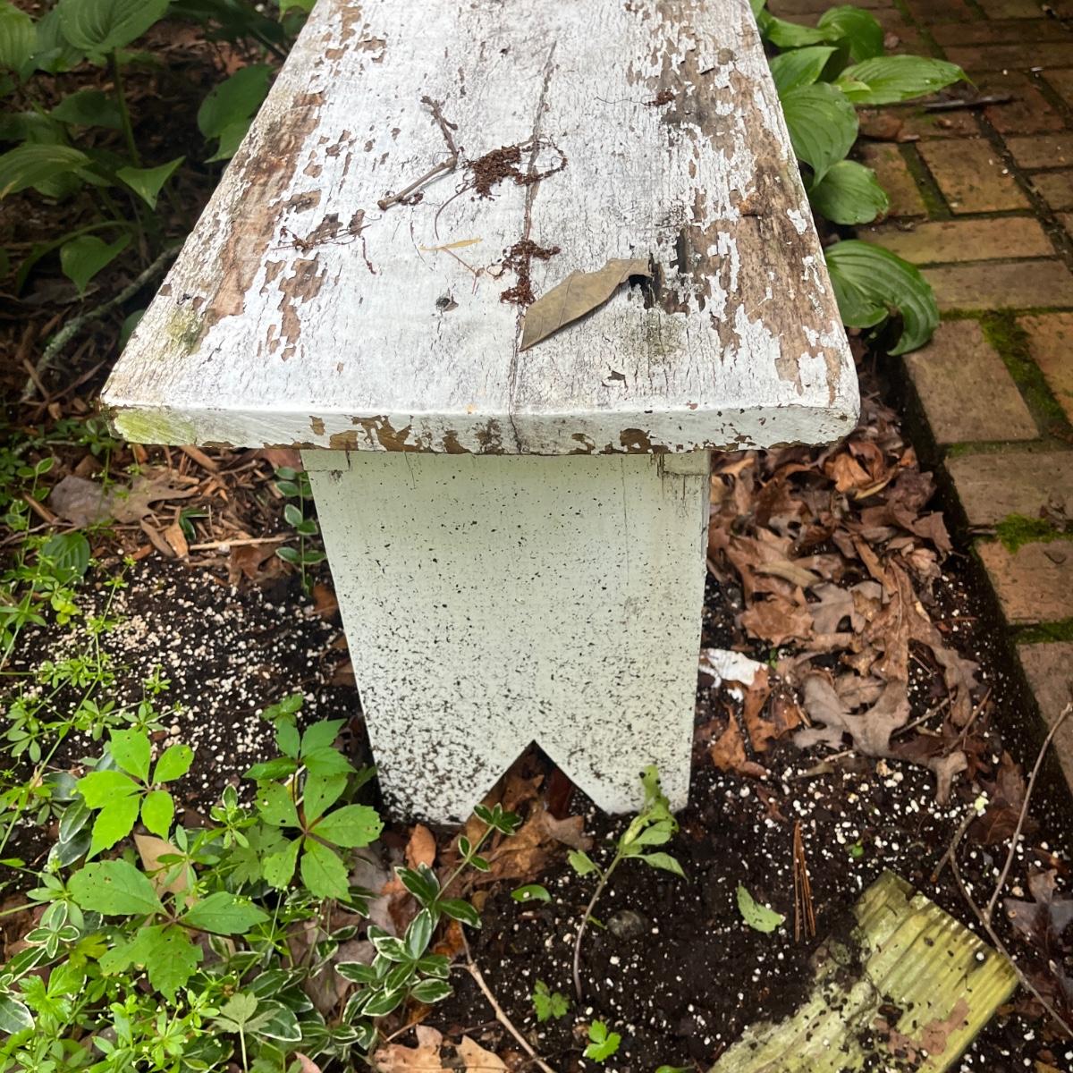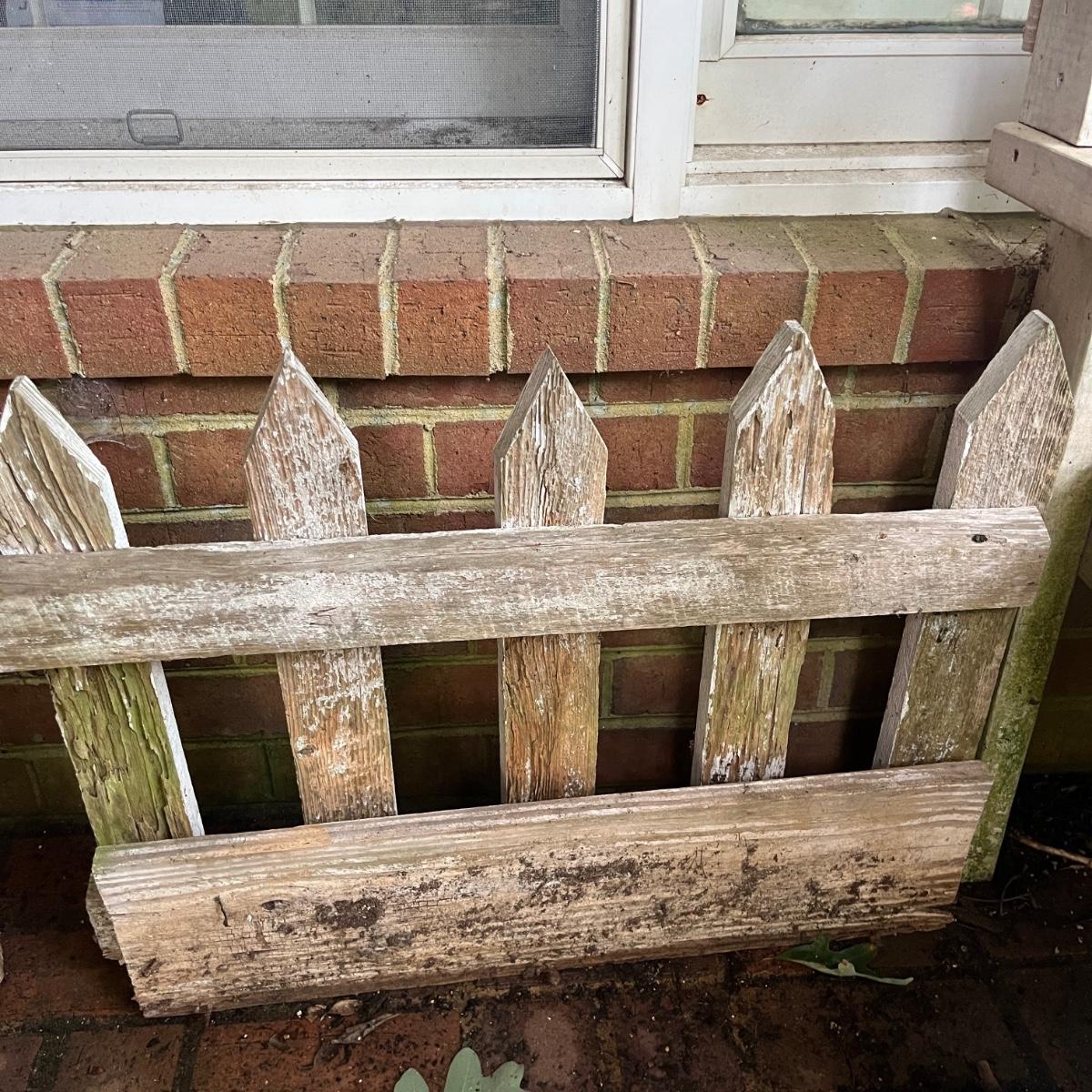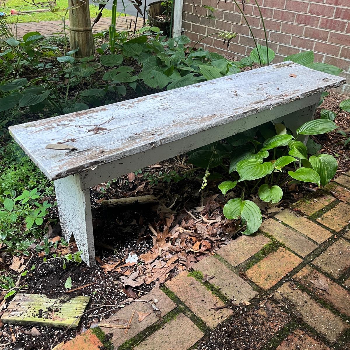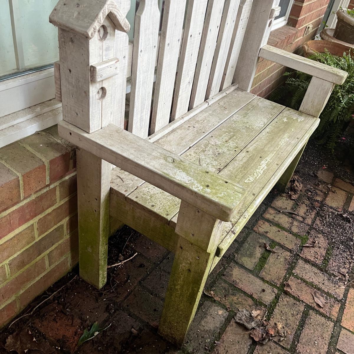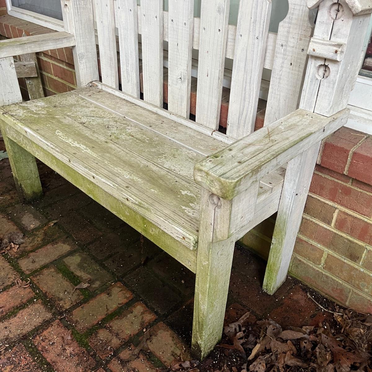 Lot includes a white wooden bench with birdhouse design, basic white wooden bench and a section of picket fence. Largest bench measures 45” x 18” x 42”H with a 17” seat height. Items show wear, which adds to their rustic charm.