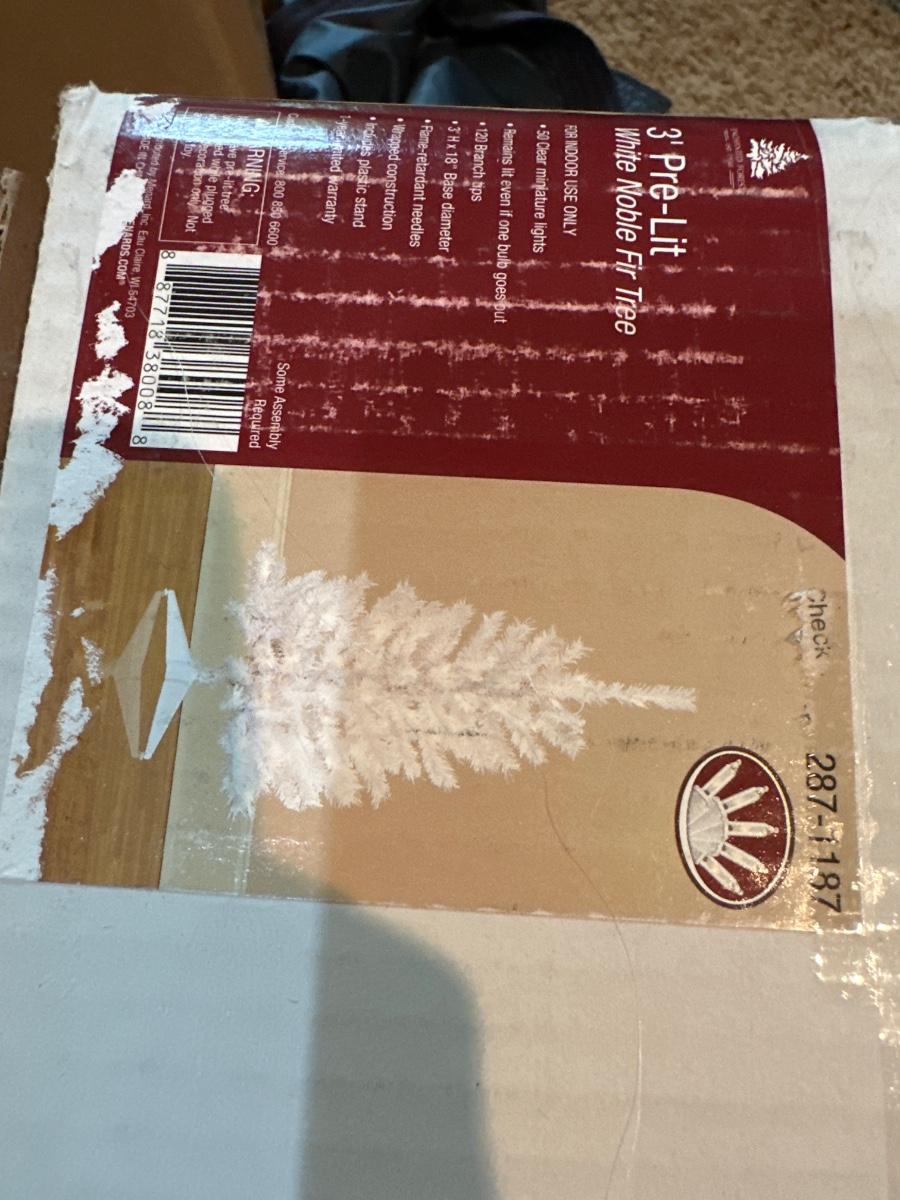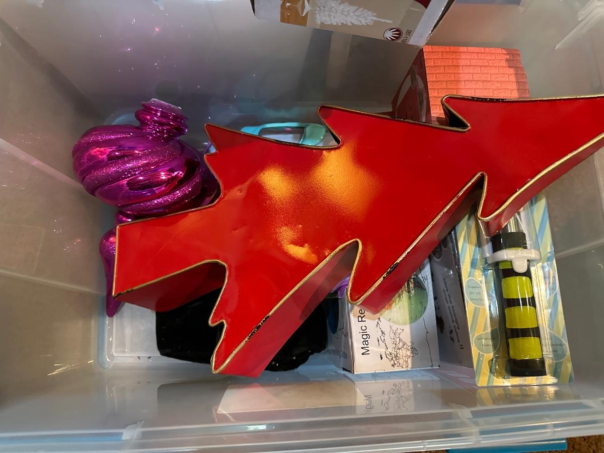 3 bins of Christmas items, a lamp post, and Christmas tree