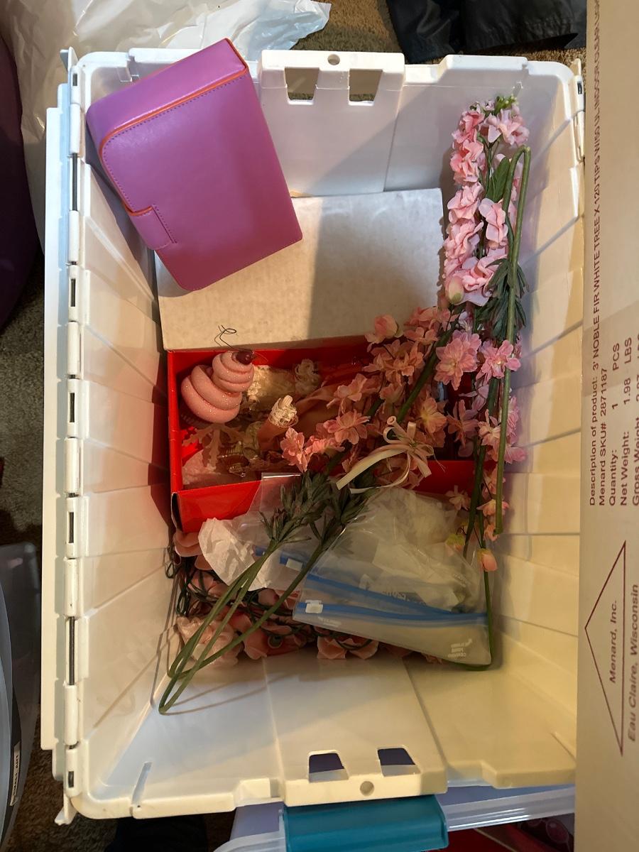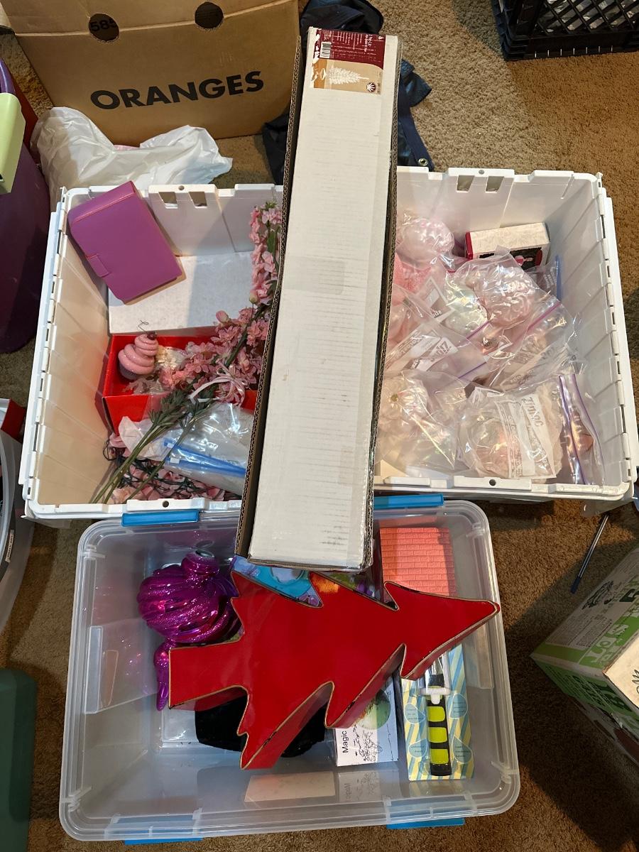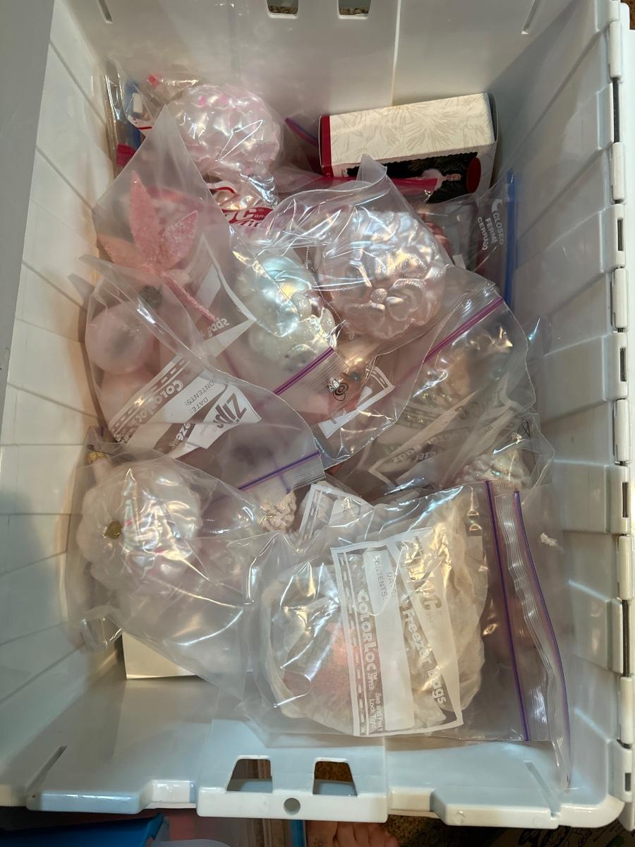 White Bins of pink Christmas ornaments, decorations, and white 3” tree