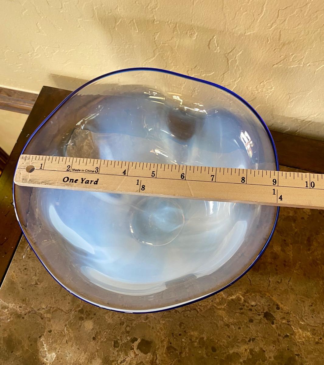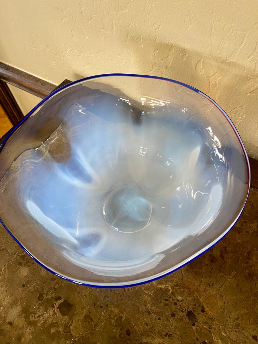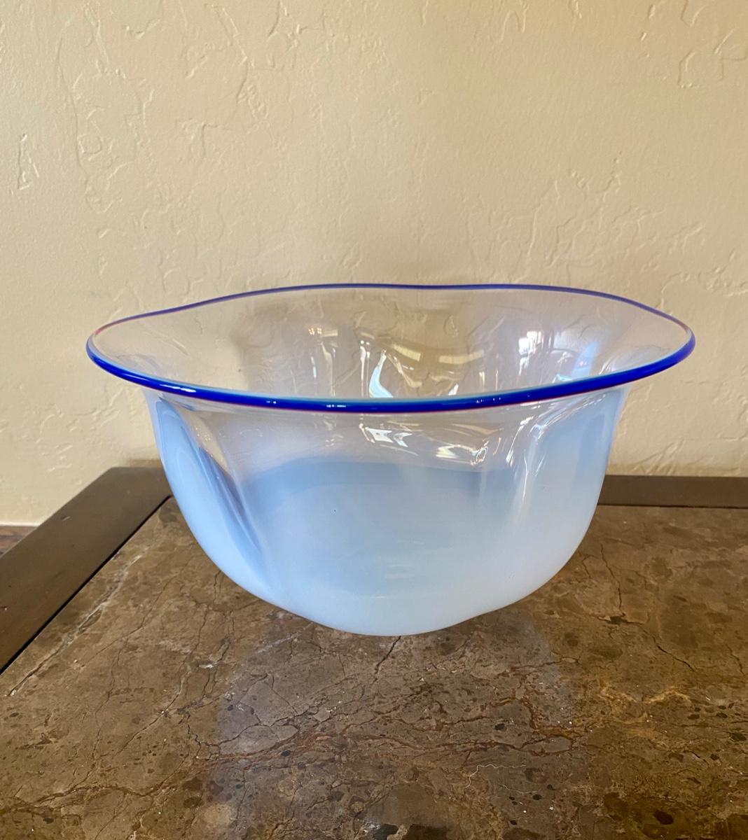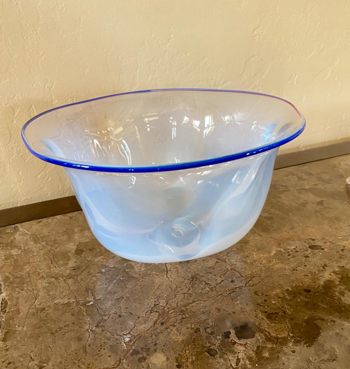 White Blown Glass Bowl with Blue Trim