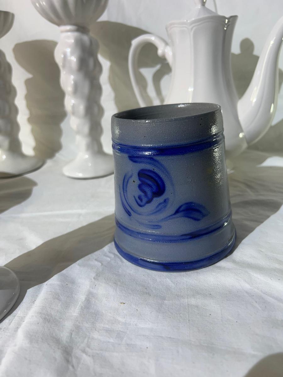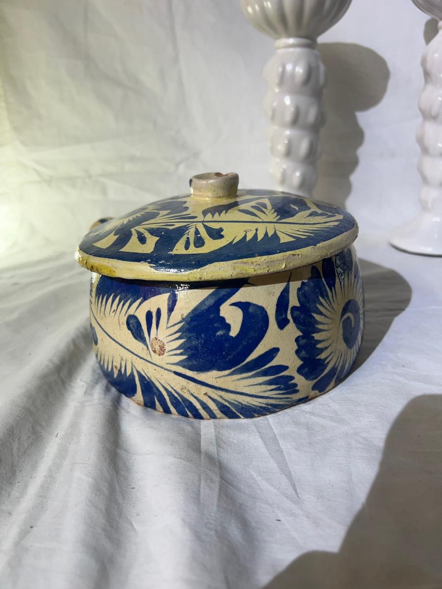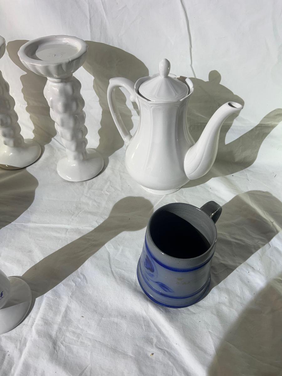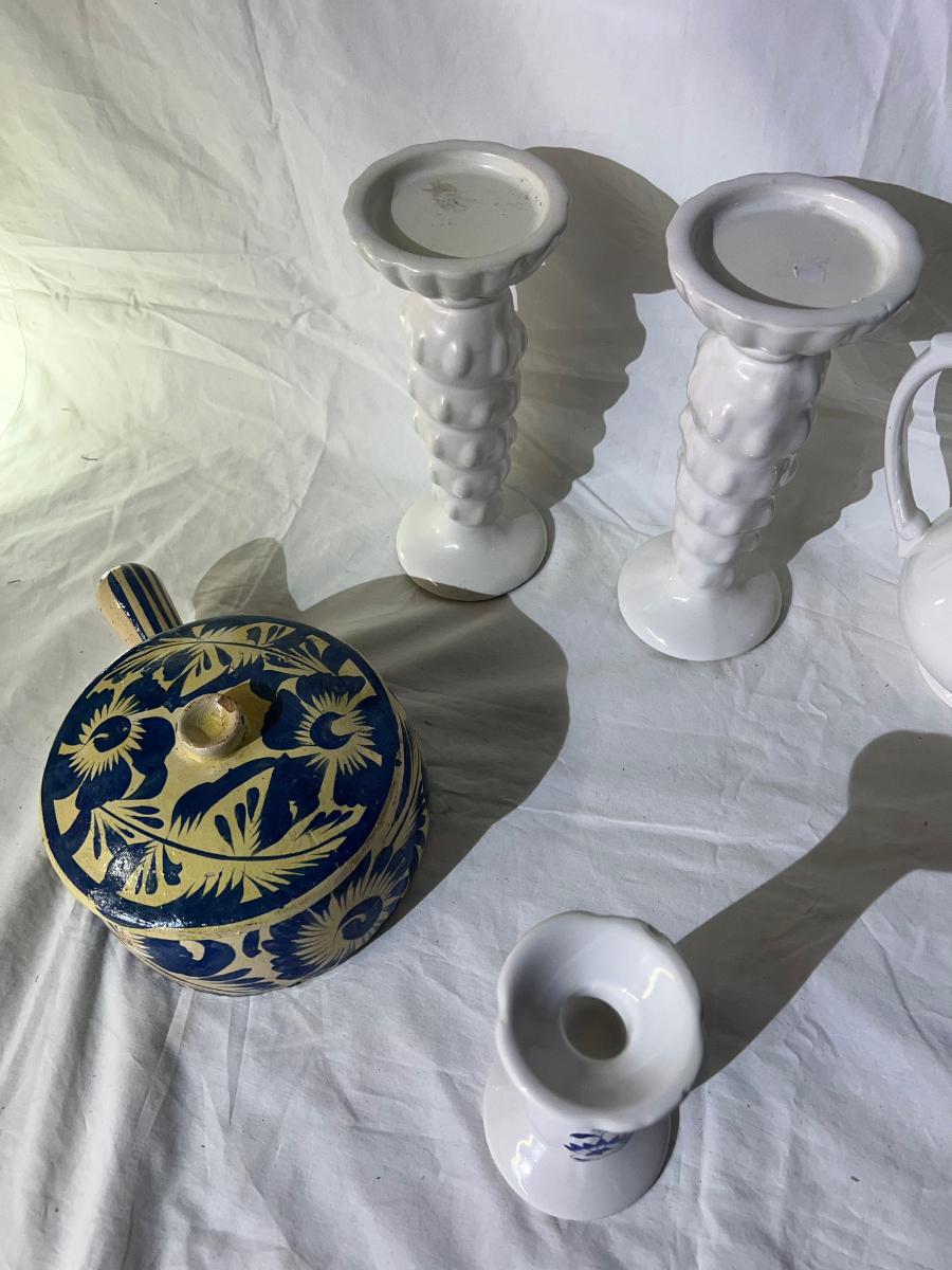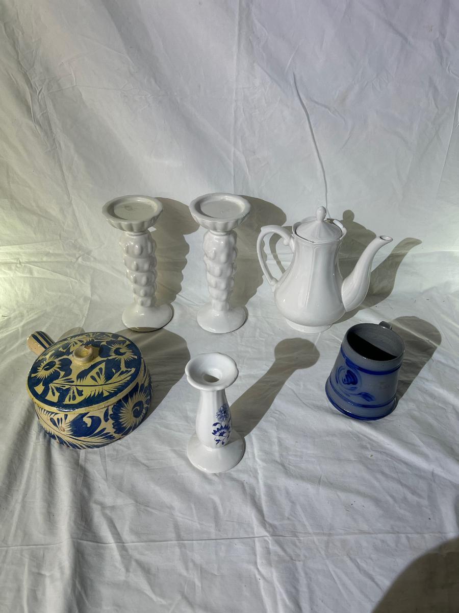 White & Blue Miscellaneous Household/ Kitchen goods. Candle holders, Mexican Bean pot, Tea kettle, and mug
