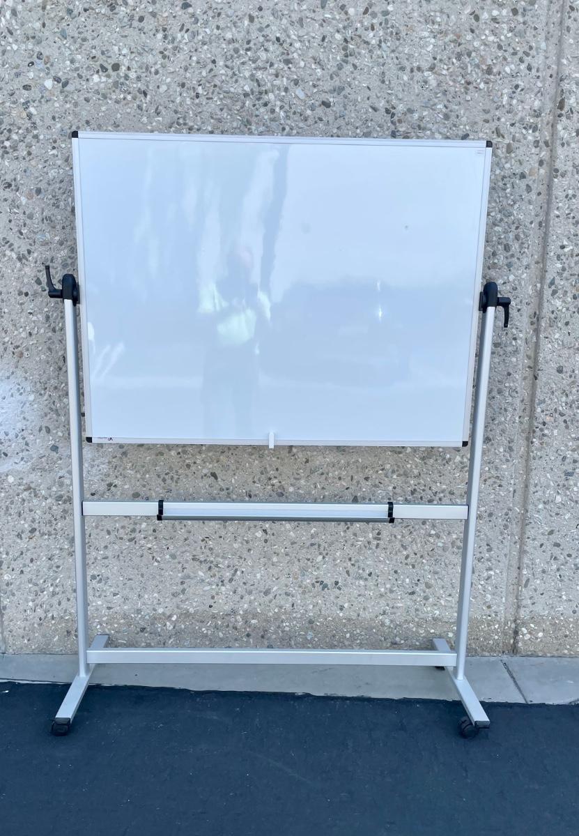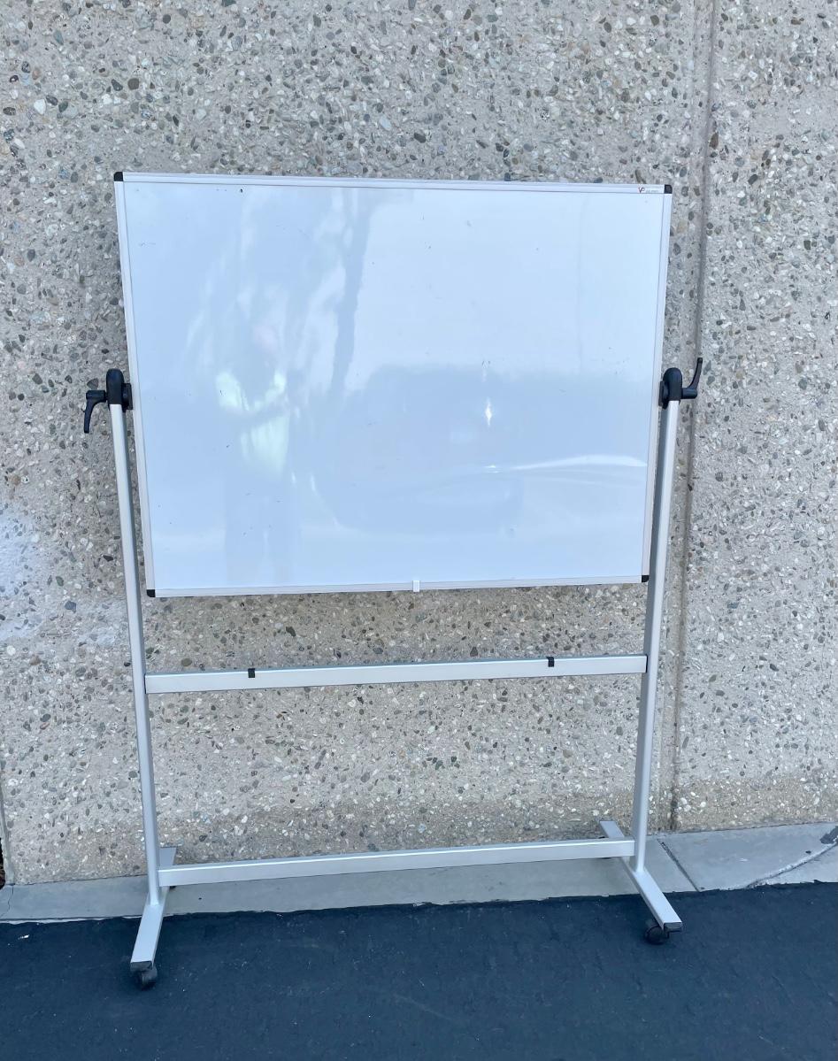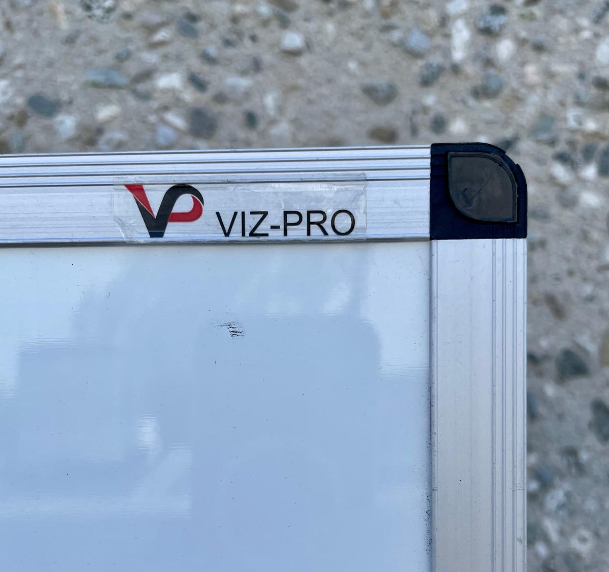 White Board can be flipped to view the back side. Board measures 48" x 36". Overall height is approx. 72". Clip-on metal tray for holding dry-erase markers and erasers. Made by VIZ-PRO. Note: Does not include dry-erase markers or eraser. There is a small indentation on one side of the white board, but this is mostly cosmetic and does not affect the use of the white board.