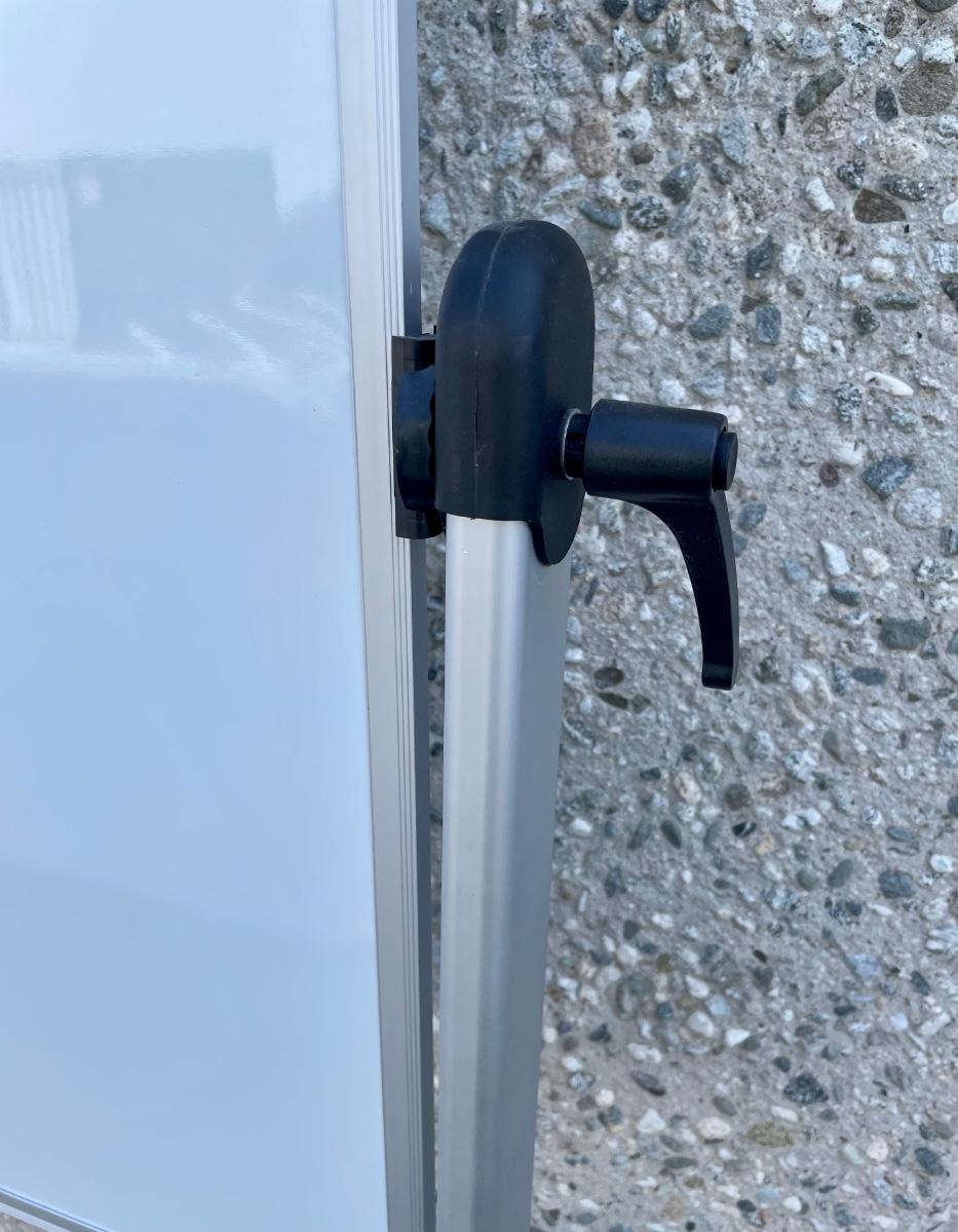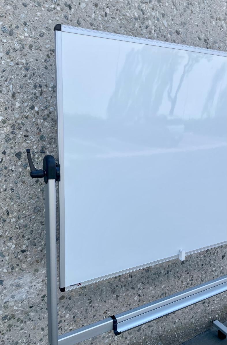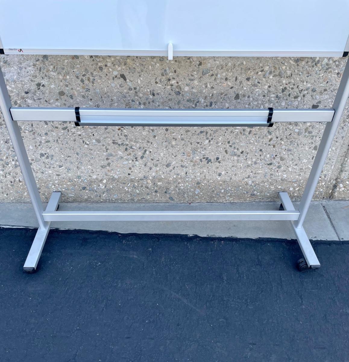 White Board can be flipped to view the back side. Board measures 48" x 36". Overall height is approx. 72". Clip-on metal tray for holding dry-erase markers and erasers. Made by VIZ-PRO. Note: Does not include dry-erase markers or eraser. There is a small indentation on one side of the white board, but this is mostly cosmetic and does not affect the use of the white board.