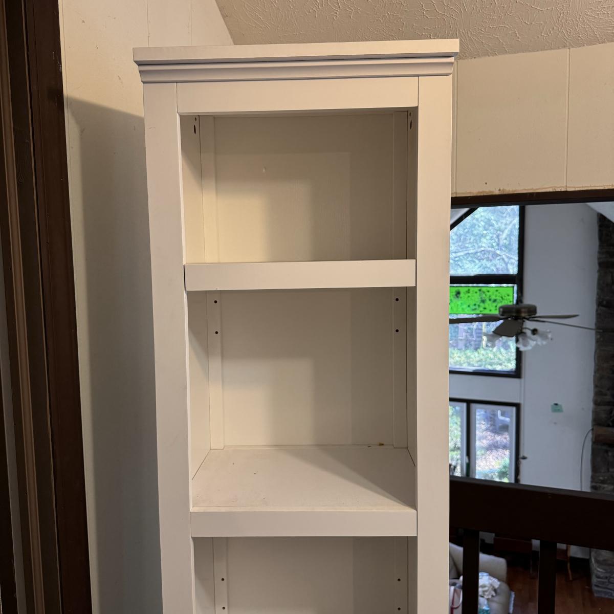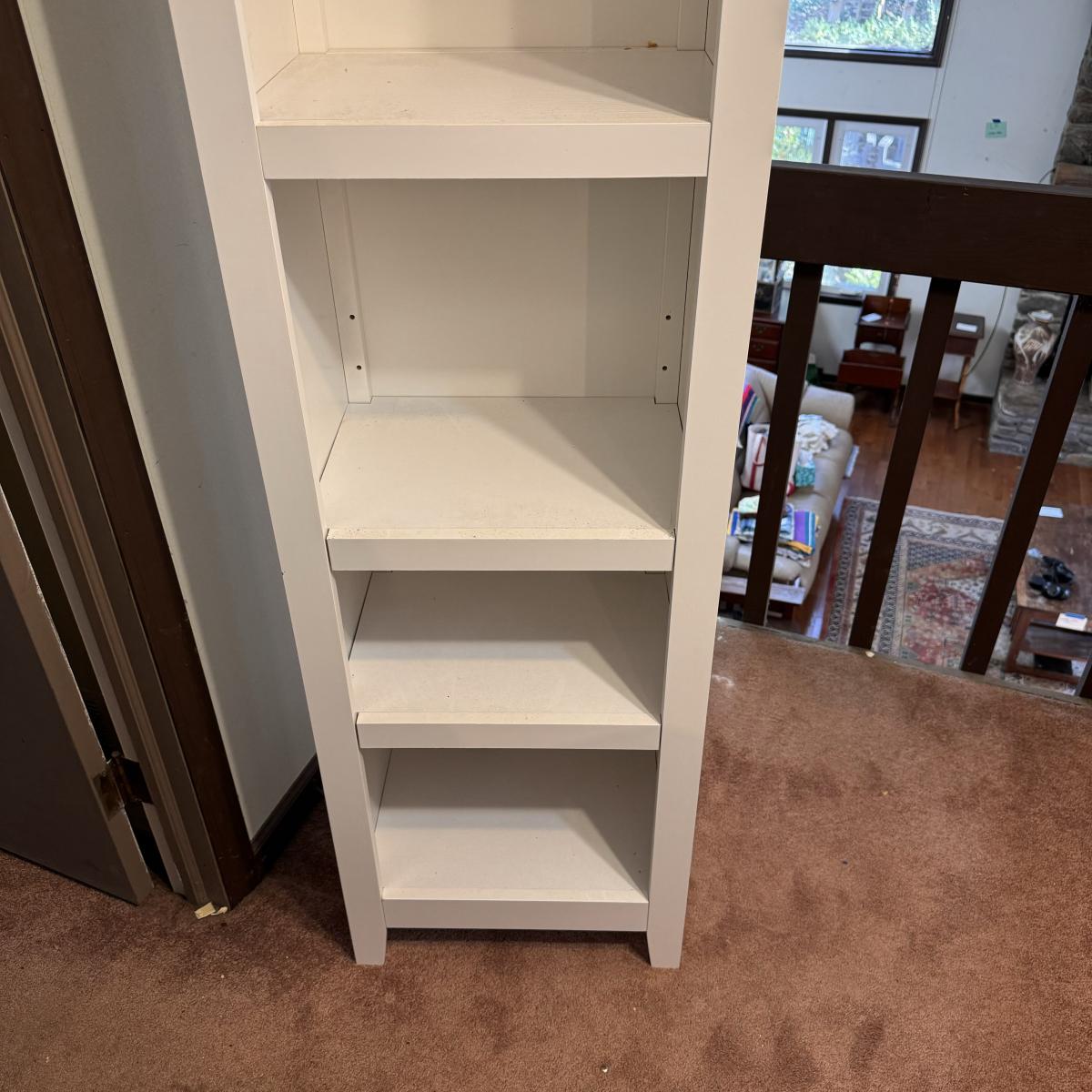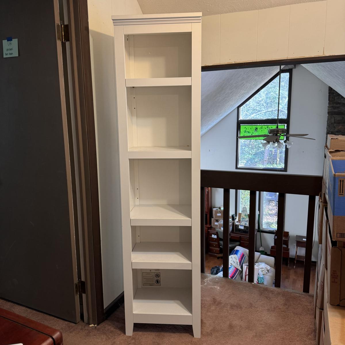 Lot includes one bookcase that is made by Target. It is wooden throughout, but has what appears to be thin plywood pieces on the sides and back. The shelves are inserted via pegs and are adjustable - see pictures. It measures 18” x 12” x 72”H. Local pickup only. Winning bidder must bring assistance to help move and load this item due to its weight and/or size. Item is located up a flight of stairs.