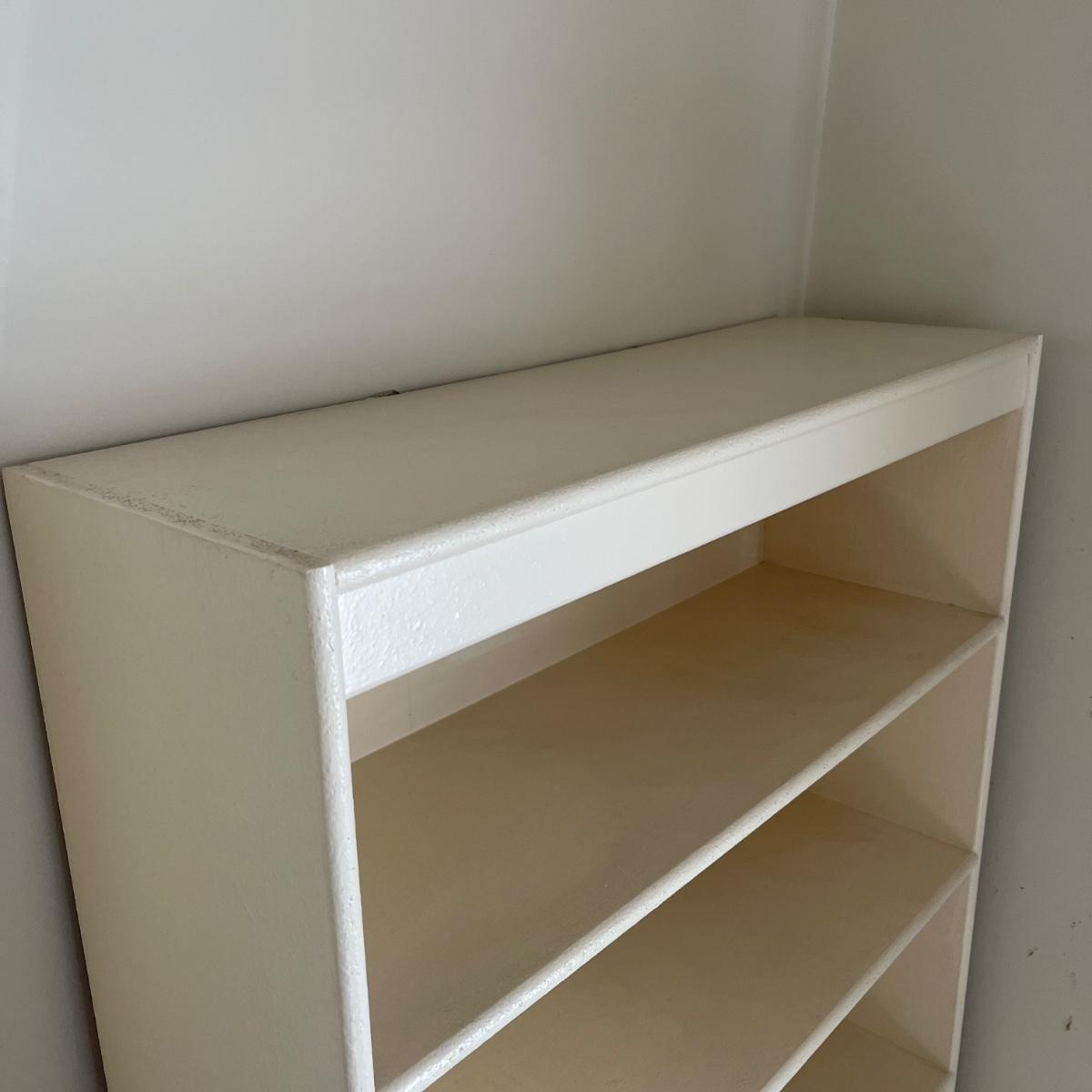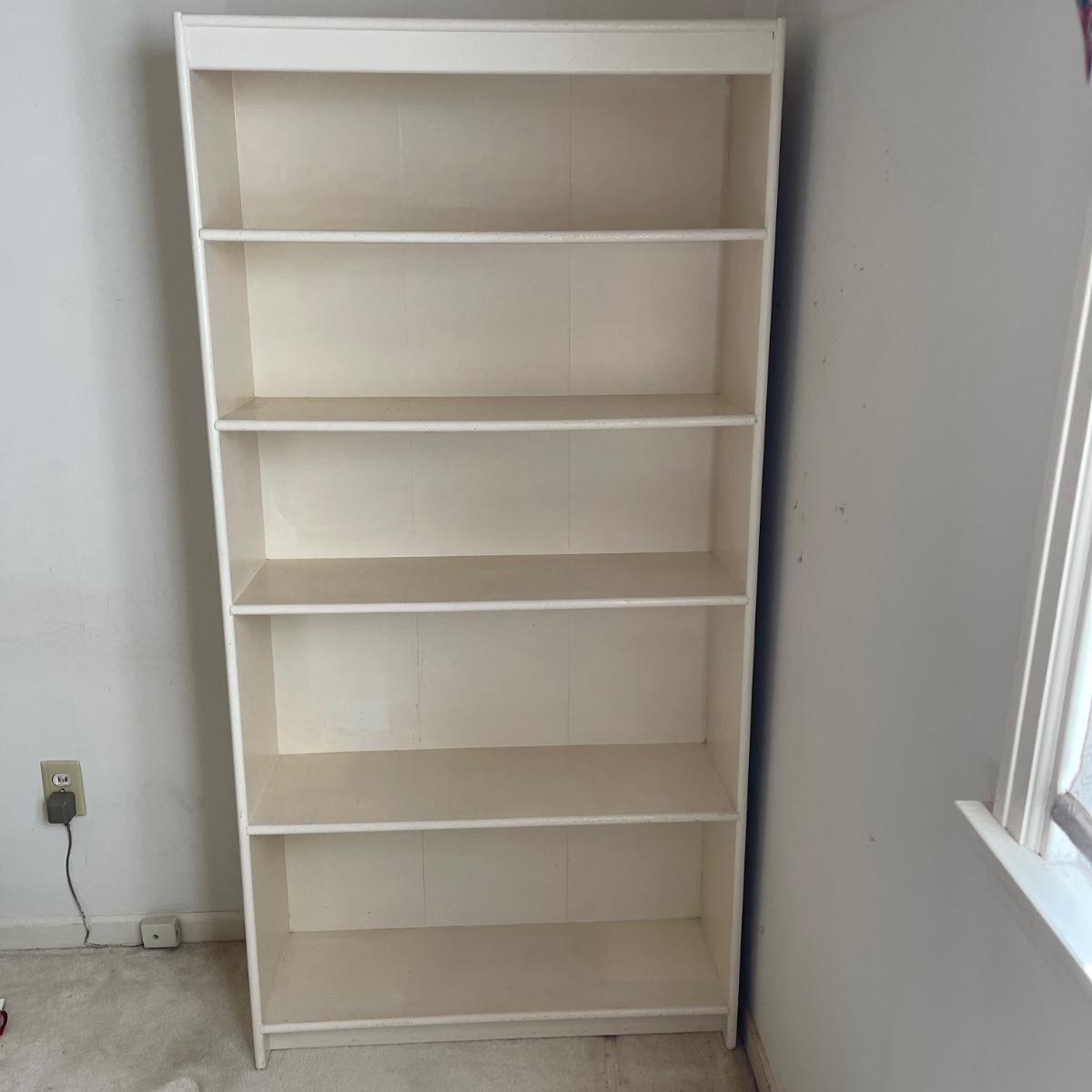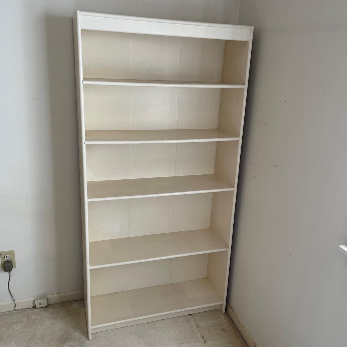 This bookshelf has five shelves and appears to be all wood except for the backing which appears to be a wood mix. The bookcase is very sturdy. It appears to have been painted over before. It measures 32 inches wide, 10.75 inches deep, and 64.5 inches tall. This bookshelf isn’t overly heavy and it appears to be solidly built. Local pick up only.