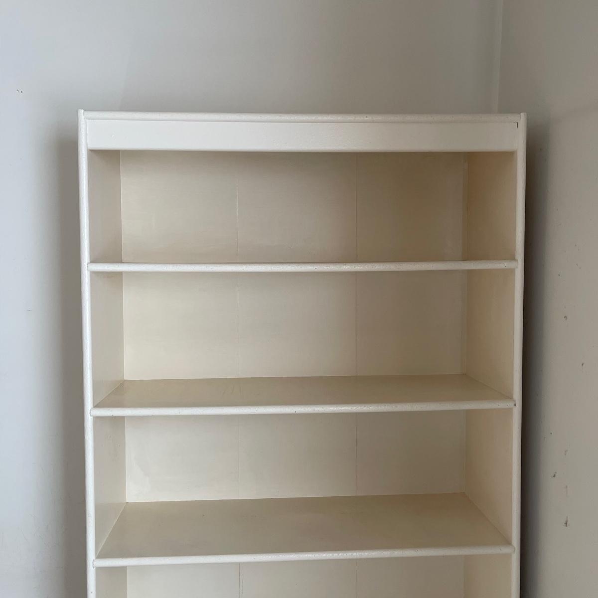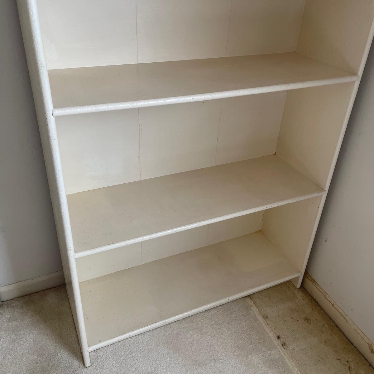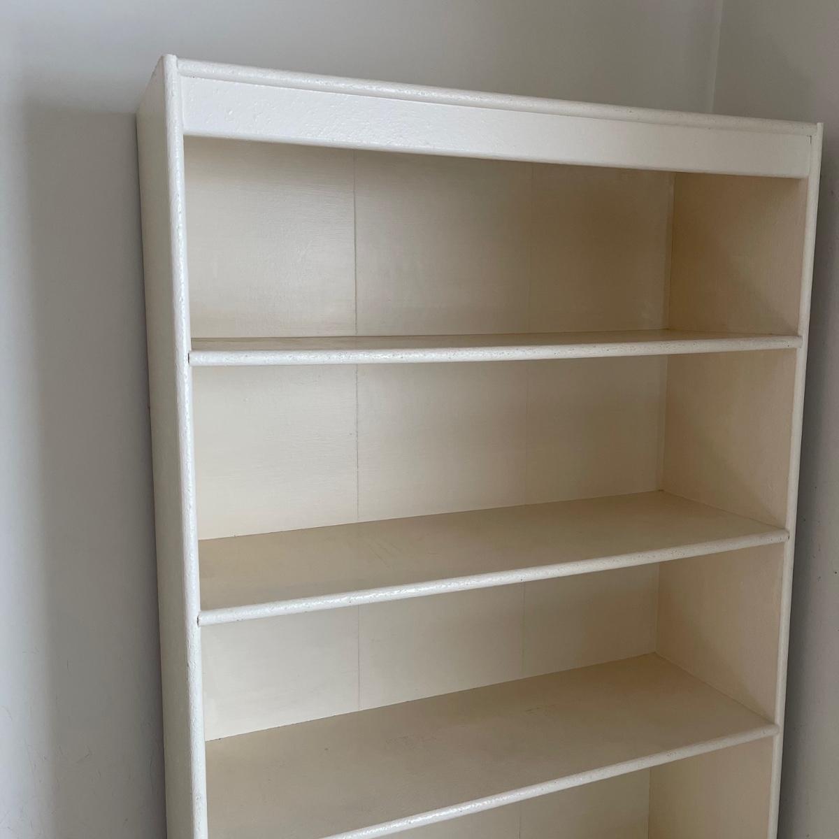 This bookshelf has five shelves and appears to be all wood except for the backing which appears to be a wood mix. The bookcase is very sturdy. It appears to have been painted over before. It measures 32 inches wide, 10.75 inches deep, and 64.5 inches tall. This bookshelf isn’t overly heavy and it appears to be solidly built. Local pick up only.