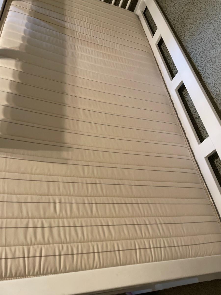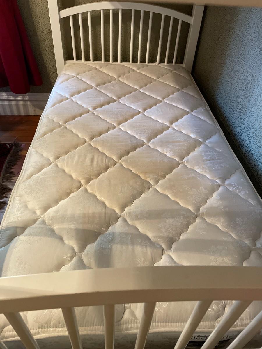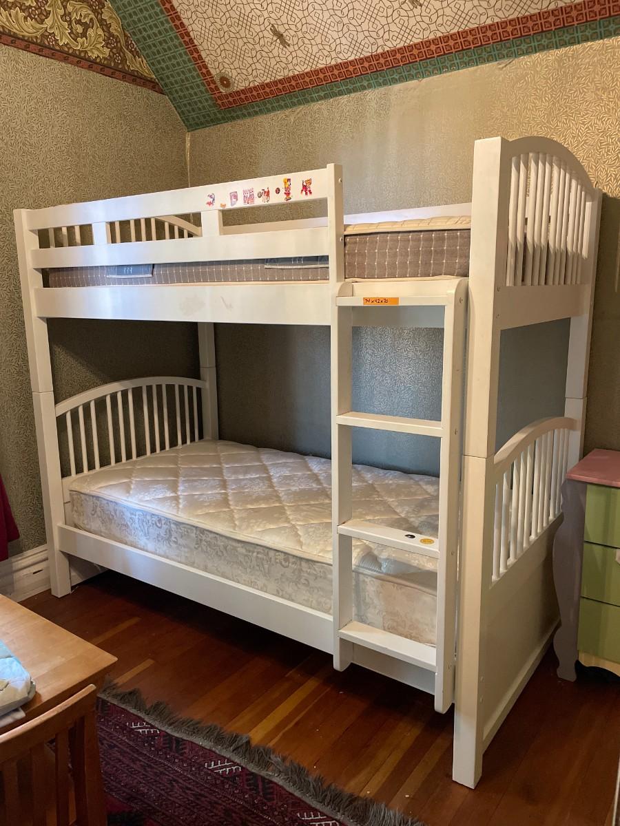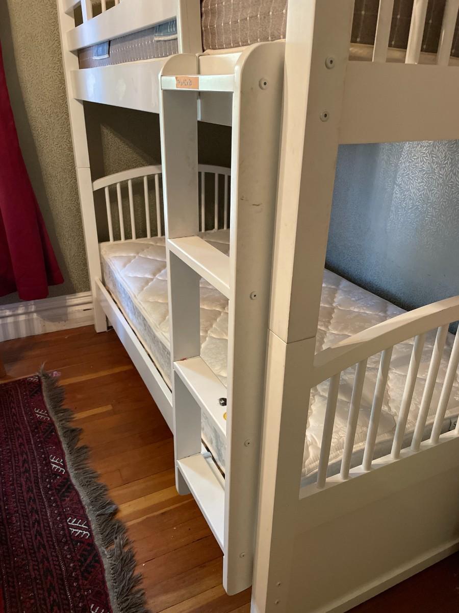 Twin Bed with safety rails on top bunk and ladder. Can configure into 2 twin-sized beds. Free mattresses