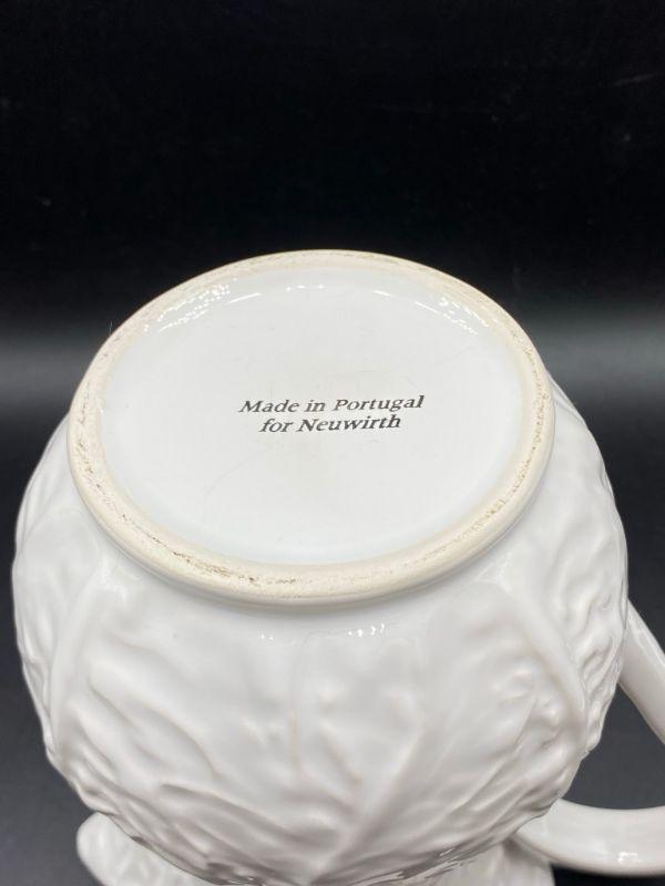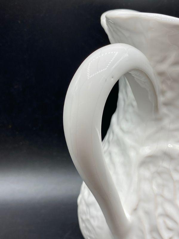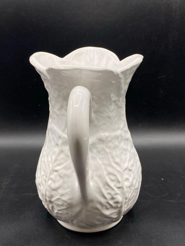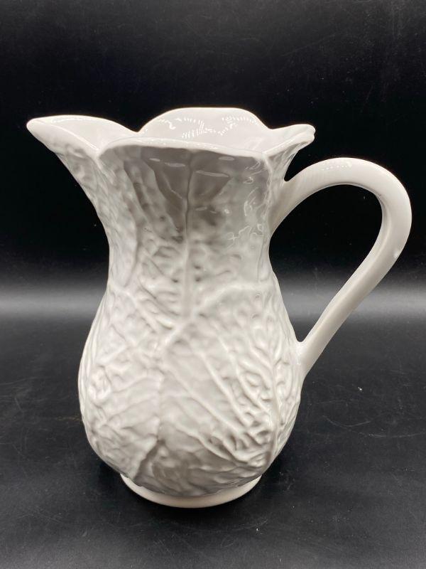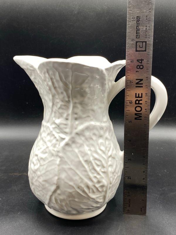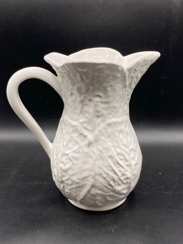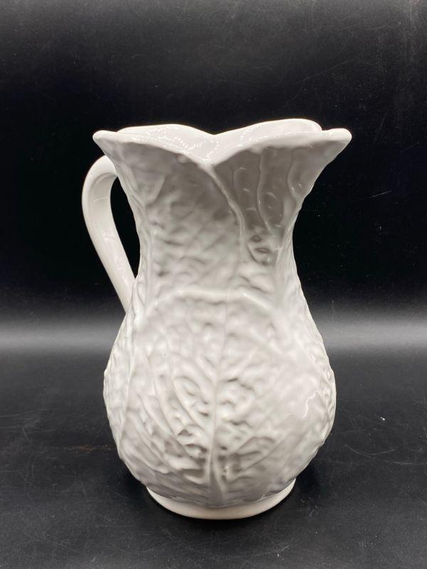 Bright white cabbage leaf water pitcher. Made in Portugal for Neuwirth. Stands 8". Good condition, no chips but there is crazing.