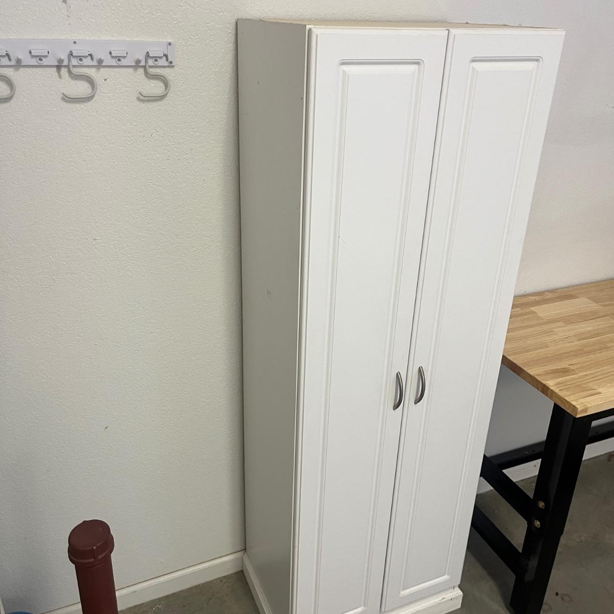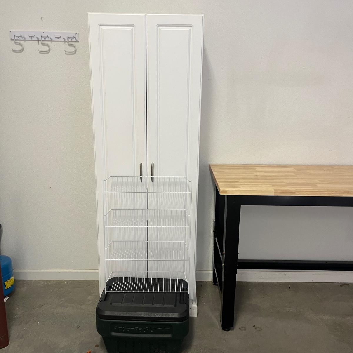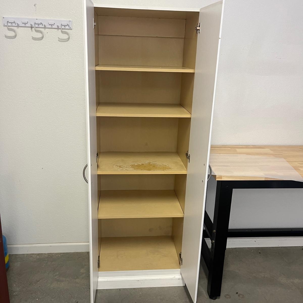 Lot includes a white pressed wood cabinet with five shelves with three being adjustable. Also includes a Rubbermaid tub and a plastic coated metal shelf. Cabinet measures 24” x 17” x 71”H. One shelf on cabinet has scratches and what appears to be something spilled on it, see pictures.