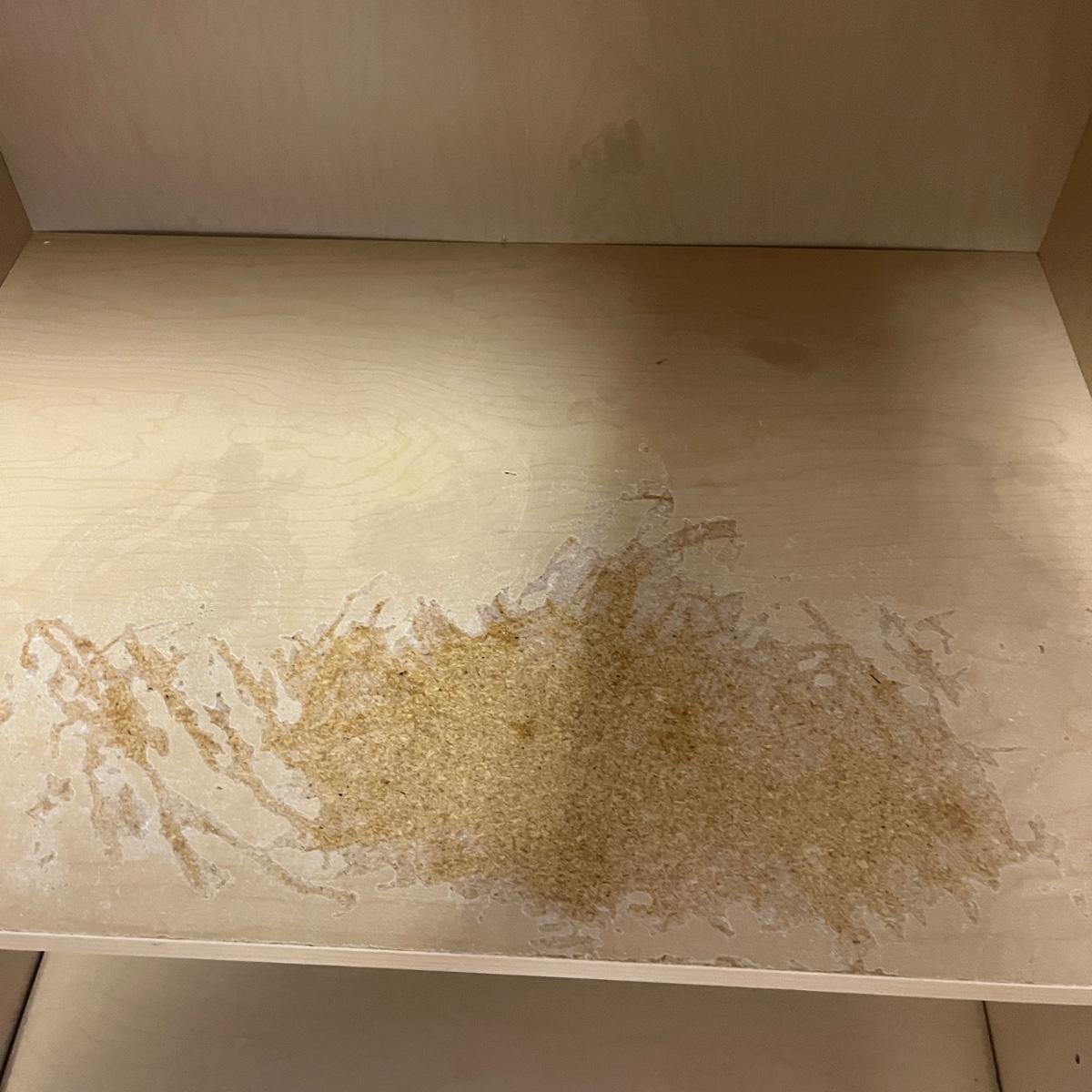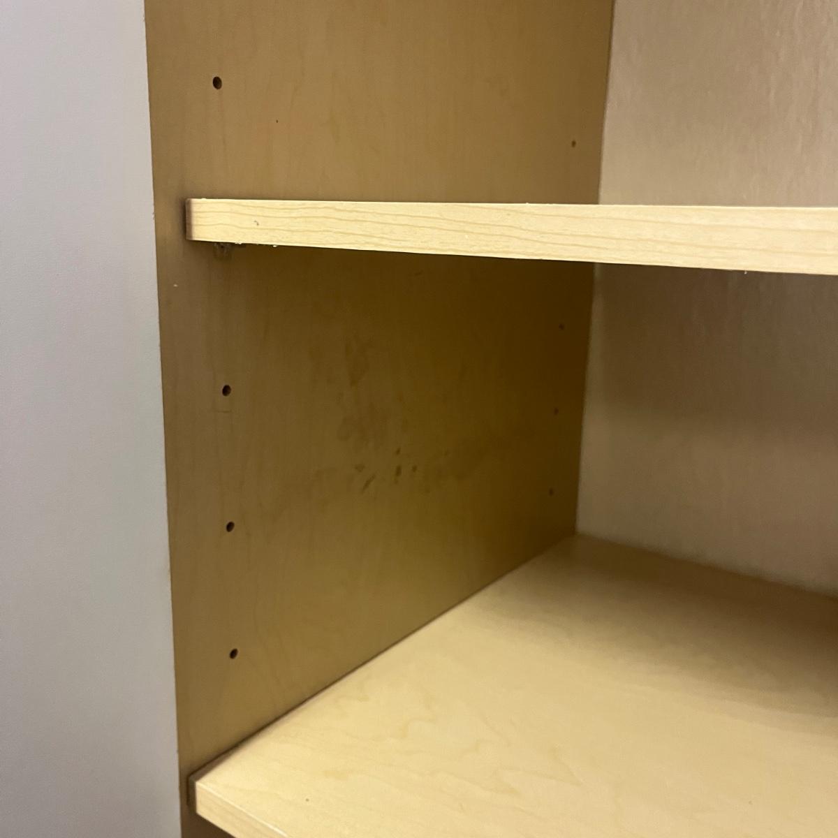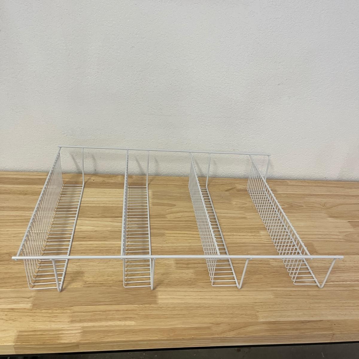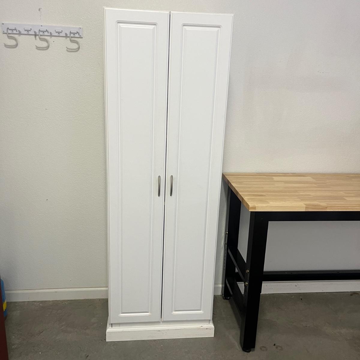 Lot includes a white pressed wood cabinet with five shelves with three being adjustable. Also includes a Rubbermaid tub and a plastic coated metal shelf. Cabinet measures 24” x 17” x 71”H. One shelf on cabinet has scratches and what appears to be something spilled on it, see pictures.