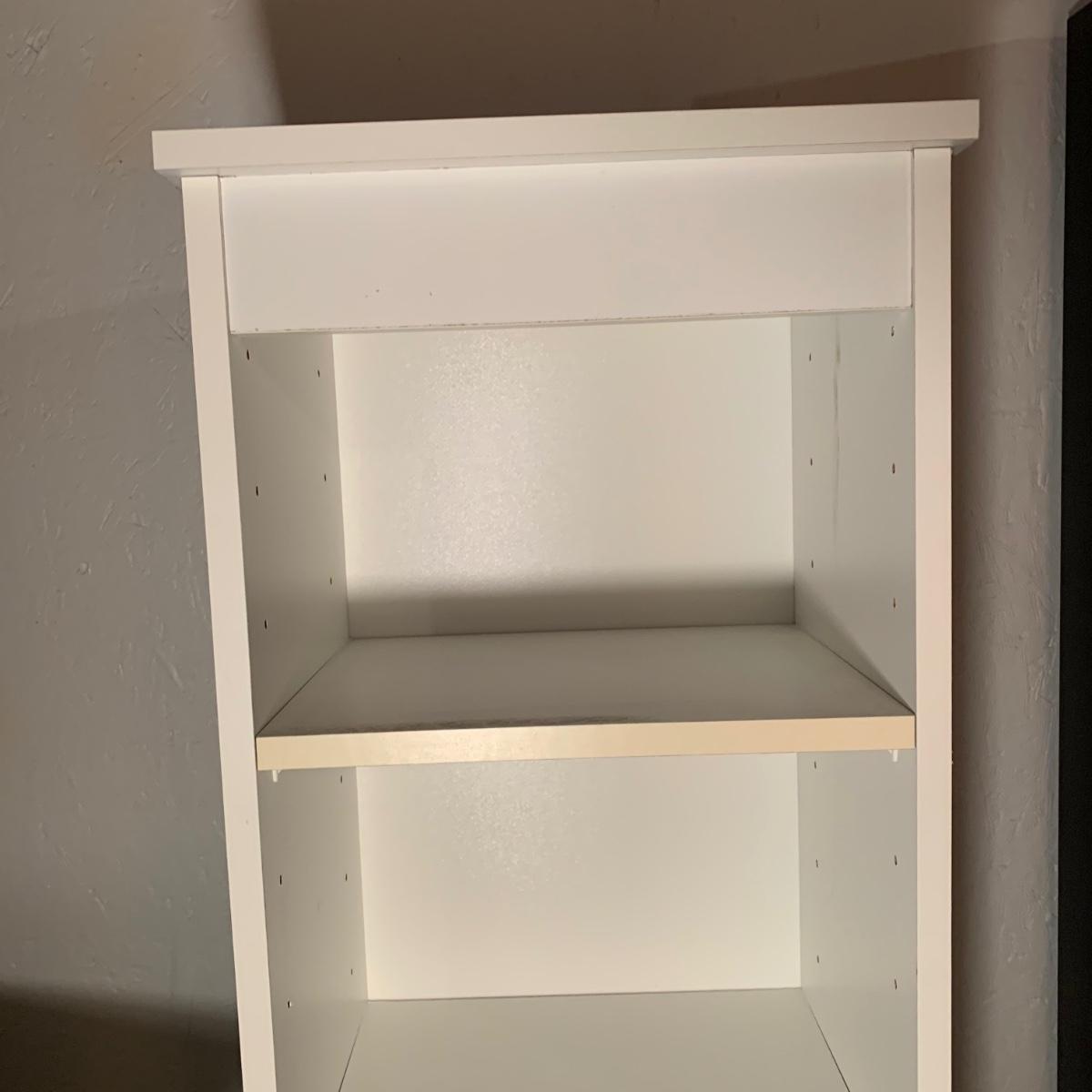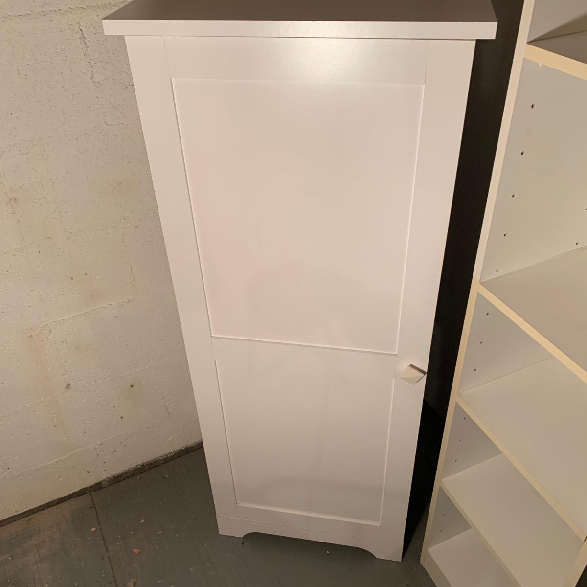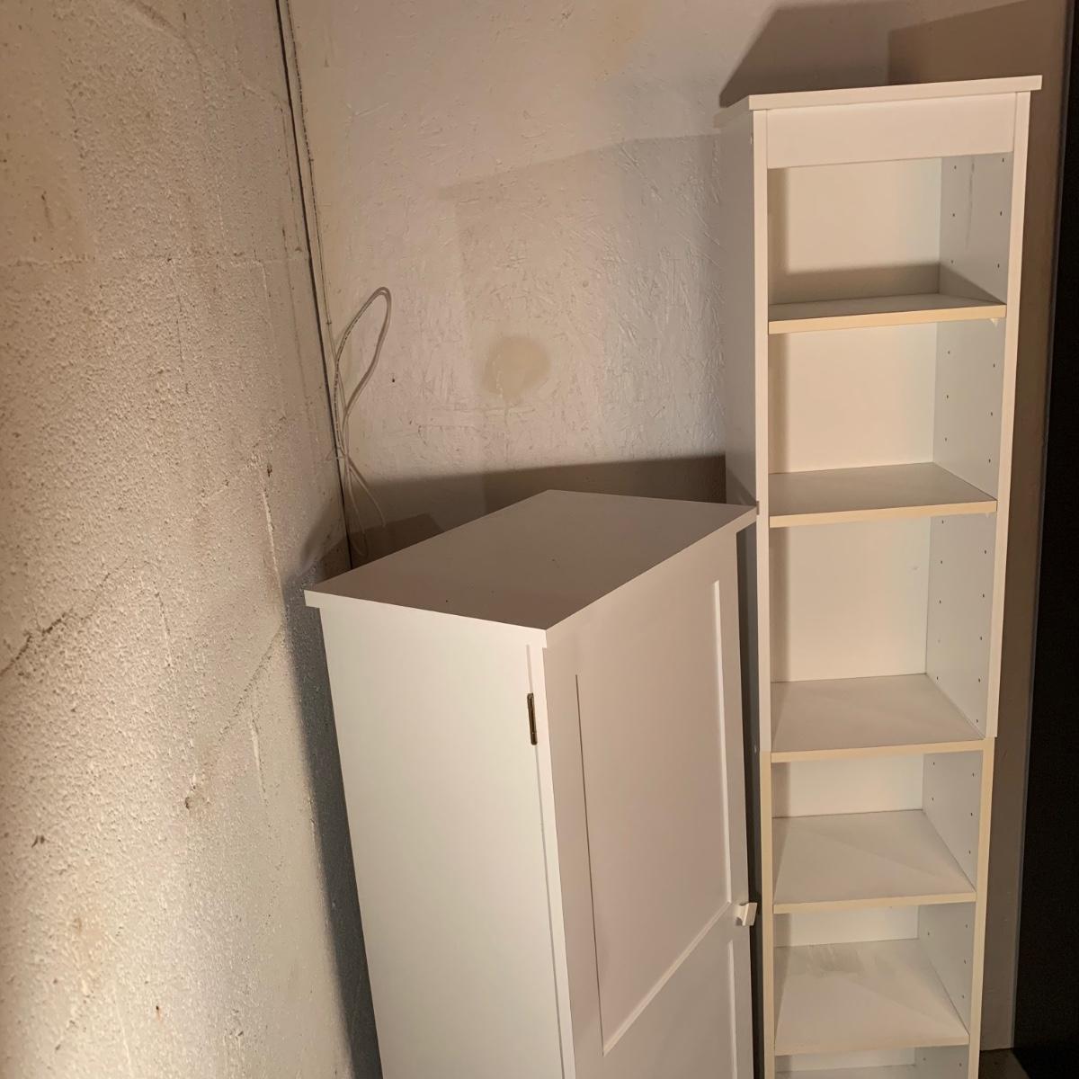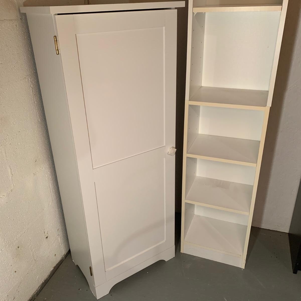 Two units made of engineered wood. Tallest item measures approximately, 14” x 10” x 68”H and has six shelves. Cabinet measures approximately, 13” x 19.5” x 48”H and features four shelves.