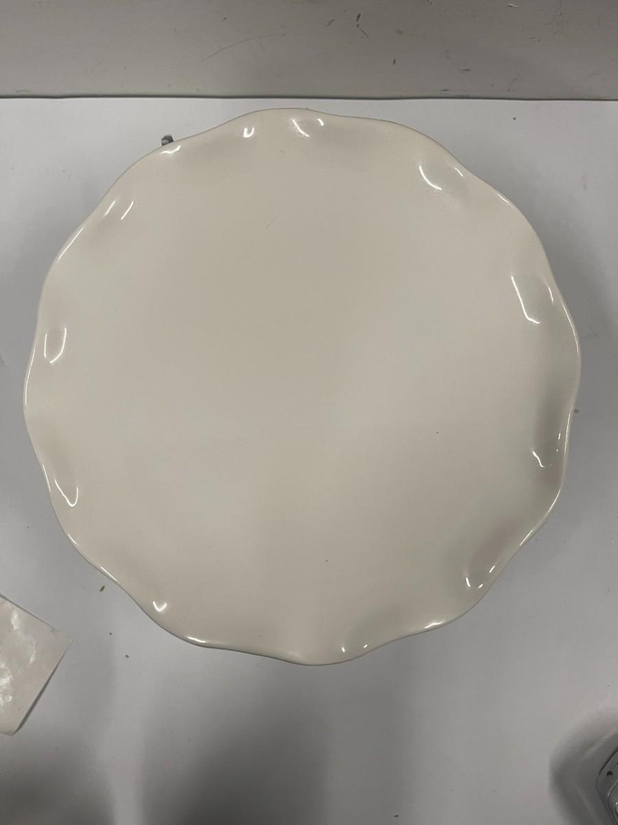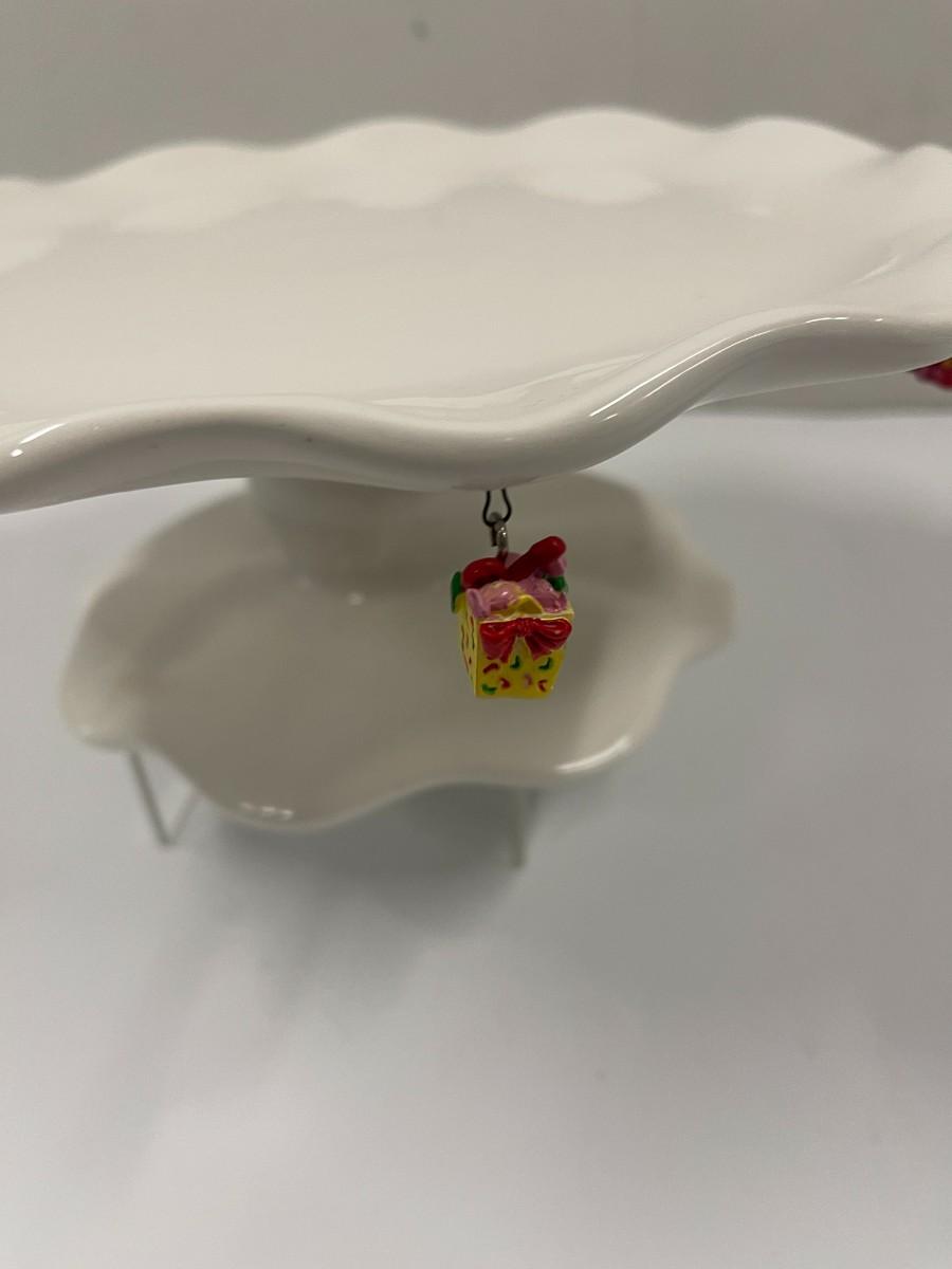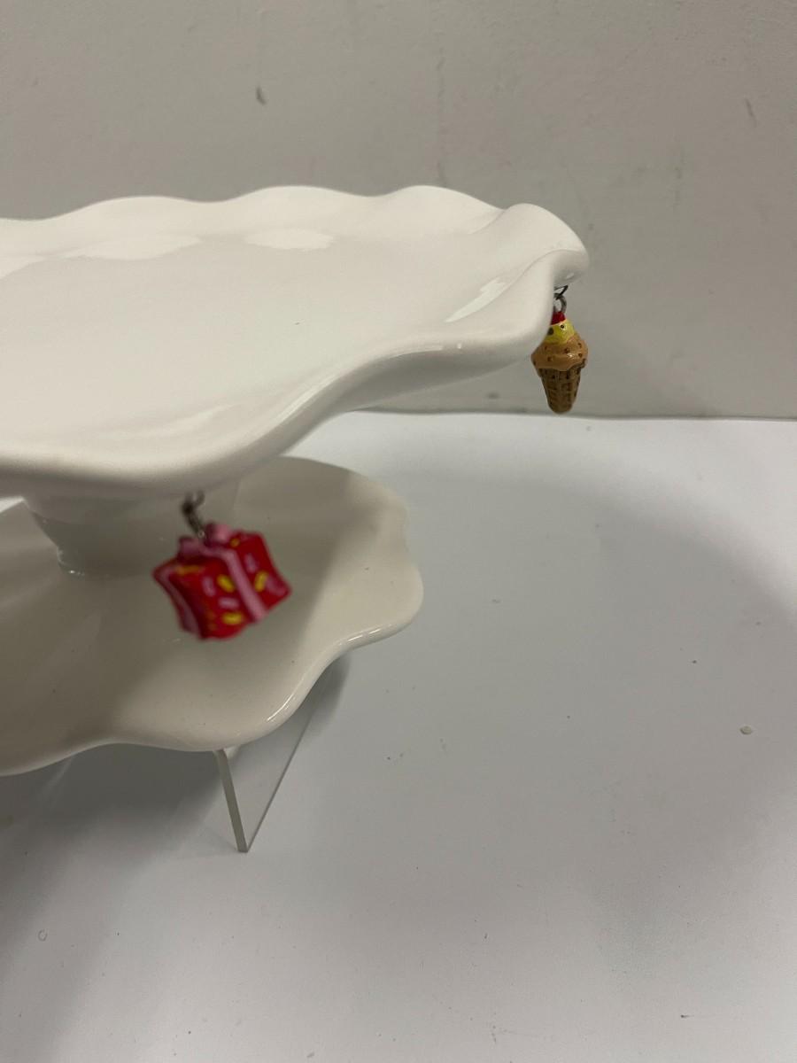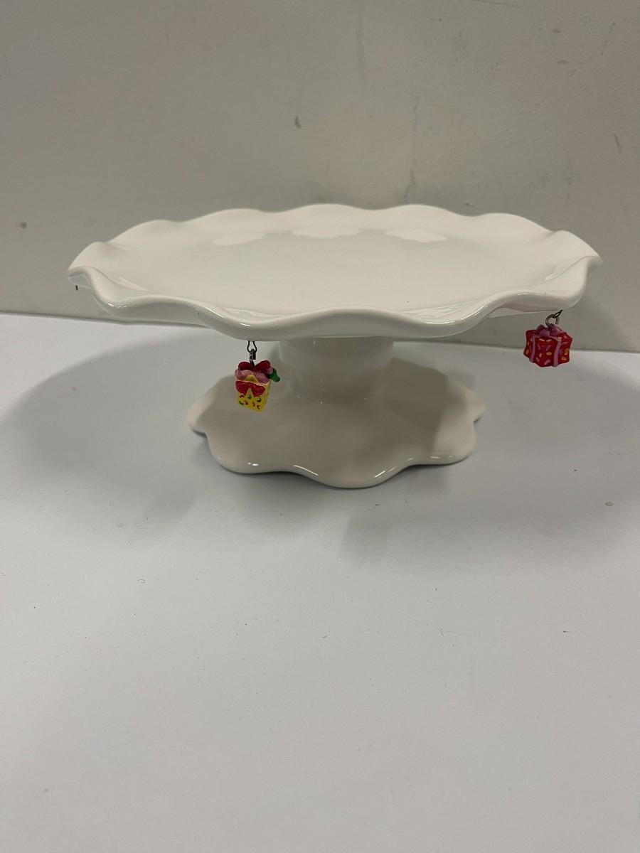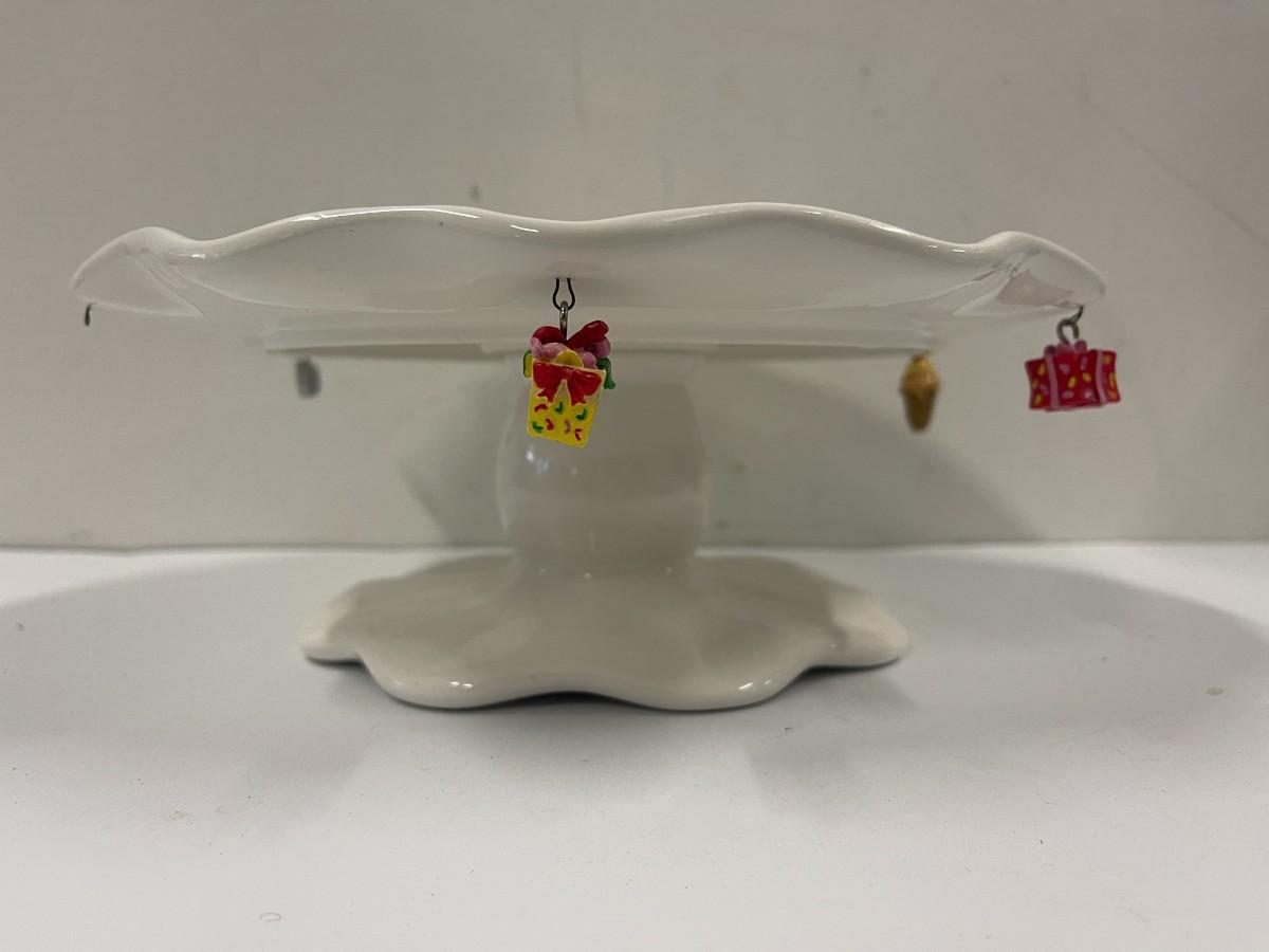White cake plate with 6 hanging charms. Excellent condition. 10"